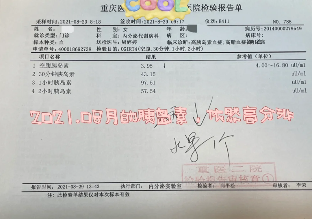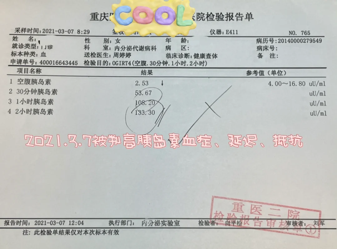 2021年3.7,低碳饮食七个月、生酮饮食三个月的我,查胰岛素和糖耐,被判二糖,合并四高,糖耐和胰岛素检查结果见图三图四。