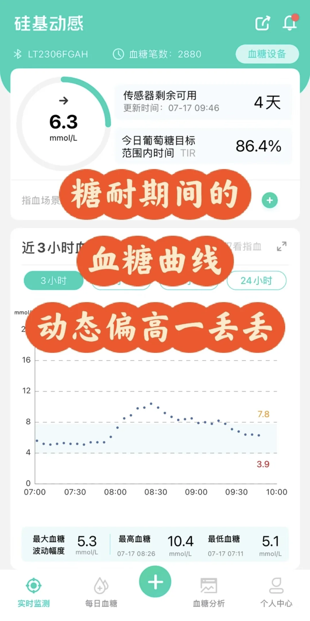 动态血糖去曲线里面能看到,餐四十分钟到达峰值,动态峰值读数10.4(读数偏高0.6左右,查血是固定时间点,没有查到餐40分钟的峰值血糖)。