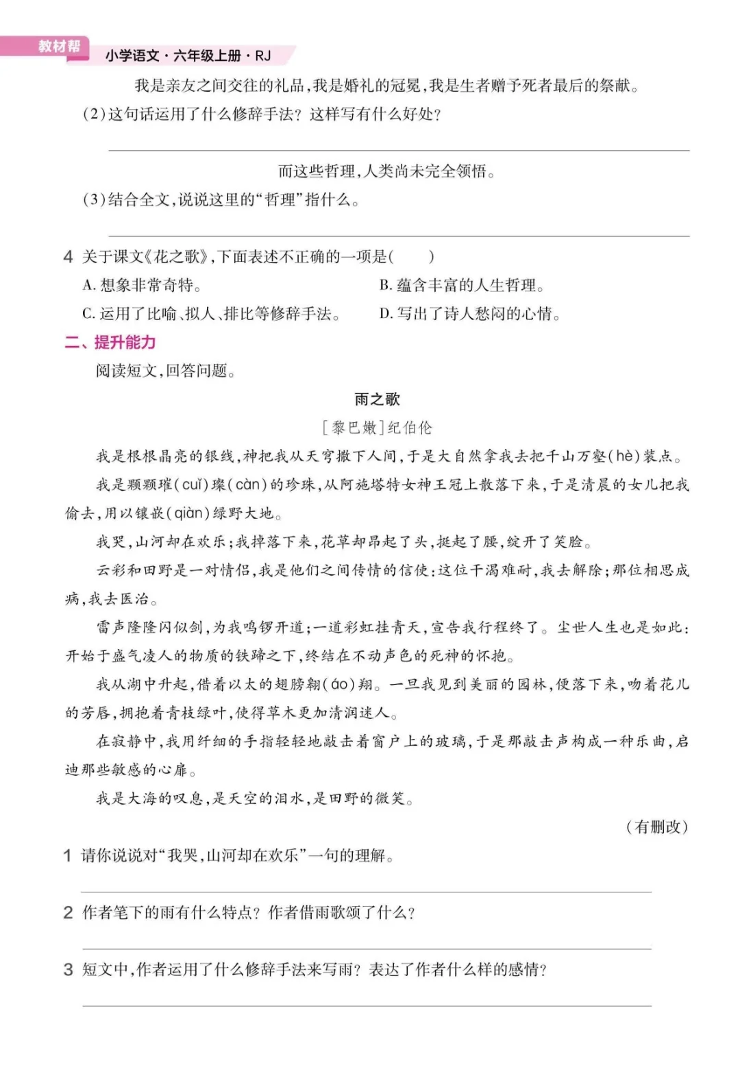 《花之歌》选自《泪与笑•组歌》,《组歌》共有五首:《浪之歌》《雨之歌》《美之歌》《花之歌》和《幸福之歌》。在纪伯伦短暂的生命旅途中,他饱受颠沛流离、痛失亲人、疾病煎熬等苦难。当感到死神将要降临时,他决心将自己的生命之火燃烧得更加光耀,不顾病痛,终日伏案,直到去世。他常在诗歌里表达对祖国、对理想的依恋,《组歌》便是这类诗歌的代表作之一。