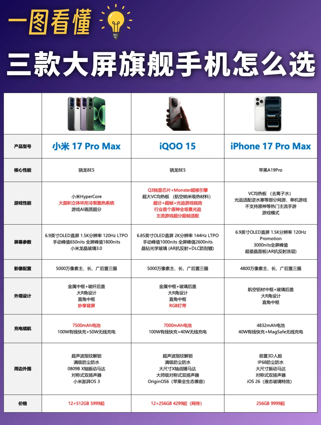 目前小米和苹果都已经公布价格了,分别是5999起和9999起,iQOO 15等到下月也会发布,我盲猜要4299或4399起,大家可以一起蹲蹲看。