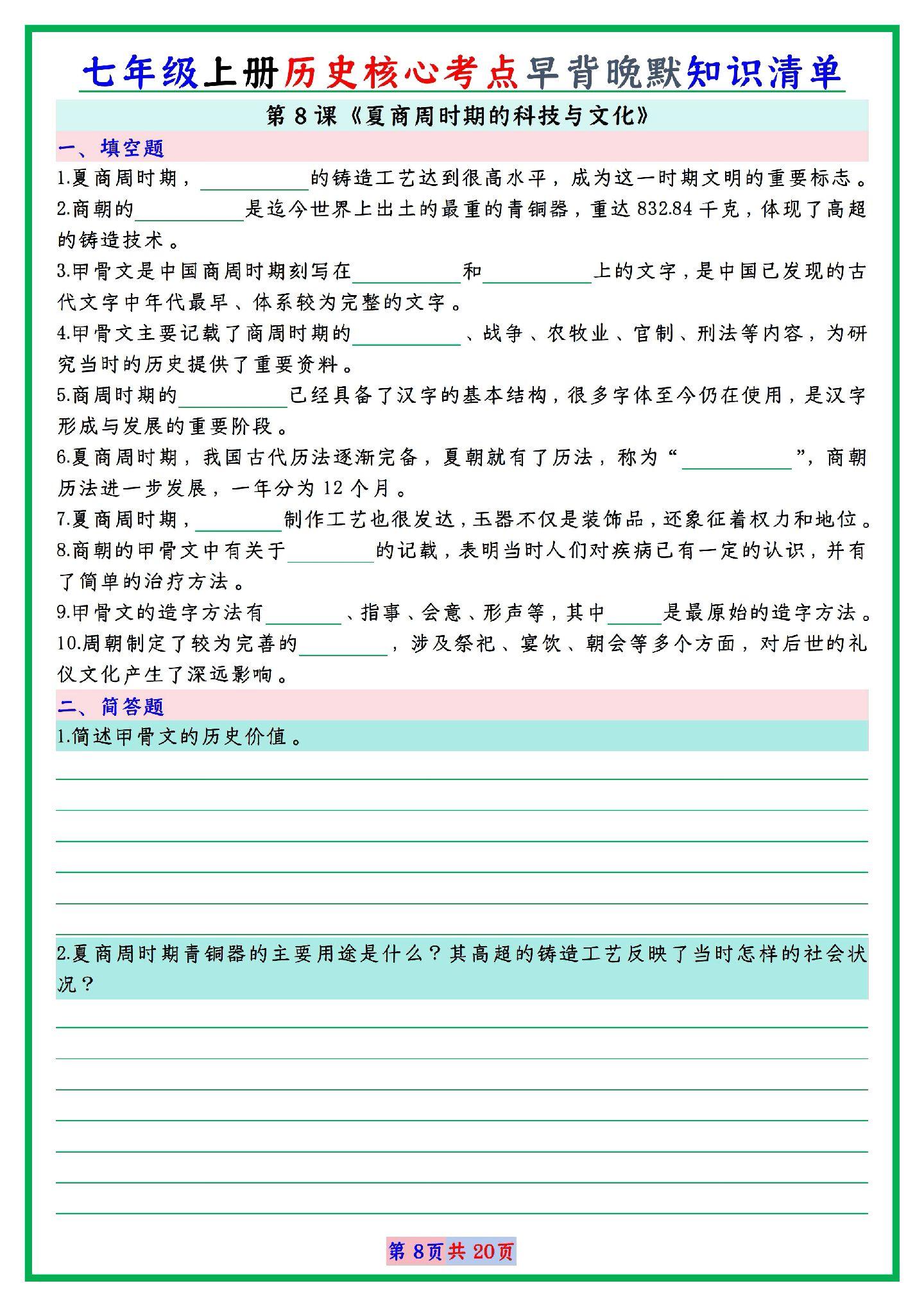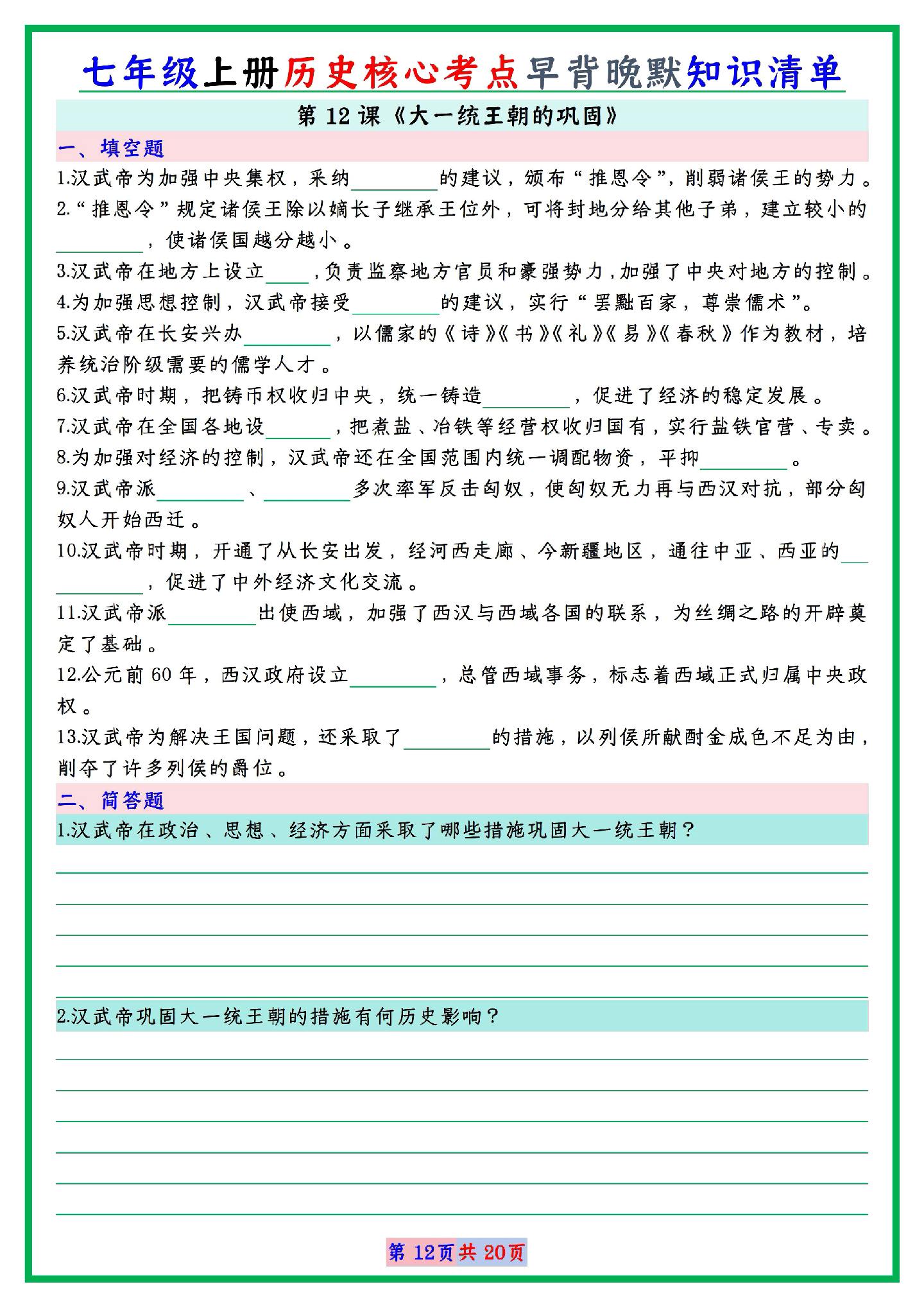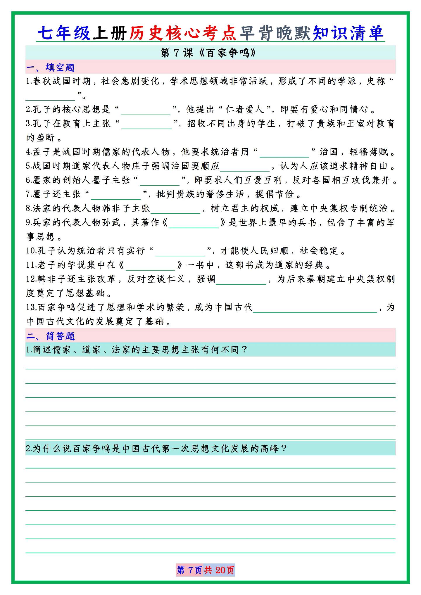 七年级上册历史:核心考点早背晚默知识清单(填空版),是孩子在新学期查漏补缺的好帮手,抓紧时间收藏起来吧!