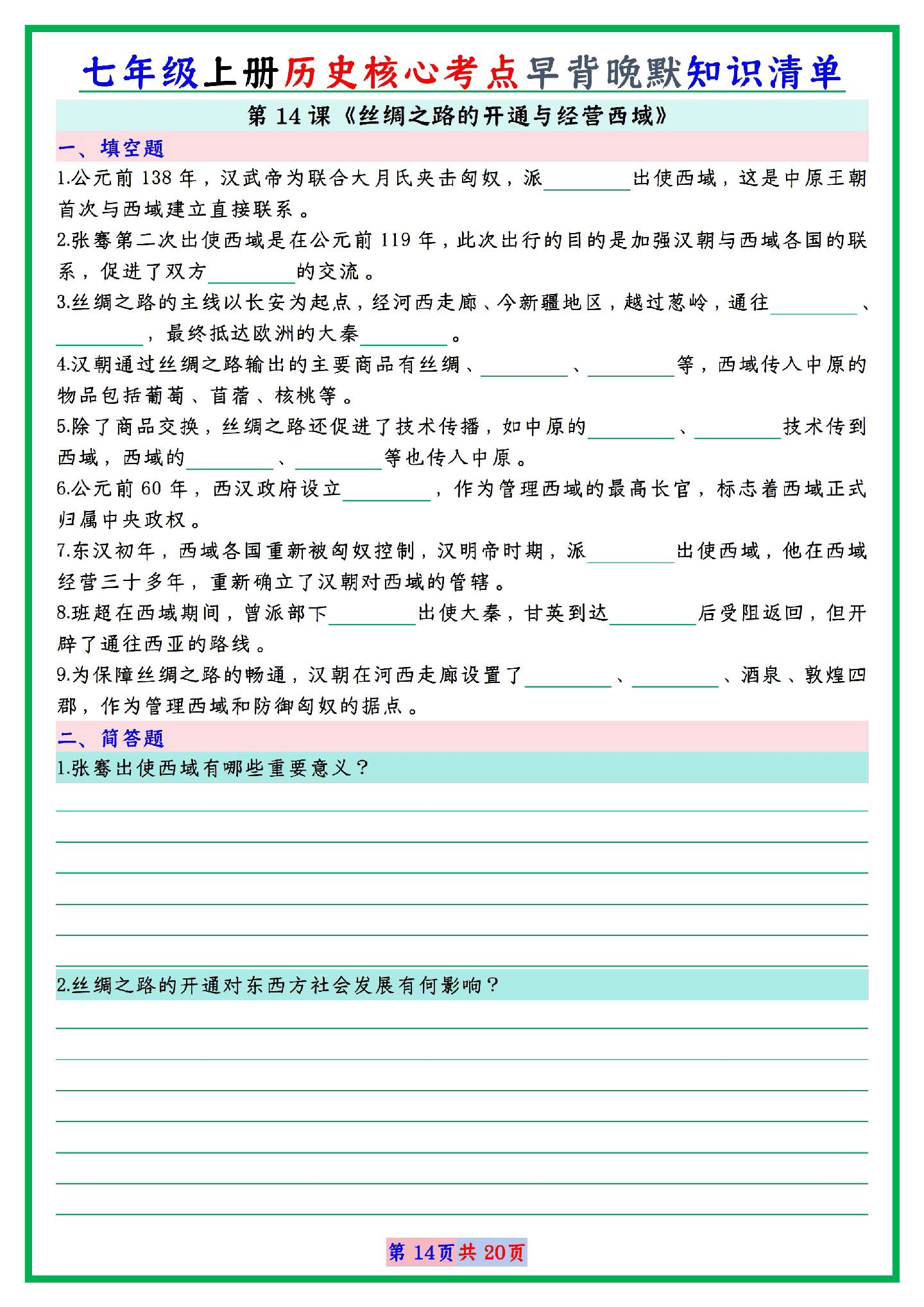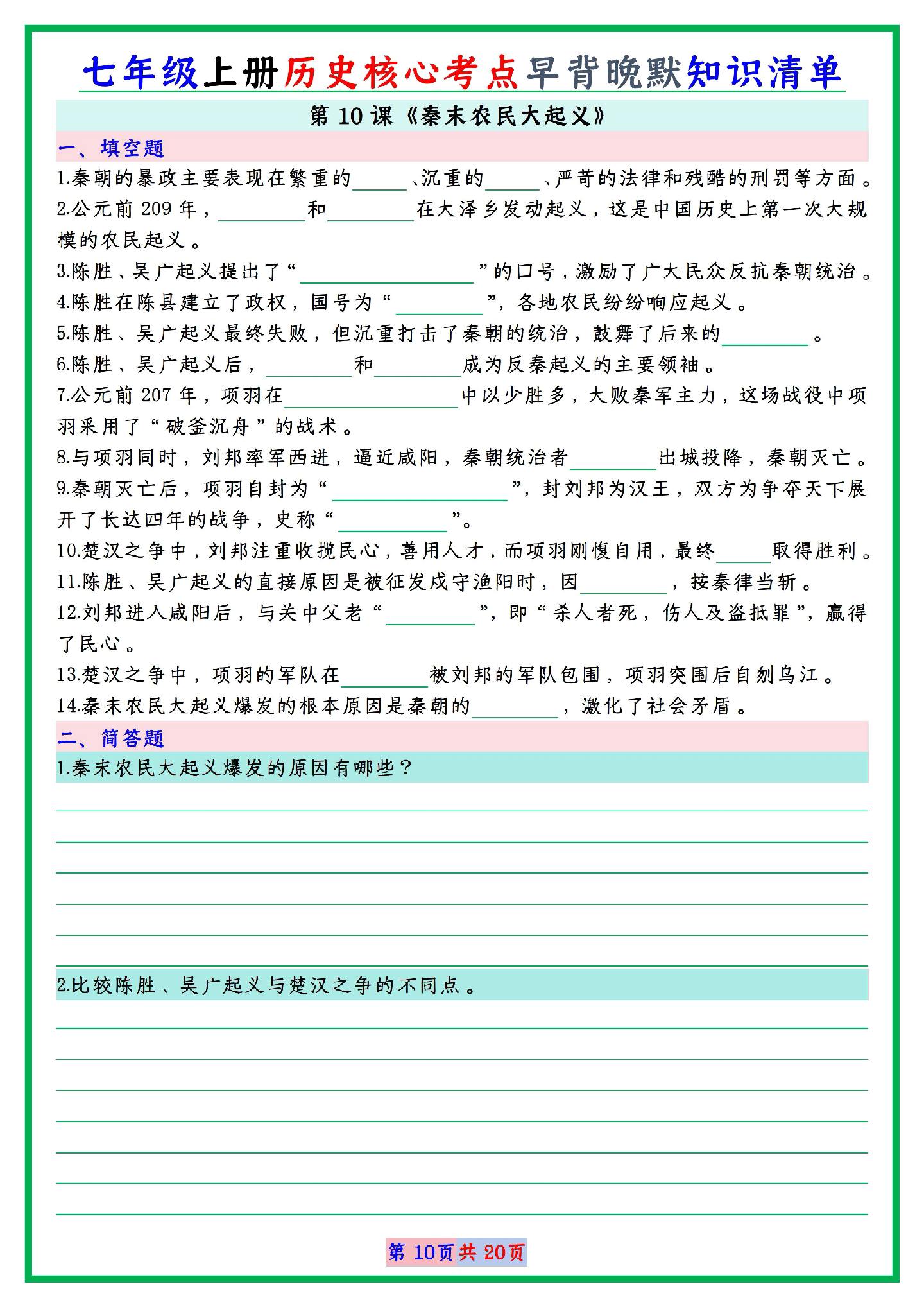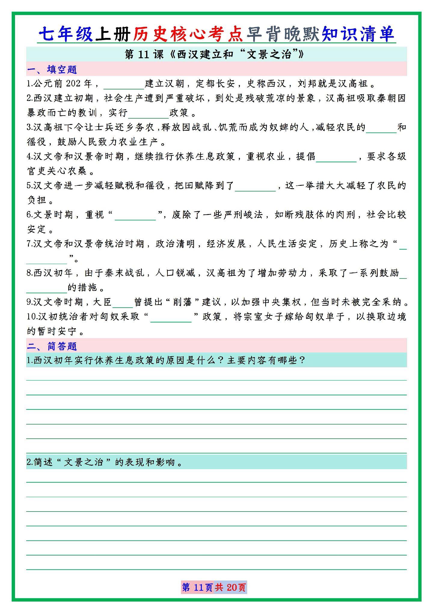 七年级上册历史:核心考点早背晚默知识清单(填空版),是孩子在新学期查漏补缺的好帮手,抓紧时间收藏起来吧!