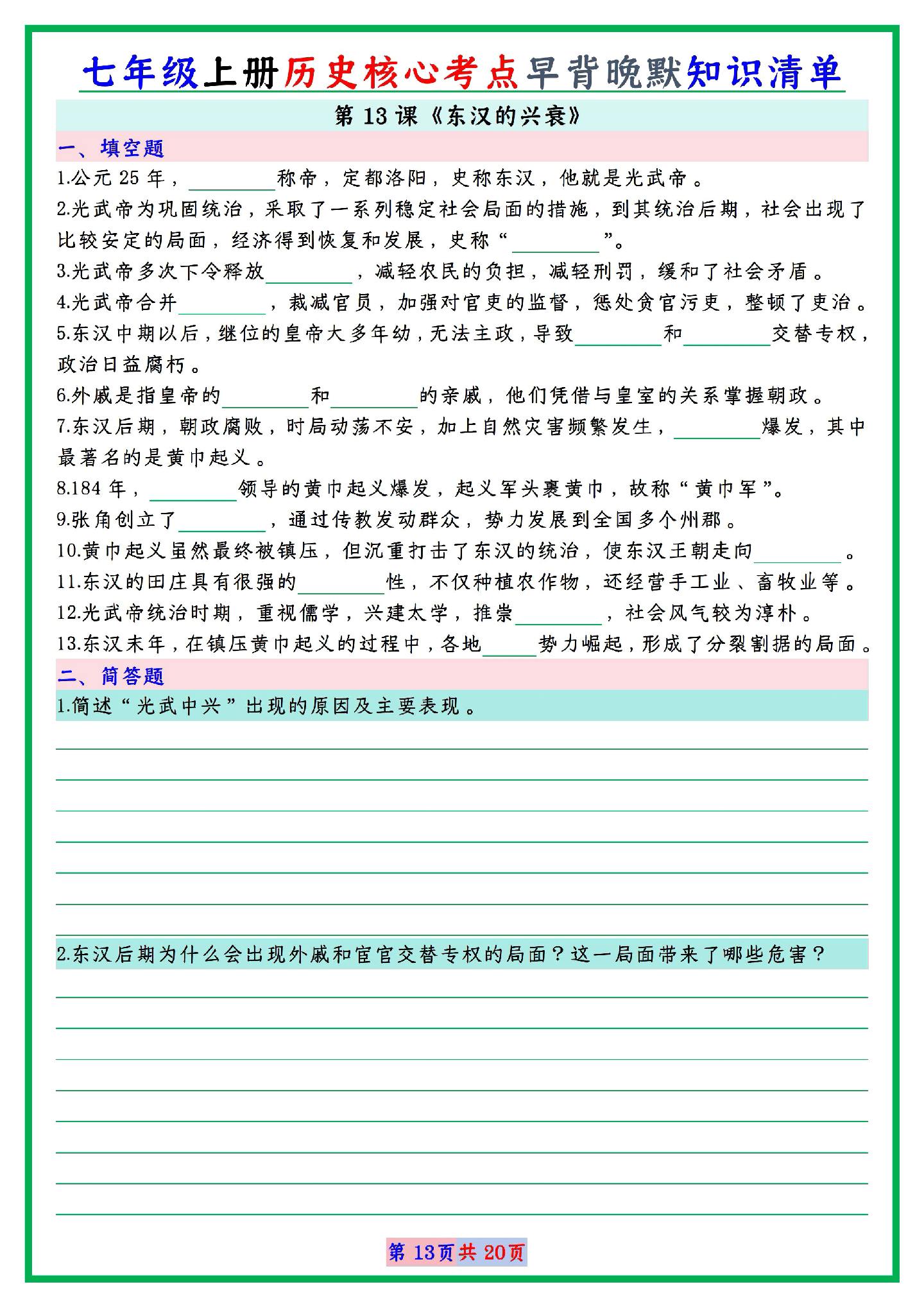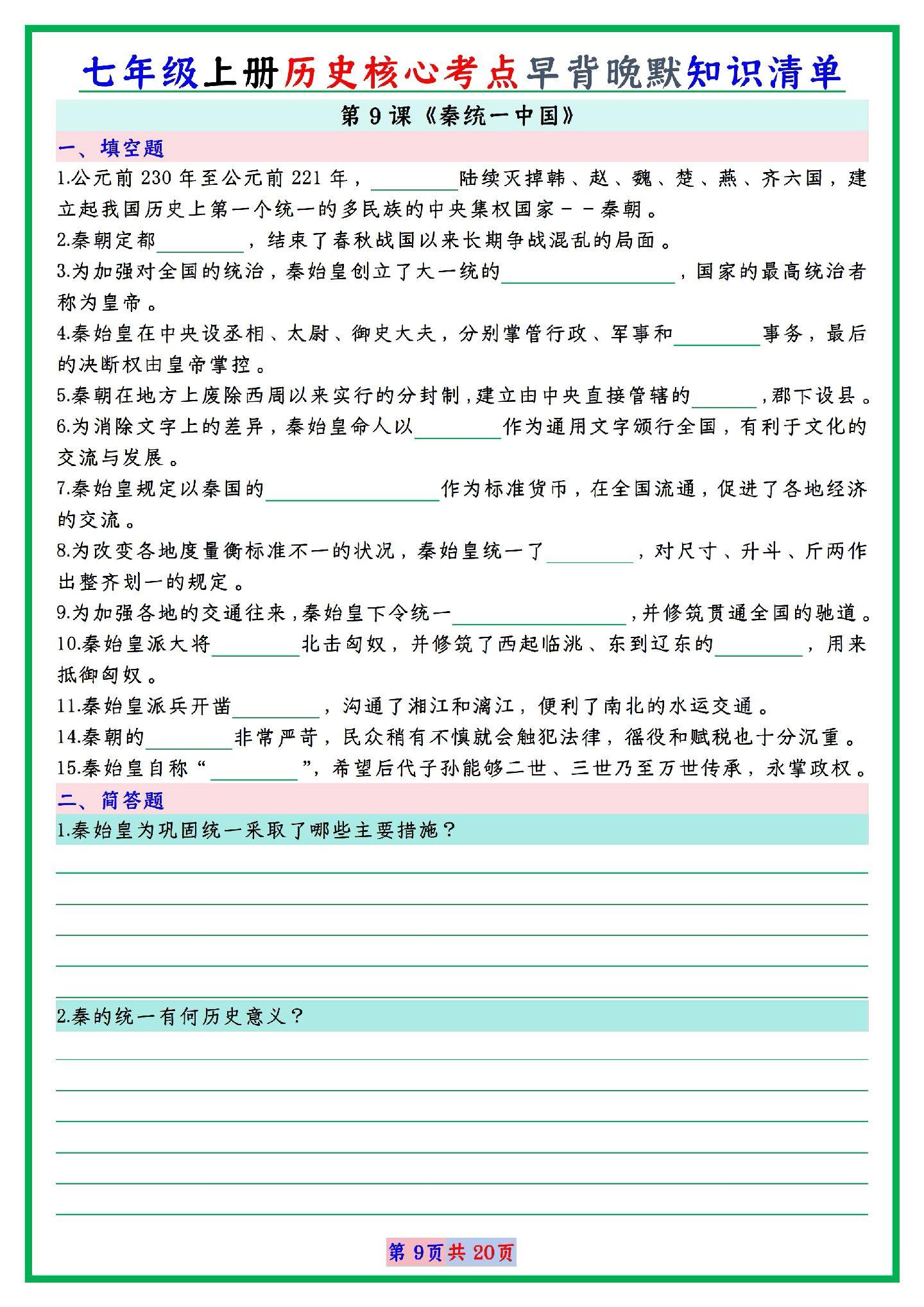 七年级上册历史:核心考点早背晚默知识清单(填空版),是孩子在新学期查漏...