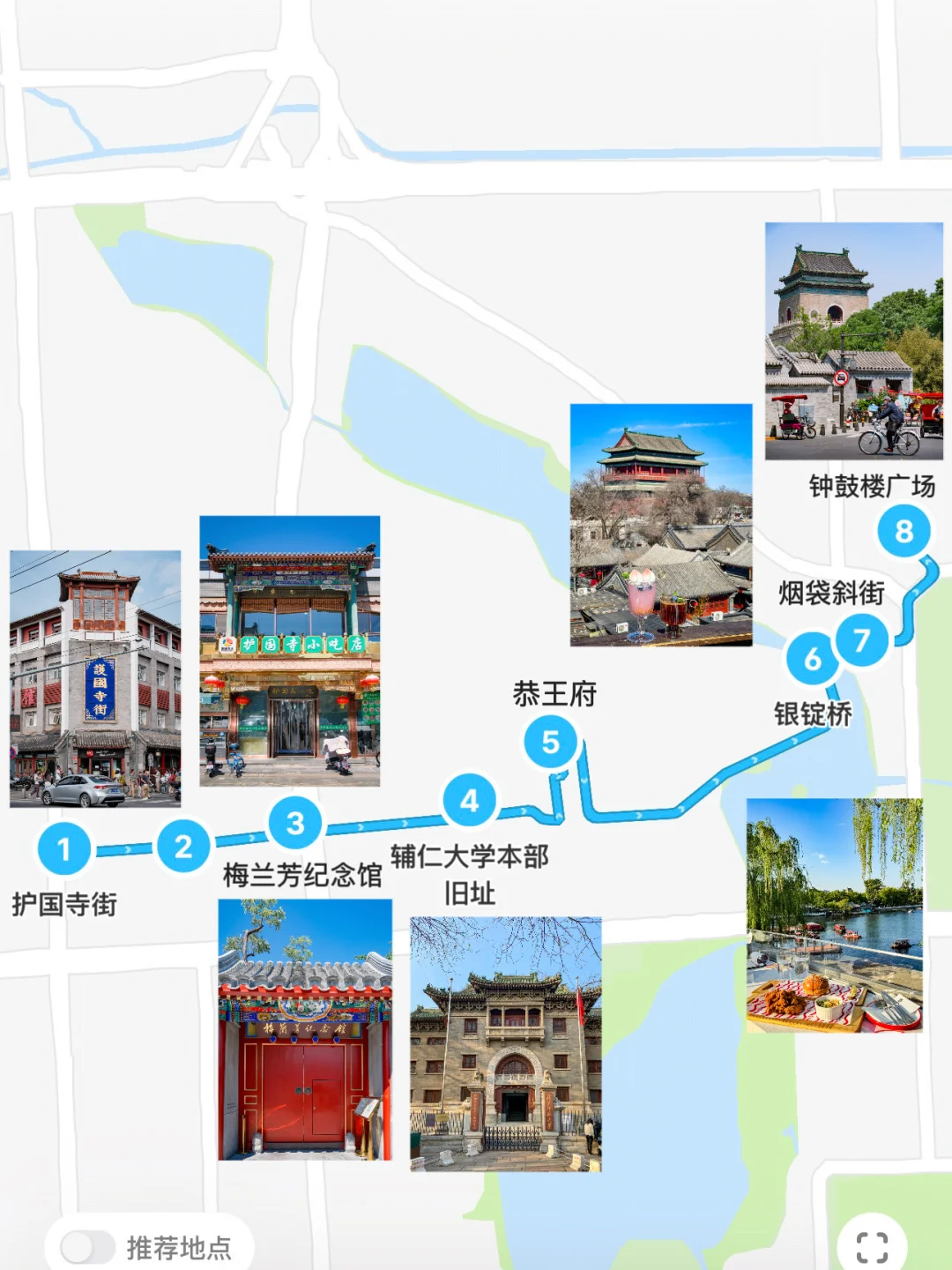 护国寺街 ➡️梅兰芳纪念馆➡️辅仁大学旧址➡️恭王府➡️银锭桥➡️鼓楼