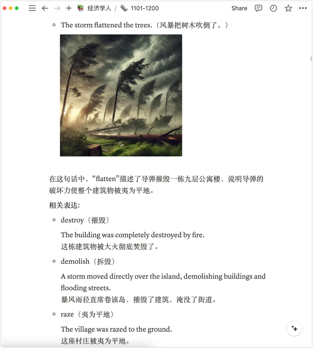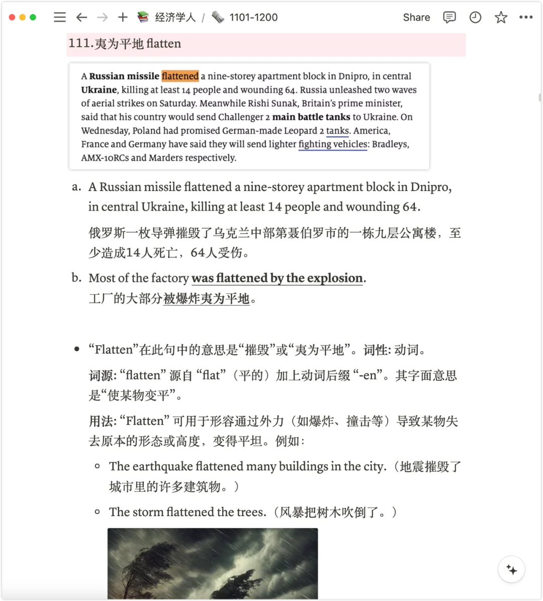 📰 学会翻译: 1. 夷为平地 flatten 2. 风暴把树木吹倒了 The storm flattened the trees. 3. 逃窜 on the run 4. 结束 wrap up 5. 慰藉 bring solace to 6. 坏账 bad loans 7. 名列前茅 come out on top 8. 担心 stoke fears 9. 增加担忧 increase concerns 10. 推波助澜 stoke the crisis ✏️  外刊专题·经济学人地道表达