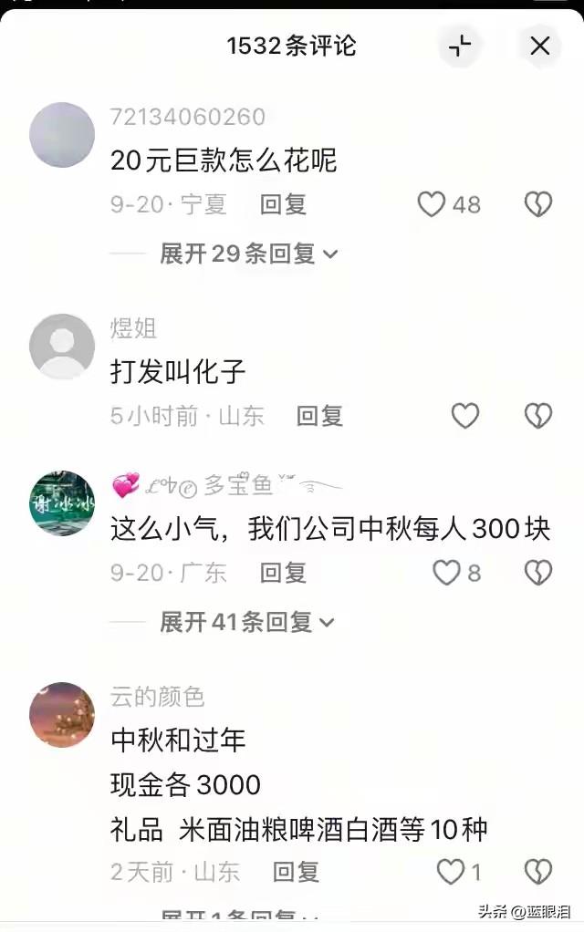 看到东莞一家企业发中秋节福利20元/人,有网友评论说打发叫化子吗?这20元巨款怎