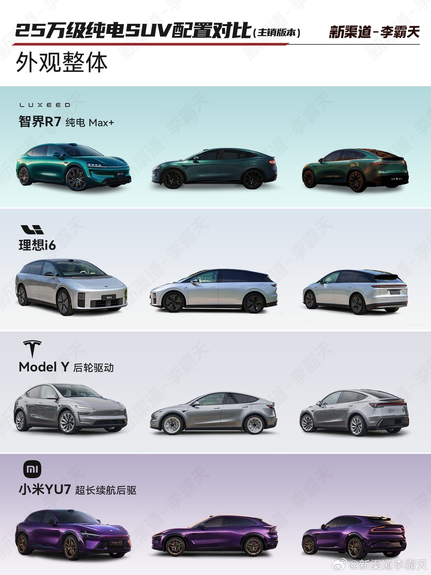 理想 i6 上市后,25 万级别纯电 SUV 市场的竞争越发激烈,我们将市面上几款热门车型进行了对比:智界R7、理想i6、特斯拉Model Y、小米YU7
