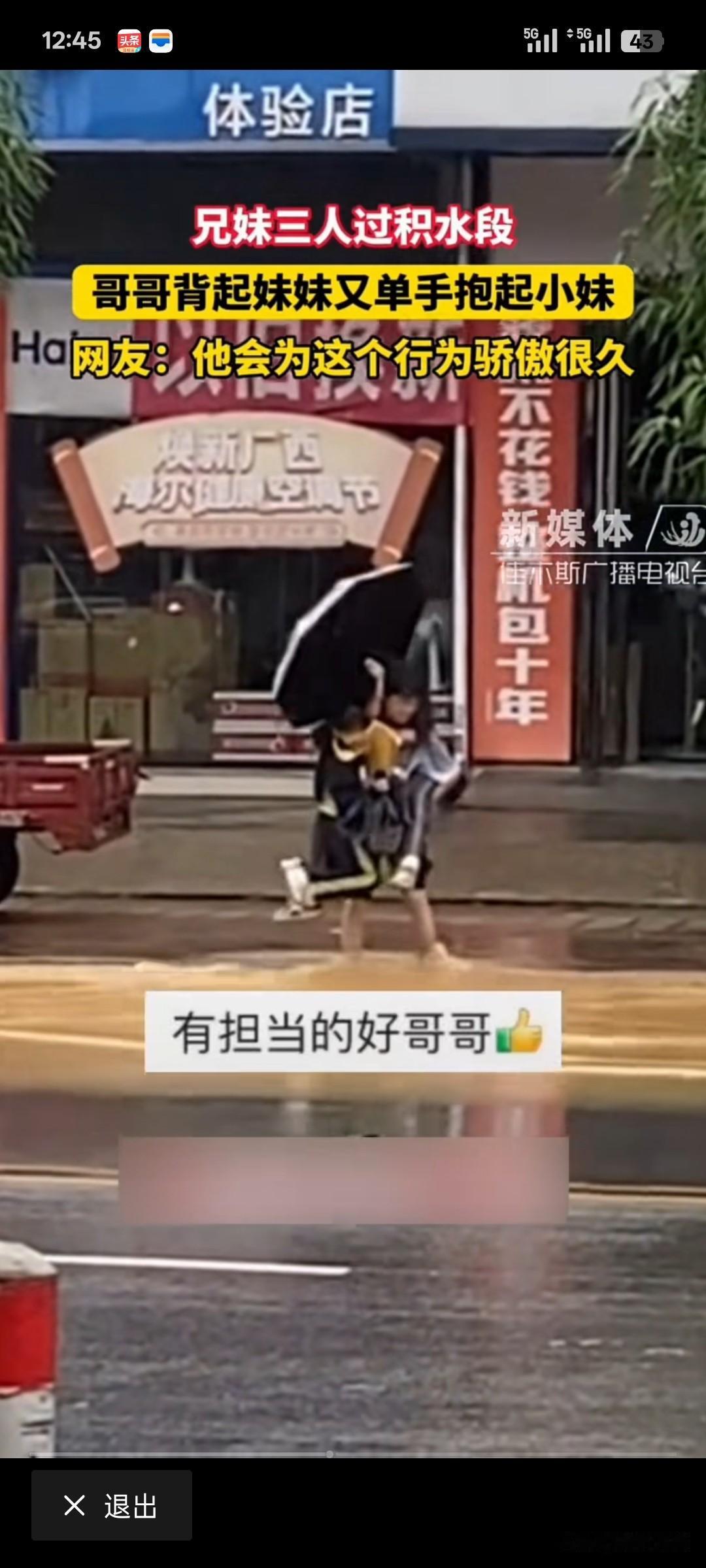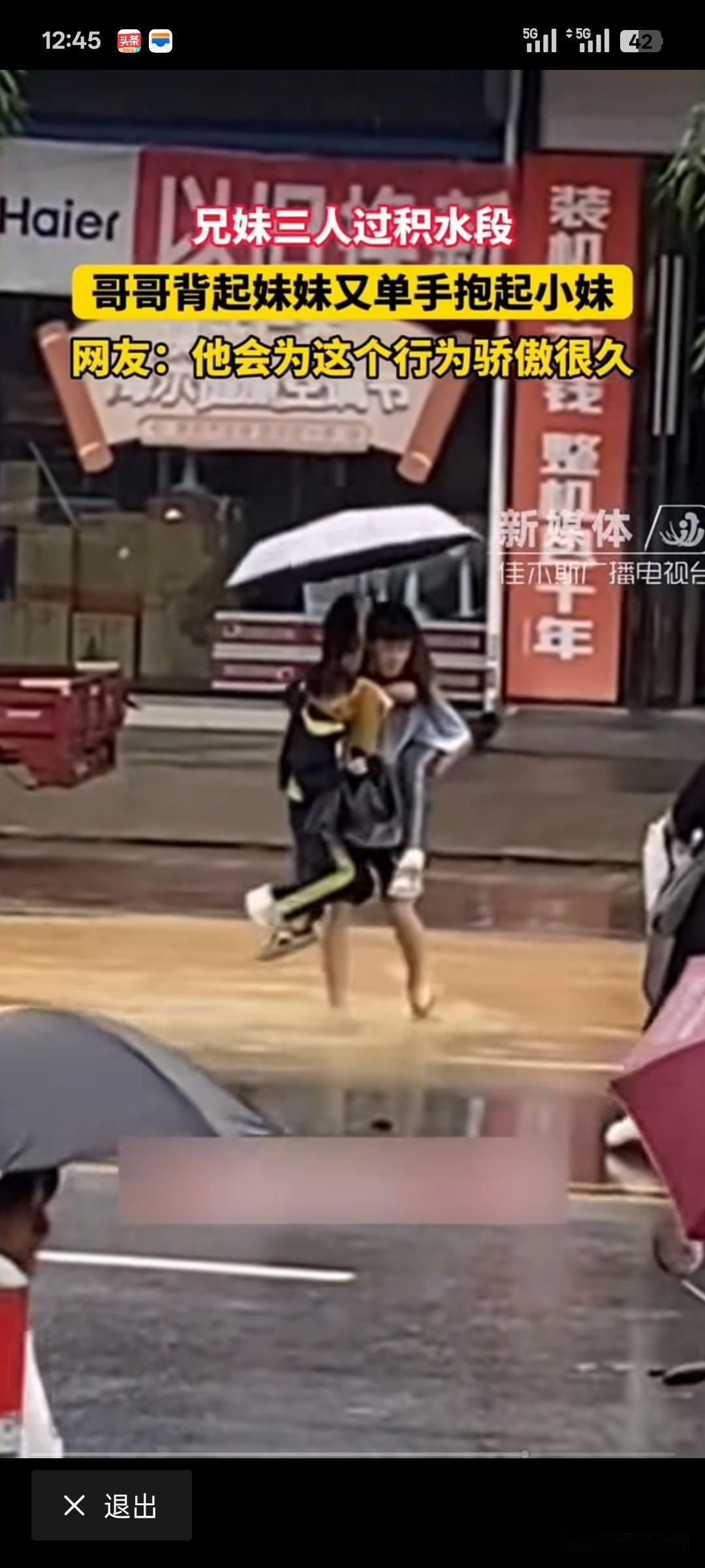 三兄妹过积水路段, 羡慕哭了好多独生女, 直言自己也想要有这样的一个哥哥, 长兄