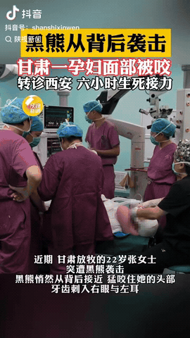 甘肃,一22岁孕妇放牧时,不料被黑熊从背后偷袭,导致面部被咬,在这危急时刻,她灵机一动想出一个办法,躲过一劫,最后回到家,她丈夫送她去医院,经过医生6小时的生死接力,终于脱离生命危险。 信息来源:陕视新闻 9月7日下午,张女士带着肚子里14周的宝宝,像往常一样到山里放羊。 那天山间风轻,鸟也少叫。 谁料一头黑熊像鬼影一样悄悄绕过来,张女士都没反应过来,就被咬住了脑袋。 瞬间鲜血直流,右眼球被崩出来,左耳也撕得稀烂,鼻子、颧骨都碎了。 她疼得直冒冷汗,知道如果继续挣扎铁定被撕成碎片。 突然脑子里闪过一句“遇到熊就装死”。 张女士拼了命屏住呼吸,闭上眼,身体僵硬得像块木头。 黑熊还不死心,用爪子扒拉她的胳膊、衣服,好像要确认人到底活没活。 过了好一会儿,见她纹丝不动,竟然真的转身慢悠悠走了。 血淋淋的她咬着牙,一点一点爬回家。 她老公看见妻子躺在门口,吓得摔了钥匙,当场傻了眼。 见她浑身是血,根本顾不上胎儿,急忙扛她上车,先送到当地小医院。 小医院条件有限,开了几根输液管也止不住血,医生说要赶快转大医院。 于是,他们在漆黑的高速上狂飙了40个小时,跨过千里,到凌晨才摸到西安市人民医院急诊室。 医院连夜把眼科、耳鼻喉科、产科、麻醉科的医生都叫到手术室,来个多学科会诊。 张女士还是意识清楚,一边输血一边给医生写眼球还要放回去,一共输进了1400毫升血,做了眼球复位、面部清创缝合、骨折固定等十几项操作。 手术前医生还担心她肚子里的娃,但评估说14周麻醉风险可控,大家就火速开了刀。 刀起刀落足足6个小时,才算把她从死亡边缘拉回。 术后她被推进ICU,监护两天,生命体征终于稳定下来,9月18日,带着一身纱布和各种医嘱顺利出院。 现在张女士和宝宝平安无事,但右眼没了光感,左耳常年听不到声音,鼻子和颧骨还时不时隐隐作痛,脸上留了几道大疤。 医生说,还得定期去产检和复查骨骼情况,等伤口彻底恢复了,再安排整形和听力康复。 不少网友看完这事儿都惊掉下巴:“真是命大!” 也有人说,装死能用不代表千篇一律灵验,要看熊的状态:如果熊是抢食物、当成猎物吃,人装死估计也没辙。 这次纯属运气好,赶上了熊只是出于防御性攻击,才放过她。 其实现在正值9、10月秋季觅食高峰,山里野果子少了,熊都下山找东西吃,伤人事件频发。 所以通过这事给大家敲响警钟:如果经常山里放牧或者采蘑菇的朋友们,一定不能单独行动,尽量结伴出行,预防出事时有人一起帮忙解决问题。 如果遇到熊千万别尖叫跑,慢慢往后退,如果能带防熊喷雾更好,绝对不要爬树,黑熊爬树比你还溜。 所以我们在享受大自然的同时,一定要对它留点敬畏之心,别等到经历生死考验才后悔。 最后,希望大家引以为戒,不要抱有侥幸心理,希望大家出门都能安全回家,不要再出现类似的悲剧。