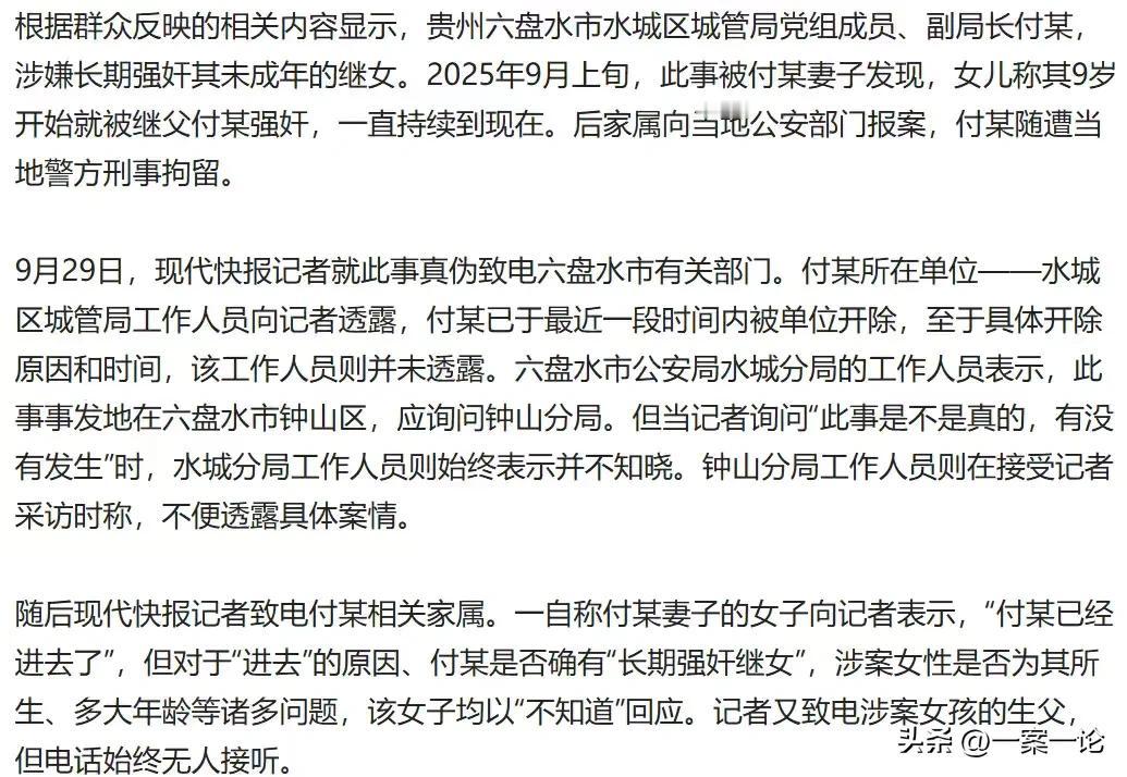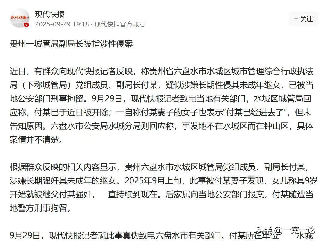 贵州六盘水,男子是一位城管局的副局长,但他却是一个人皮兽心的继父,竟然对9岁的继女动歪心思,从继女9岁到13岁,他一直持续侵犯,直到继女忍无可忍地告诉自己的母亲,母亲这才赶紧报了警。 2025年9月上旬,一位母亲突然听到女儿说,继父一直有侵犯她,从9岁开始一直到现在。 这位母亲听到女儿哽咽地说出这个秘密,她吓了一大跳,既而又气得手都要抖了,她从来没有想过,她的丈夫竟然是这么一个人,一个与她同床共枕的人,竟然会对一个少女动手,还是她的女儿。 即使她的女儿并不是丈夫的亲生女儿,但她的女儿也是喊了他好几年的爸爸,法律上他也是一个父亲,她无法想象,一个继父怎么可以对一个9岁的继女动歪心思,并且还侵犯继女。 她当初可是看中了丈夫的人品,才选择和他再婚的,毕竟丈夫是一个城管局的副局长,也算是有头有脸,有面子的人, 她当时觉得丈夫肯定是有过人的能力,有让人敬佩的人品,他才能一步步上升,成为一个副局长的。 如今看来,和她同床共枕的丈夫,不过是一个道貌岸然的伪君子,他满心的龌龊。 她看着女儿,一开始的时候,她还想说服自己,跟自己说,这一切会不会不是事实,但她看着女儿,早已哭成泪人,她知道事实就摆在眼前,女儿说的就是她的遭遇。 她看着女儿,才13岁,正是一朵花绽放的年龄,但她的身体已经被继父摧残了。 她无法想象女儿这几年是怎么过来的,9岁到13岁,足足4年长的时间,对于一个少女来说,或许一开始的时候,她还不知道是怎么回事,但随着年龄增大,她肯定知道是怎么一回事的。 她想象着女儿这些年,该是多么的害怕,面对这样如虎的继父,她不但感受不到半点父爱,还要恐惧地面对他,孩子这几年的成长,真的是让这位母亲无法想象。 她也恨自己,4年了,要是她早一点发现这件事,她还能陪女儿早点忘记这些伤害 。 她也恨自己,没有给女儿更多的关爱,以至于女儿受到这些伤害,都没有早一点告诉她。 可这一切都无济于事了,女儿的伤害已经发生了,不但女儿的身体被摧残了,女儿的心灵的创伤,更是一辈子都无法治愈了。 眼下她能做的,除了报警,让自己的丈夫受到应有的惩罚,她都不知道该如何面对女儿了。 她甚至懊悔,当初就不应该再婚,好好把女儿带大,女儿也不至于受到继父的伤害。 如今不但女儿受到伤害,她的婚姻恐怕也该结束了,毕竟发生这样的事情,她无法将女儿置之不顾,她也无法当什么事都没有发生过一样,她不能等丈夫出来,与他共度余生了。 如今,她看着女儿,只想让丈夫受到法律的制裁,而她余下的时间,只能陪女儿慢慢疗伤了。 现在她的丈夫已经被开除了,也被送进去了,但她与女儿的路还漫长,她和女儿要面对的,是心灵上的伤害。 那么该如何认定这样的事呢? 显然发生这样的事,继父的行为已经构成了强奸罪。 《刑法》第236条规定:以暴力、胁迫或者其他手段强奸妇女的,处三年以上十年以下有期徒刑。 奸淫不满十四周岁的幼女的,以强奸论,从重处罚。 强奸妇女、奸淫幼女,有下列情形之一的,处十年以上有期徒刑、无期徒刑或者死刑: (一)强奸妇女、奸淫幼女情节恶劣的; (二)强奸妇女、奸淫幼女多人的; (三)在公共场所当众强奸妇女、奸淫幼女的; (四)二人以上轮奸的; (五)奸淫不满十周岁的幼女或者造成幼女伤害的; (六)致使被害人重伤、死亡或者造成其他严重后果的。 作为一个继父,他本身就是继女的父亲,即使不是亲生的,但如果他真诚对待继女,继女长大了,也同样会赡养他,现在这个继父不但被开除了,还将面对至少十年以上的有期徒刑。 有这样的继父,肯定是无法建立优良的家风的。 《民法典》第1043条规定:家庭应当树立优良家风,弘扬家庭美德,重视家庭文明建设。夫妻应当互相忠实,互相尊重,互相关爱;家庭成员间应当敬老爱幼,互相帮助,维护平等、和睦、文明的婚姻家庭关系。 发生这样的事情,女孩的母亲,如果还能心平气和地和这样的丈夫相处,那就算不可理喻的事情了。 因此发生这样的事情,女孩母亲的婚姻将会面临破裂,这样的事情也会给女孩和母亲带来心灵的创伤。 那么你对这个起继父的行为有何看法呢?