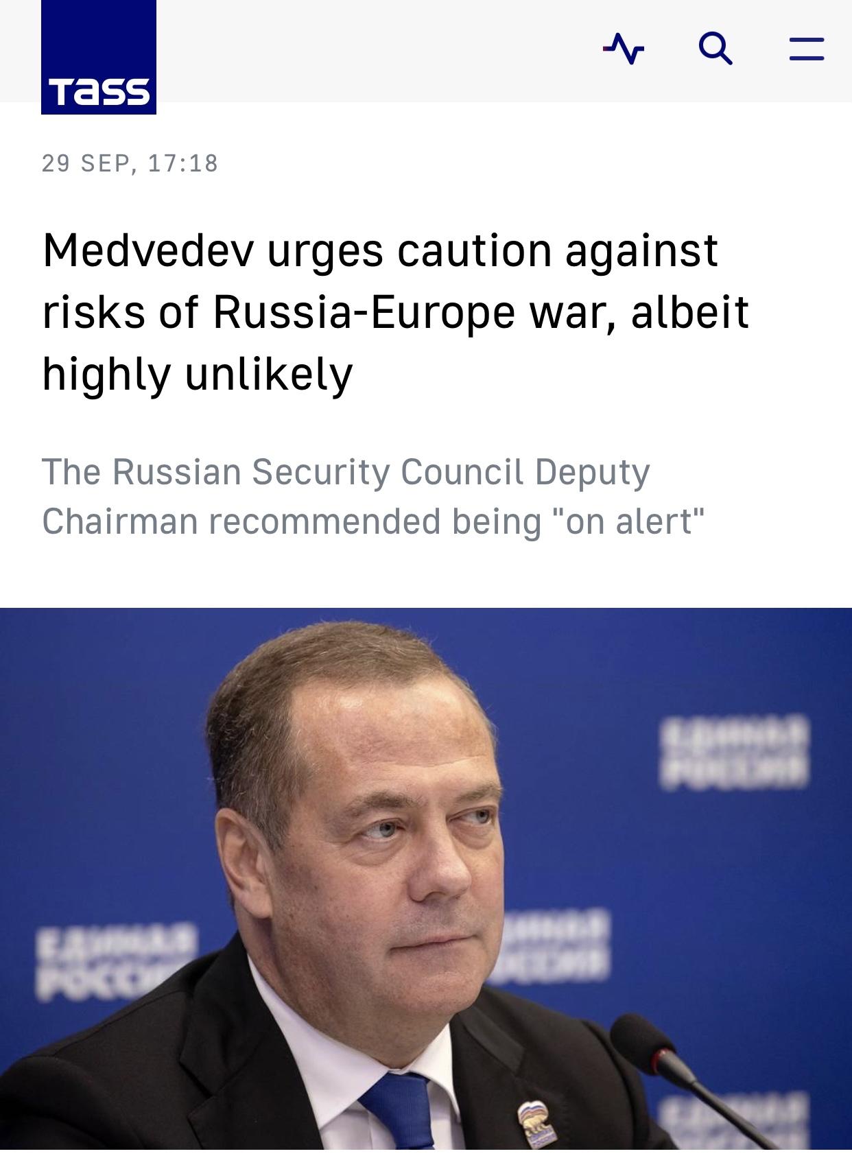 塔斯社:梅德韦杰夫强调”俄罗斯与欧洲国家间爆发战争的可能性始终存在” 塔斯社9月29日莫斯科电:俄罗斯安全委员会副主席德米特里·梅德韦杰夫在其电讯平台上写道,尽管俄罗斯和欧洲之间不太可能发生战争,但俄罗斯仍应保持警惕。 “未来五年与俄罗斯发生战争的情景在欧洲的每个报摊上都被兜售给人们。这是不可能的,”这位政治家写道,但续说“发生致命事故的可能性始终存在”,因此,他建议“保持警惕”(“Scenarios of a war with Russia in the next five years are peddled to people from every newsstand in Europe. It just cannot be,” the politician wrote, adding that “the likelihood of a fatal accident happening always exists.” So, he recommended being “on alert.”)。 报道说,这位俄罗斯高级安全官员总结道:“这样的冲突,充满了升级为使用大规模杀伤性武器的战争的绝对真实风险”。 电文的原标题是《Medvedev urges caution against risks of Russia-Europe war, albeit highly unlikely》(梅德韦杰夫呼吁谨慎对待俄欧战争的风险,尽管这种可能性极低)。