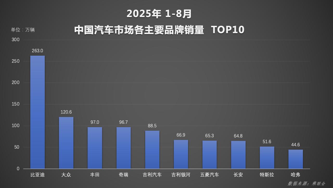 马上9月就要过去了,我们来回顾一下1-8 月的数据。前8个月中国乘用车新能源渗透率 55.3%,自主品牌份额 64%。比亚迪此间销量达 286.4 万辆,同比增 23%,完成 460 万辆年度目标的 62%,稳居中国汽车集团新能源销量榜首;旗下王朝丨海洋单品牌 1-8 月累销 263 万辆,销量实现多维领跑。 技术是其核心支撑,年初发布的 “天神之眼” 辅助驾驶系统,搭载车型累计销量超 140 万辆,8 月该类车型国内销量占比 90%,日生成辅助驾驶数据里程超 8700 万公里,当月智能驾驶辅助车型销量 26.37 万辆,相当于行业第 2 至 10 名之和。灵鸢车载无人机系统、超级 e 平台等技术落地,汉 L、唐 L 等车型热销。 海外市场同样亮眼,1-8 月累计销量 63.07 万辆,同比增 135.7%,占总销量 22%;比亚迪还亮相德国慕尼黑车展,并宣布匈牙利工厂年内投产。