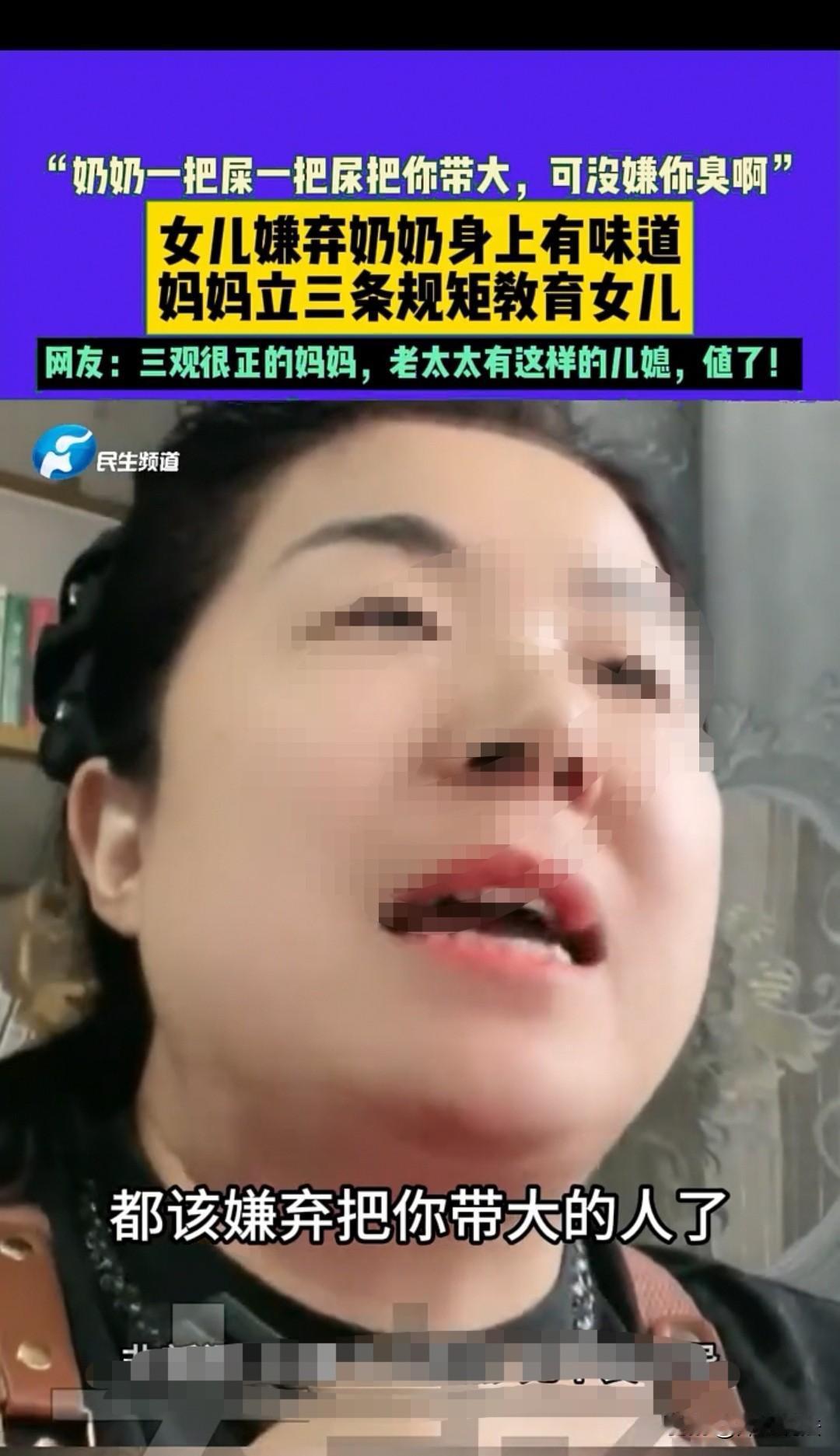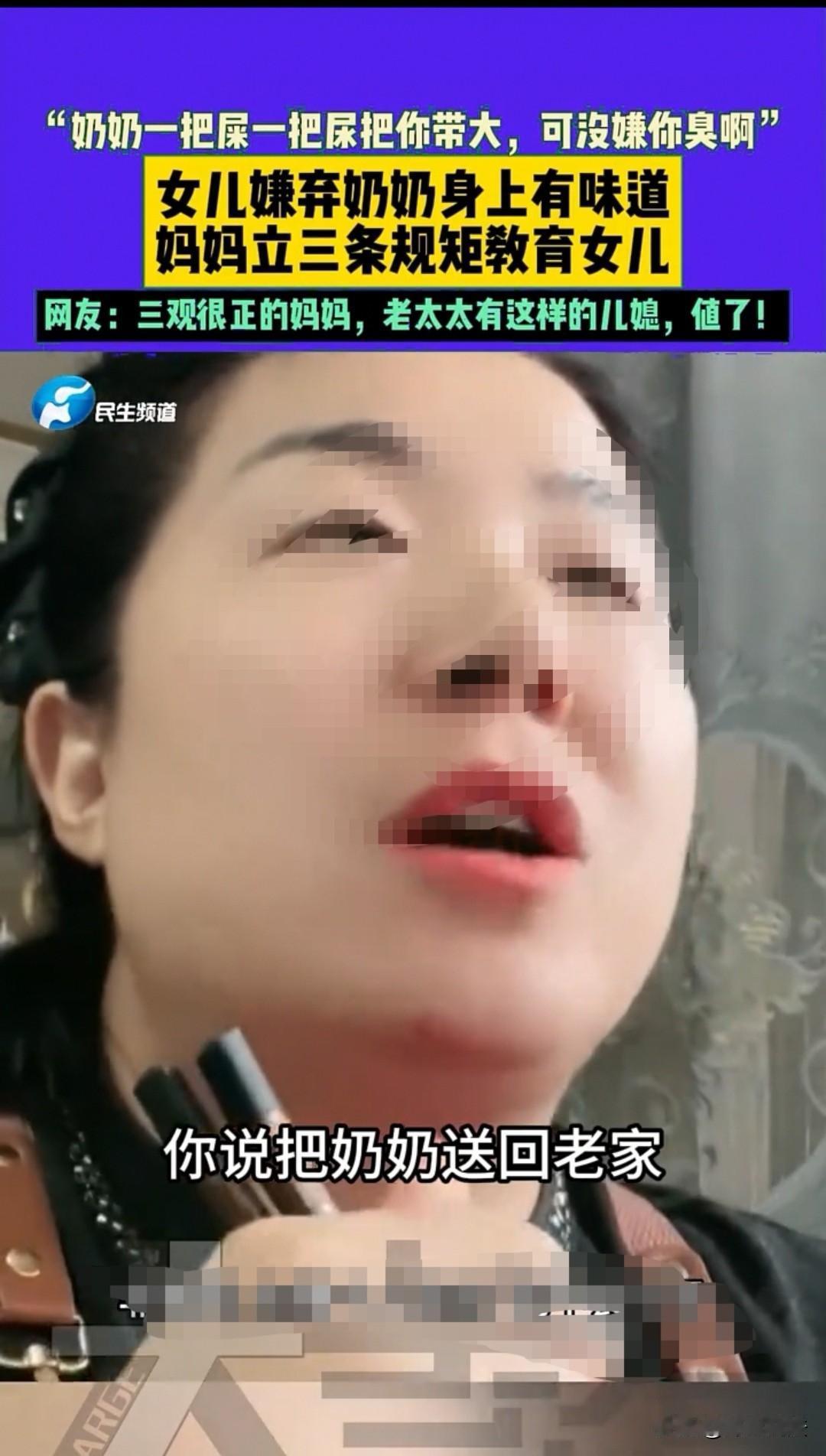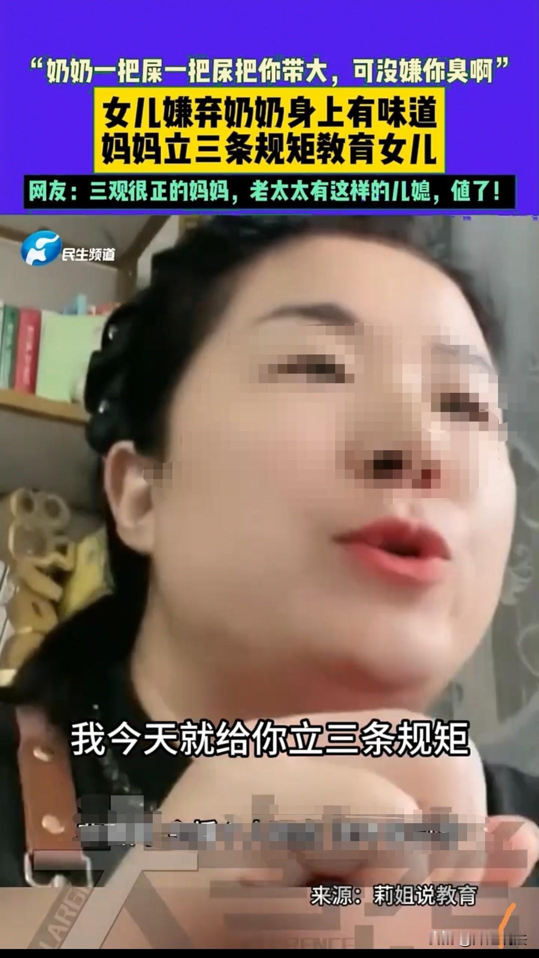 宁夏,15岁的孙女嫌弃奶奶身上有点味儿,想让妈妈把奶奶送回老家。妈妈严肃地说道:我是没教会你感恩,还是怎么的?你小时候奶奶都没嫌弃你,还一把屎一把尿把你拉扯大,你现在居然嫌弃起奶奶来了!马上给你立三条规矩:先去给奶奶赔礼道歉,再打盆热水帮奶奶擦拭身体,从此以后,奶奶的衣服袜子全由你洗。我必须要教会你做一个有温度、懂感恩的人。网友们看到后纷纷点赞,觉得这位妈妈三观超正。 妈妈从来没有想过,自己的女儿怎么会嫌弃奶奶有味。在她的印象里,自从女儿出生那一刻起,奶奶就忙里忙外,围着孙女打转。 那时候,奶奶经常端着碗追着女儿喂饭,生怕她少吃一口长不高;还经常抱着白白嫩嫩的孙女到街头显摆,说:你看我孙女长得多乖巧,以后一定是个大美女。 邻里邻居听到后,就说:你这样宠孙女,以后她肯定会孝顺你,你就等着享福吧。 可孙女现在15岁了,奶奶从没想过要图什么回报,反倒是孙女冒出了这种嫌弃的念头。作为妈妈,她心中有一种说不出来的酸楚。 她希望女儿能懂得感恩,尤其要知道奶奶的不易——把孙女拉扯大,奶奶确实付出了太多。 想当初,妈妈上夜班时,孩子就全由奶奶照顾。奶奶除了带孩子,家里的日常事务也得做,一个老年人每天要承担这么多工作量,实在不容易。 那时奶奶身体本就有老毛病,可为了让孙女玩得开心,每天都会抱着她下楼遛弯。 就这样,从十几斤抱到几十斤,后来孩子大了些,有时耍赖撒娇,奶奶还是会宠溺地抱着她。 奶奶毫无保留地把所有爱都给了孙女,可如今,孙女居然说出“奶奶身上有味,让妈妈把她送回老家”这种话。 这让当妈的情何以堪?说难听点,这就是自己教子无方。 她一直希望孩子能尊老爱幼——这是最传统的美德,可孩子连自己的奶奶都不尊重、不孝敬,又谈何“美德”? 妈妈强忍着眼泪,严肃地叫住女儿,对她说:奶奶身上的味儿,是给你洗衣做饭、操劳家务熬出来的。你小时候,奶奶从没嫌你又脏又臭,你现在倒反过来嫌弃起奶奶了? 你现在嫌弃奶奶,是不是以后也要嫌弃我和你爸爸?你不是5岁的小孩了,你都15岁了,难道在学校学的思想品德,都白学了吗? 接着,妈妈严肃地给女儿立了三条规矩:首先,你赶紧去恭恭敬敬地向奶奶赔礼道歉,必须看着奶奶的眼睛,真诚地表达歉意,不能让奶奶有丝毫委屈和不安; 其次,得到奶奶的谅解后,马上去打一盆热水,拿上毛巾,好好给奶奶擦拭身体,让她感受到你的诚意——道歉不只用嘴说,更要用实际行动证明; 最后,你不是嫌奶奶身上有味吗?那以后奶奶的衣服、鞋子、袜子,全由你来洗。让你亲身体会一下,奶奶当初是怎么把你一点点带大的,她养你小,你就必须养她老。 我必须教会你做一个有温度的人、懂感恩的人。连自己的奶奶都不知道感恩,你以后读再多书,又有什么用? 女儿听完后,默默按照妈妈的要求去做了。她终于意识到,自己之前的话有多伤人,既伤害了奶奶,也让妈妈寒了心;更明白了,奶奶才是自己的根,是永远不能忘的来时路。 网友们看到这段经历后,也纷纷点赞,感慨道:这位妈妈太棒了!三观超正!就该这样给孩子立规矩,让她记住——奶奶是谁?那是她的根,是她的来时路啊! 那么,从法律的角度来说,我们该如何看待自己是呢? 一、妈妈履行监护教育义务,符合法律对父母的核心要求。 《民法典》第二十六条规定,父母对未成年子女负有抚养、教育和保护的义务,其中“教育”包含品德培养与价值观引导。 妈妈通过立规矩要求女儿道歉、照料奶奶,本质是在履行法定教育义务。她促使女儿以实际行动弥补对奶奶的人格权侵害,同时传递“尊老”理念,其行为完全符合法律对监护人的要求。 二、奶奶享有受人格尊重与赡养扶助的法定权利。 《老年人权益保障法》第十四条要求赡养人履行对老年人生活照料、精神慰藉的义务。 奶奶作为老年人,依法享有不受侮辱、人格尊严受尊重的权利,同时有权获得家庭成员的生活照料与精神关怀。 妈妈要求女儿为奶奶擦拭身体、清洗衣物,正是督促家庭成员落实对奶奶的照料义务,保障其合法权益。 都说做人不能忘本,长辈就是我们的根本,每个人都应该学会感恩他们——有了他们的付出,我们才能拥有现在的幸福,我们才有如今的生活,不是吗? 对于此事,大家如何看? 素材来源于河南民生频道,2025年9月29日。