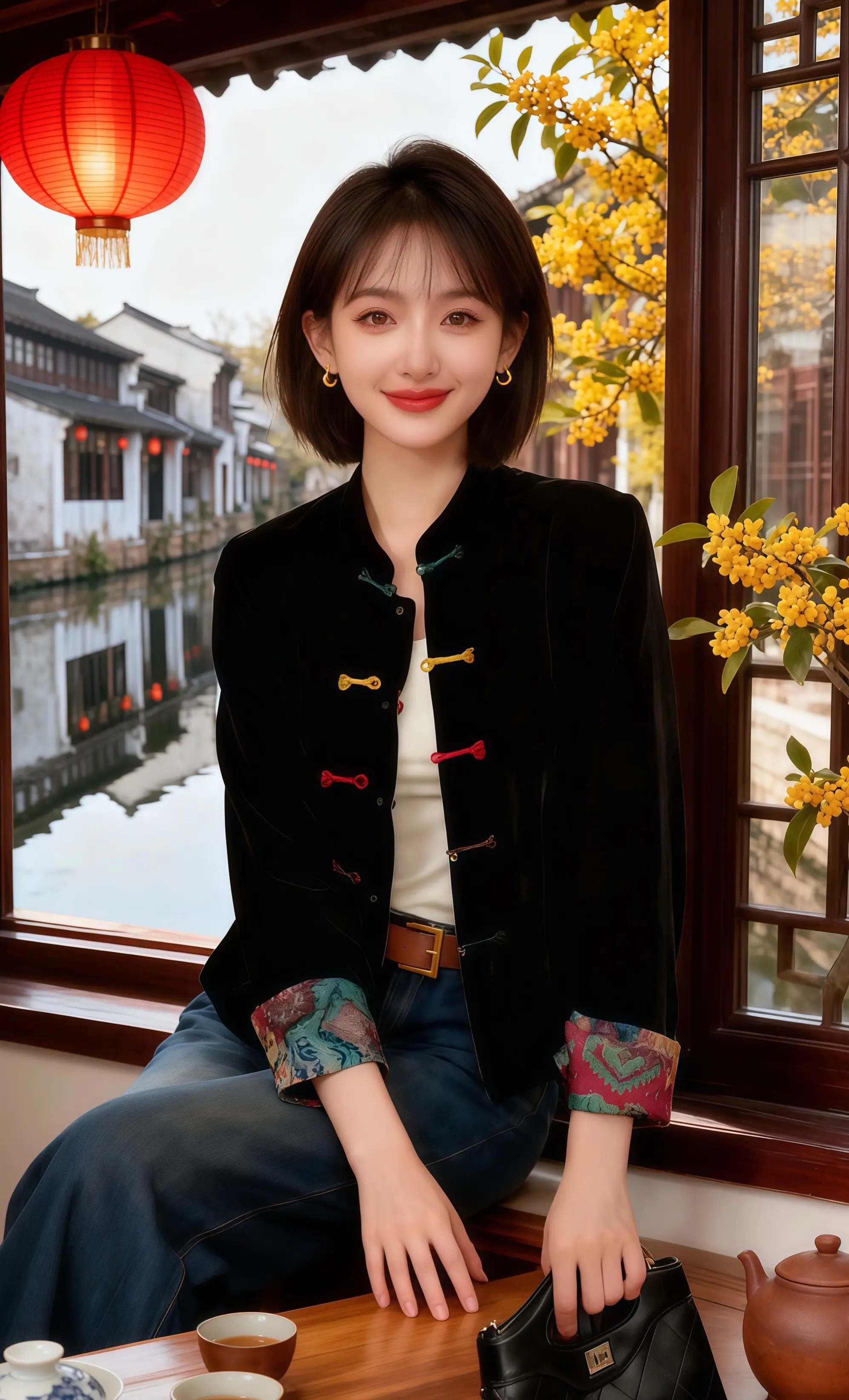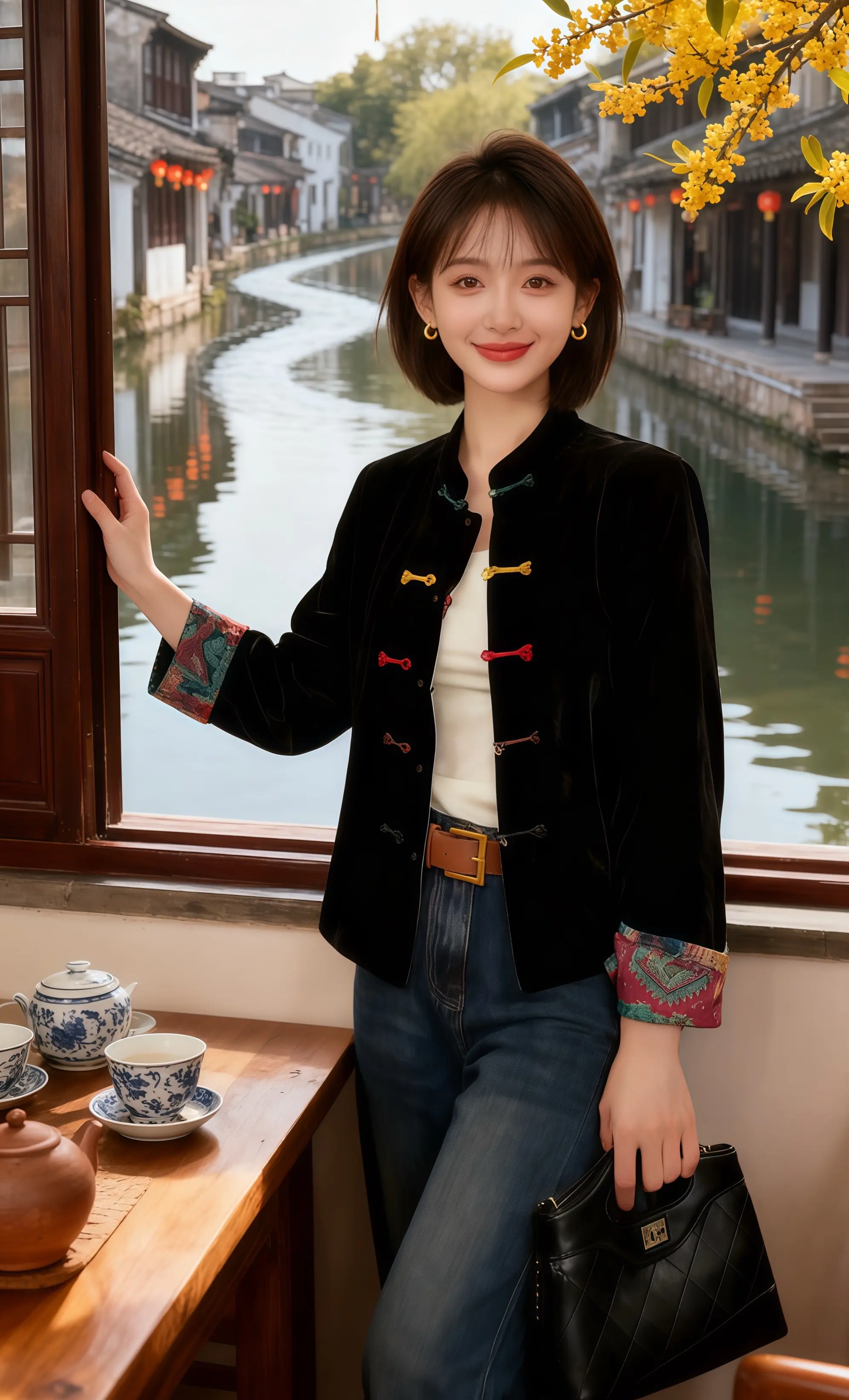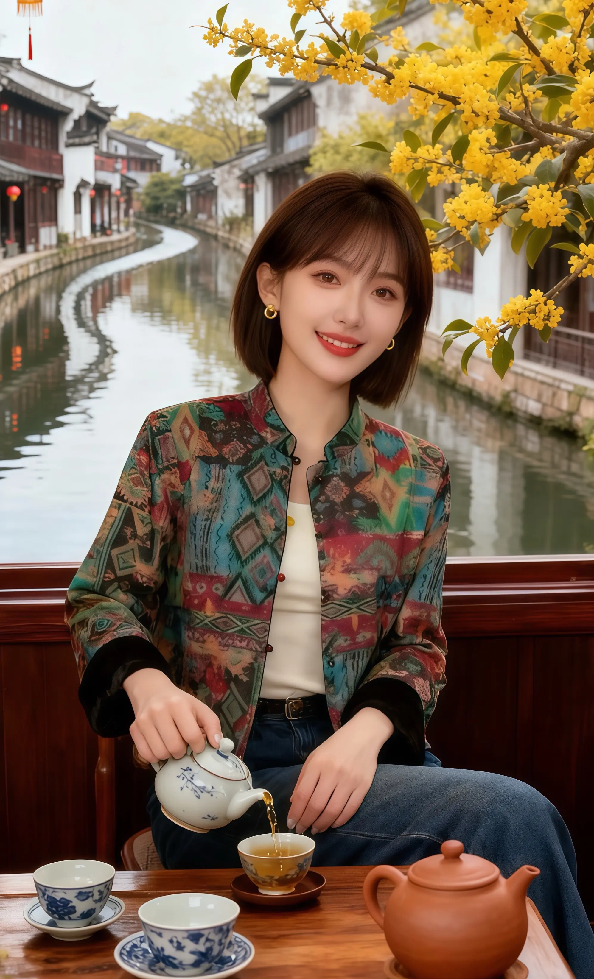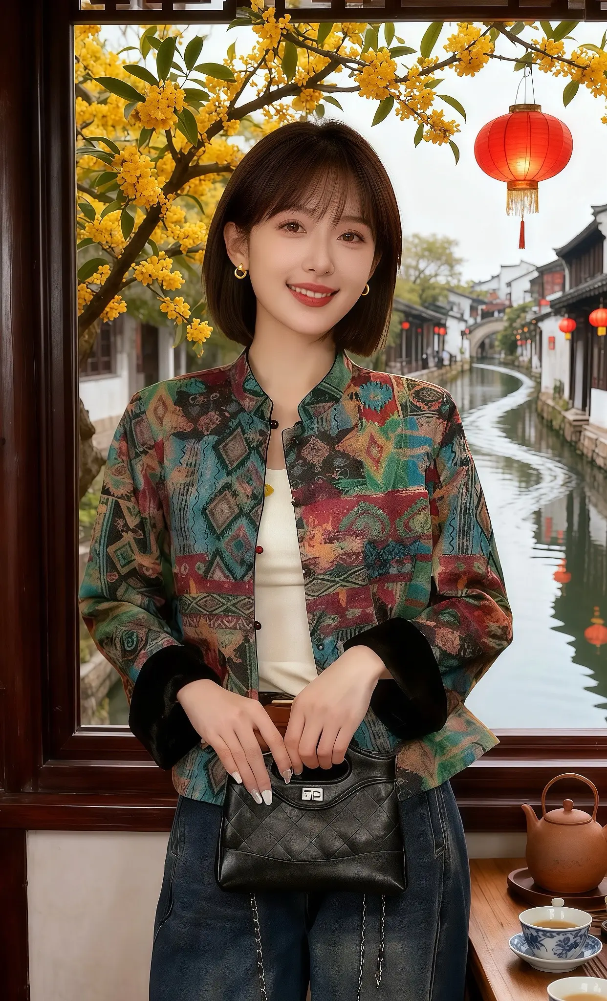 她选了窗边的位置,指尖抚过彩色盘扣,像抚过一段被时光藏起的故事。去年此时,她也是在这茶馆,穿着外套的另一面——那片绚烂的几何印花,和闺蜜笑谈着水乡的桥与船。