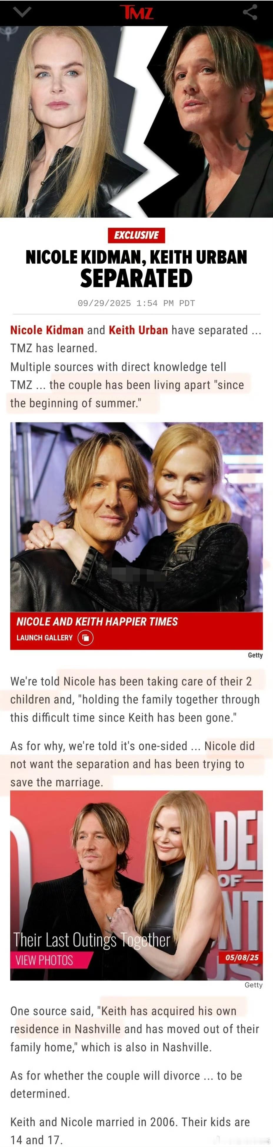 据外媒,妮可基德曼跟老公分居了,他俩结婚多年有两个孩子。