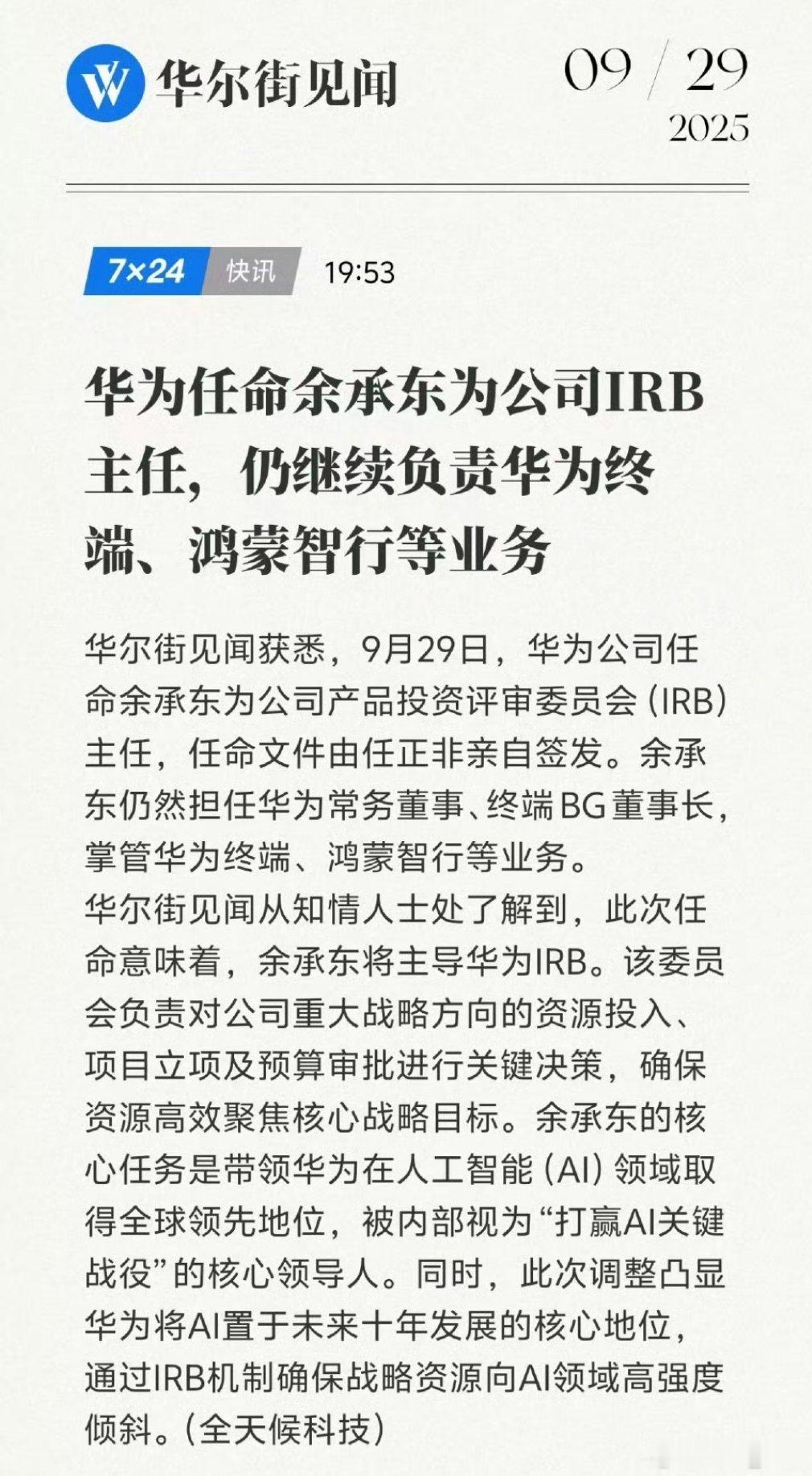 余承东增任华为IRB主任掌管AI余总再委以重任,任正非亲自签发任命文件。