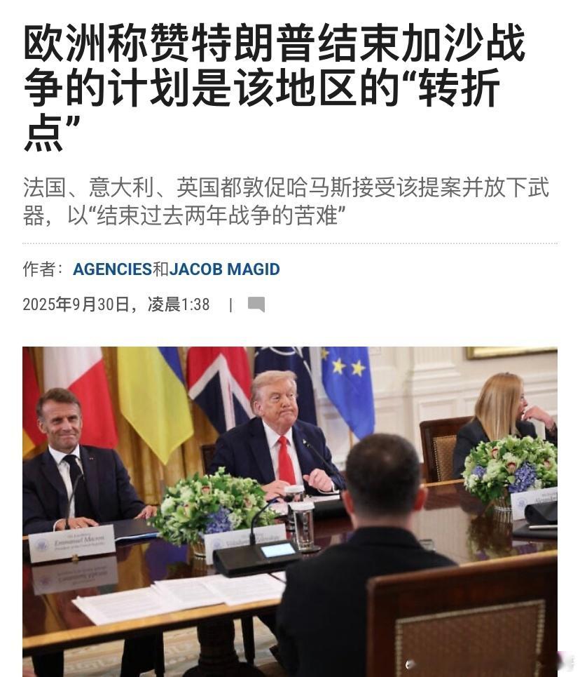 巴勒斯坦官方支持 美国发布最新停火方案 欧洲认为这是中东和平的转折点。哈马斯还没给答复。特朗普20点计划海外新鲜事