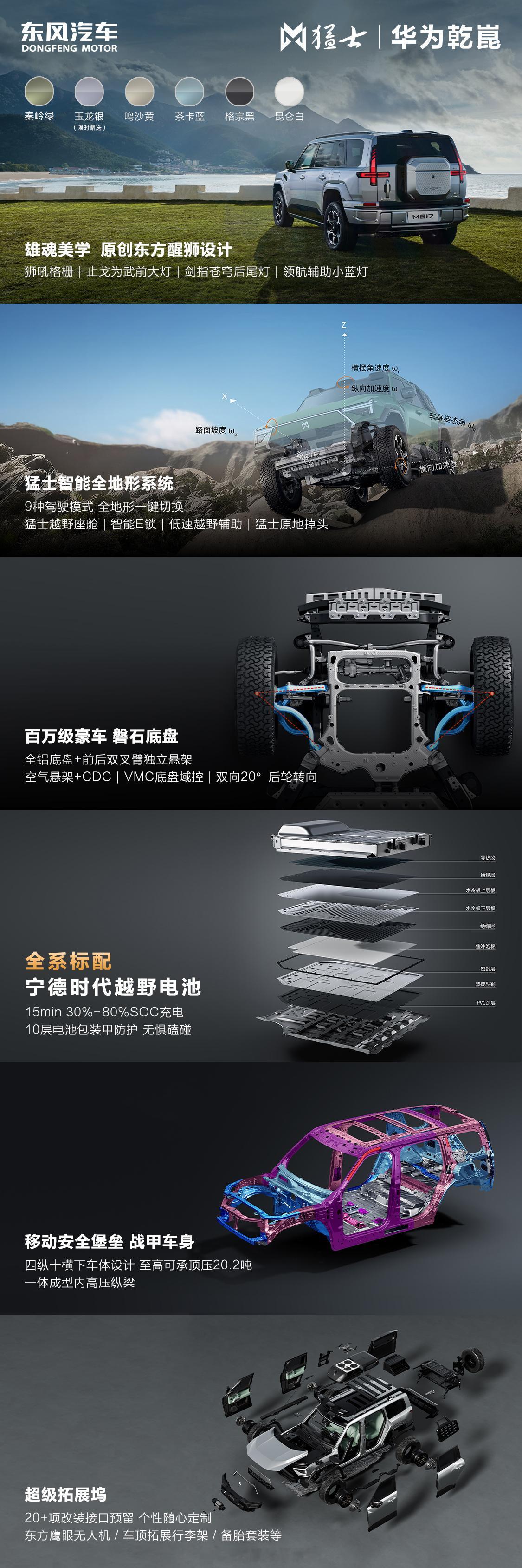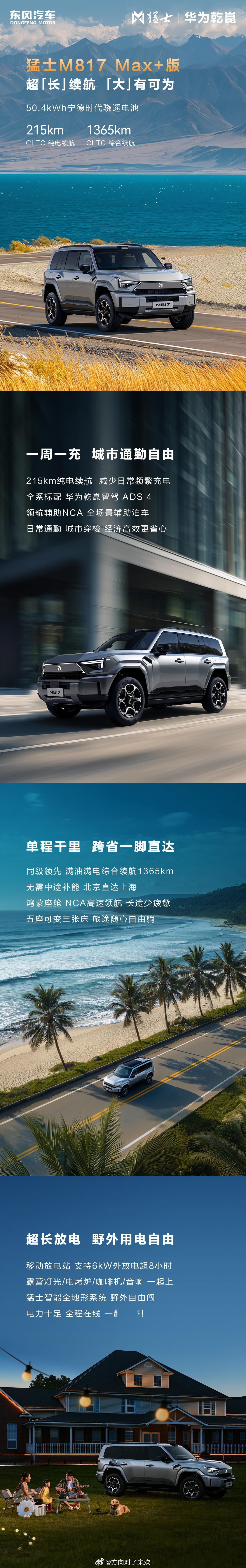 智能护航,奔赴山海。搭载华为乾崑和长续航电池的意义不仅是跑得远,更是跑得安心。猛士M817 Max+版有华为乾崑加持,无论是跨省高速还是城区通行,都能提供安心的智能护航,让旅途感受更多的风景和惬意! 华为乾崑