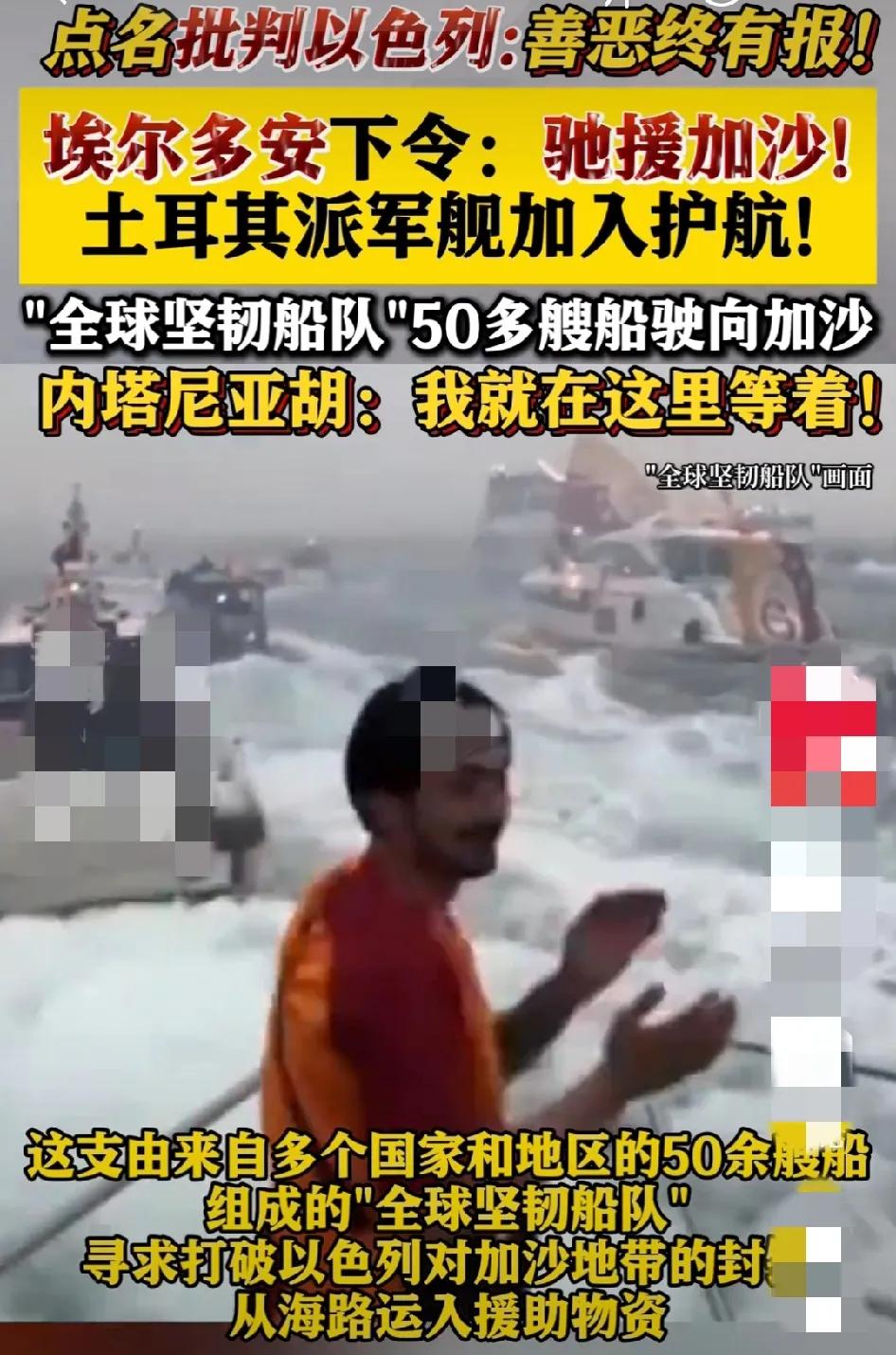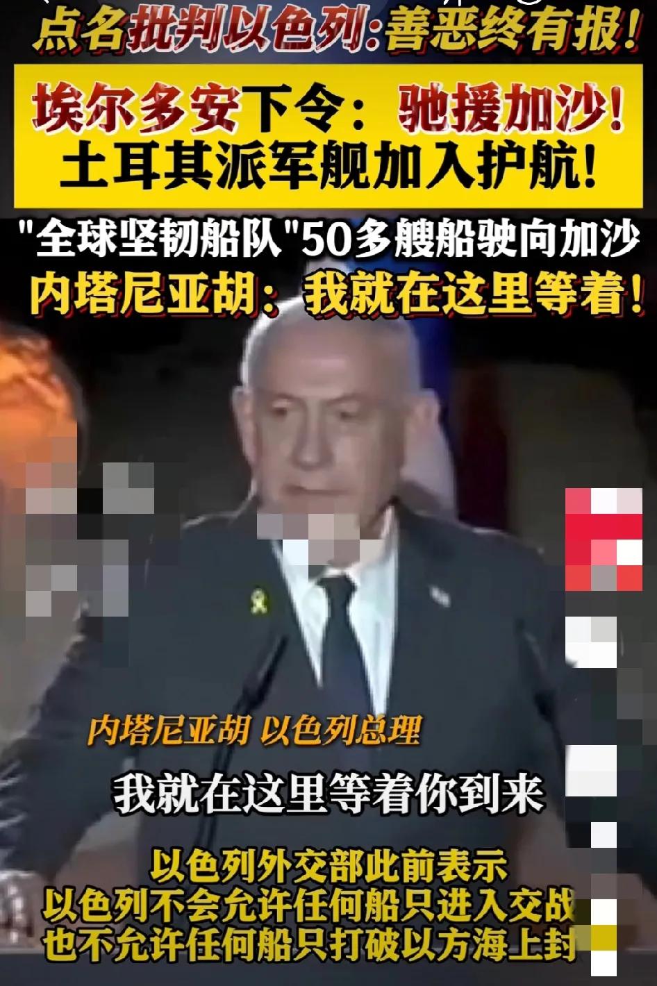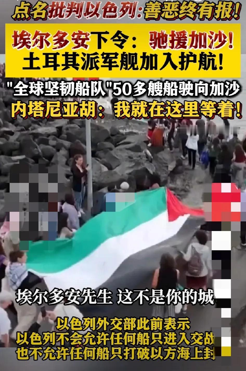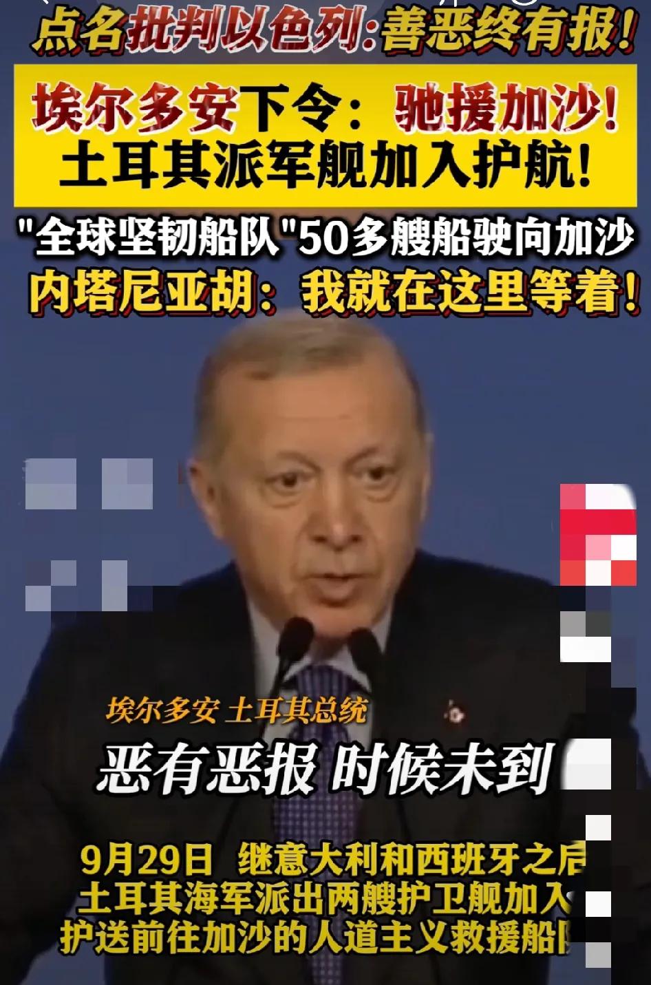 多行不义必自毙!善有善报,恶有恶报;不是不报,时候未到。以色列的暴行终于犯了众怒,站在道德制高点上,多国部队舰队驰援加沙,加沙人民终于有救了!不过,巴勒斯坦的蛋糕,也成了香饽饽,不会美以独得,一家独大了,都来分蛋糕摘桃子,排排坐分果果。中东的石油成了各国精诚合作的利益。 据报道,土耳其总统埃尔多安于2025年9月27日发表演讲,指责以色列总理内塔尼亚胡为“凶手”,并表示“不是不报,时候未到”。随后在9月29日,土耳其派出两艘护卫舰加入由多国组成的“全球坚韧船队”,旨在打破以色列对加沙地带的海上封锁。 再有,以色列此前明确表示不会允许任何船只进入交战区或打破其海上封锁。此次土耳其派军舰护航救援船队的行动,是继意大利、西班牙之后,又一国采取军事行动支持加沙援助物资运输。 另外,埃尔多安的言论被解读为对以色列封锁加沙的强烈不满,但其具体动机存在争议。部分分析认为,此举可能涉及土耳其与以色列在地区安全事务中的长期矛盾,或与埃尔多安近期政治立场调整有关。