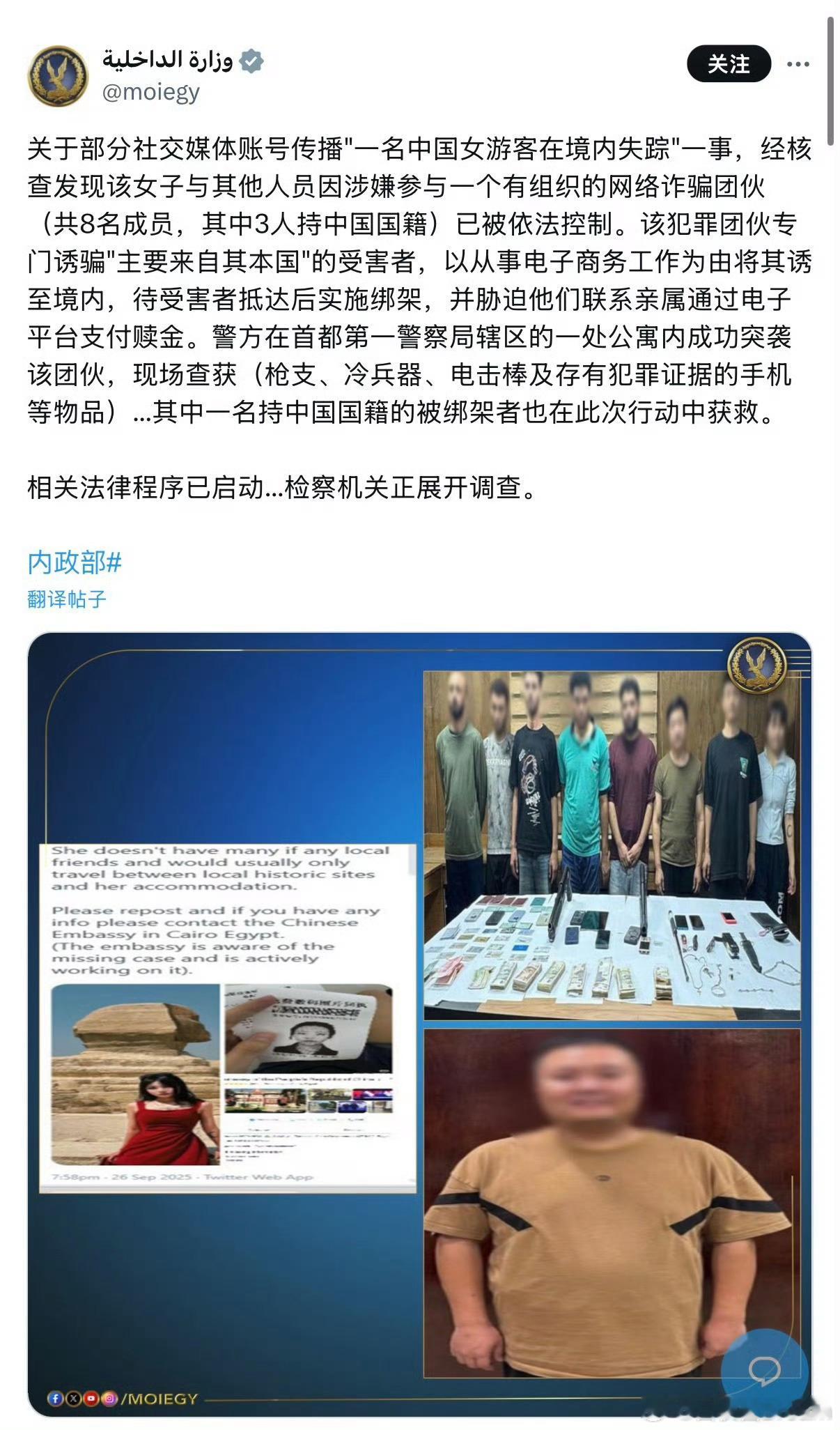 🔻埃及通报:失联6天21岁中国女孩因涉嫌参与电诈被捕,警方在其团伙定居点发现枪支、白刃武器、电击枪等。
