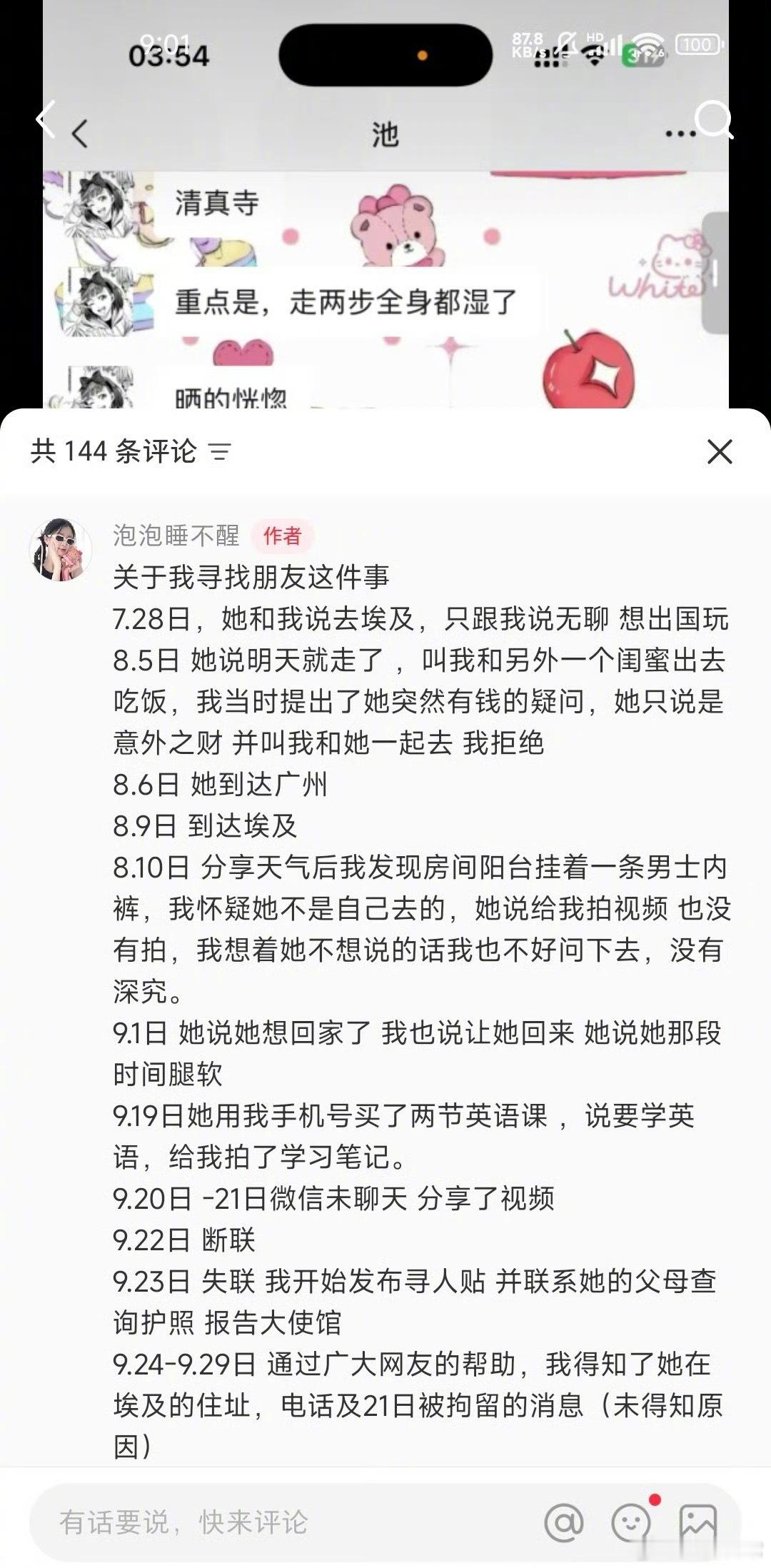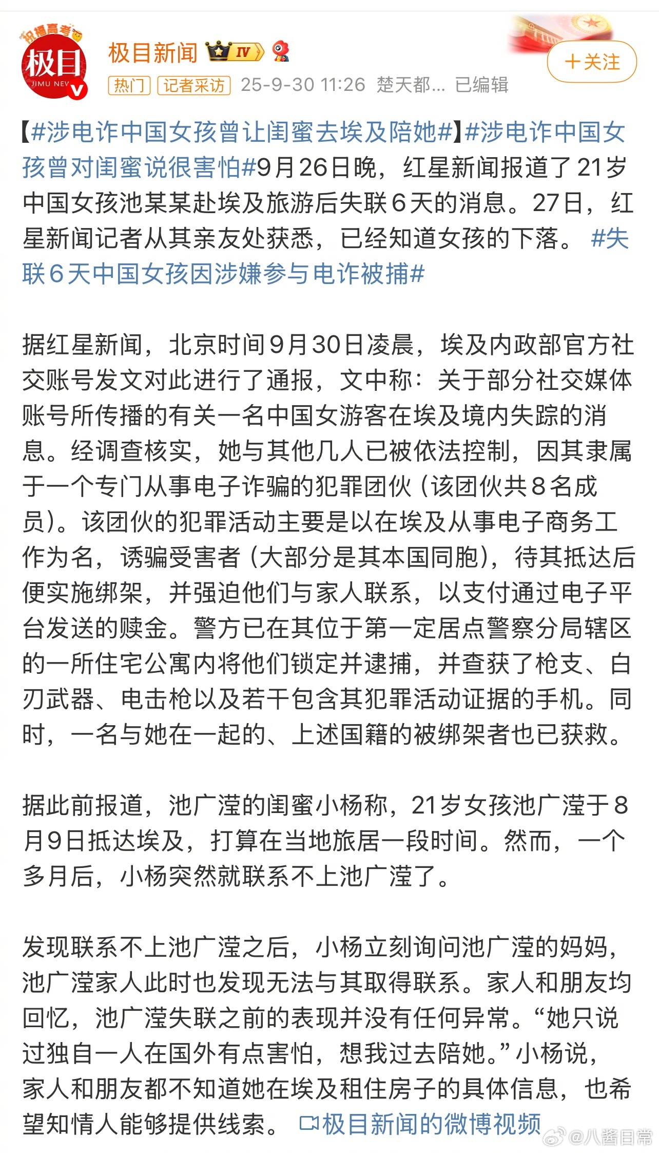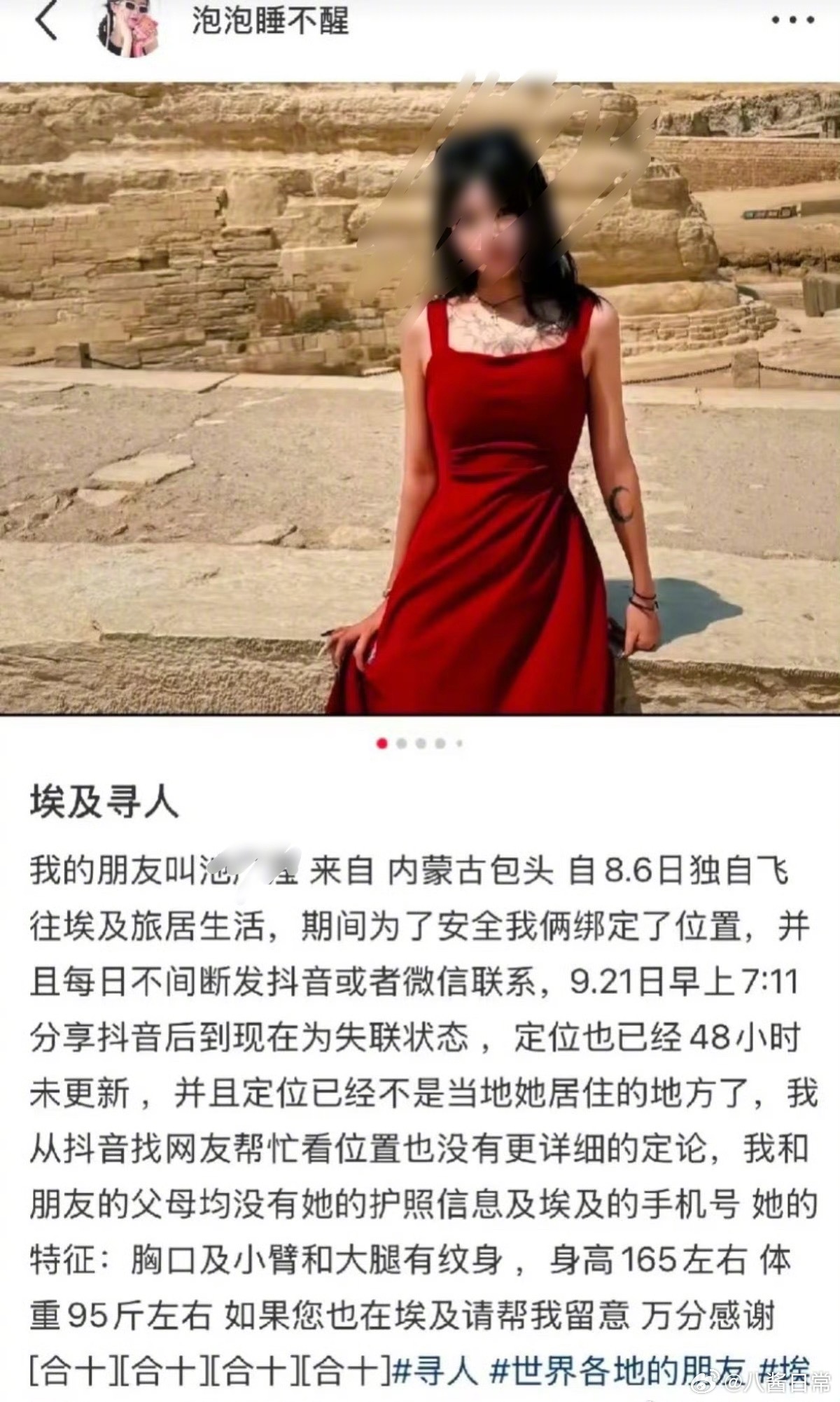 那个在埃及失联的21岁女孩是因为涉嫌电诈和绑架被依法控制了。她还想让发布寻人的闺蜜过去埃及陪她