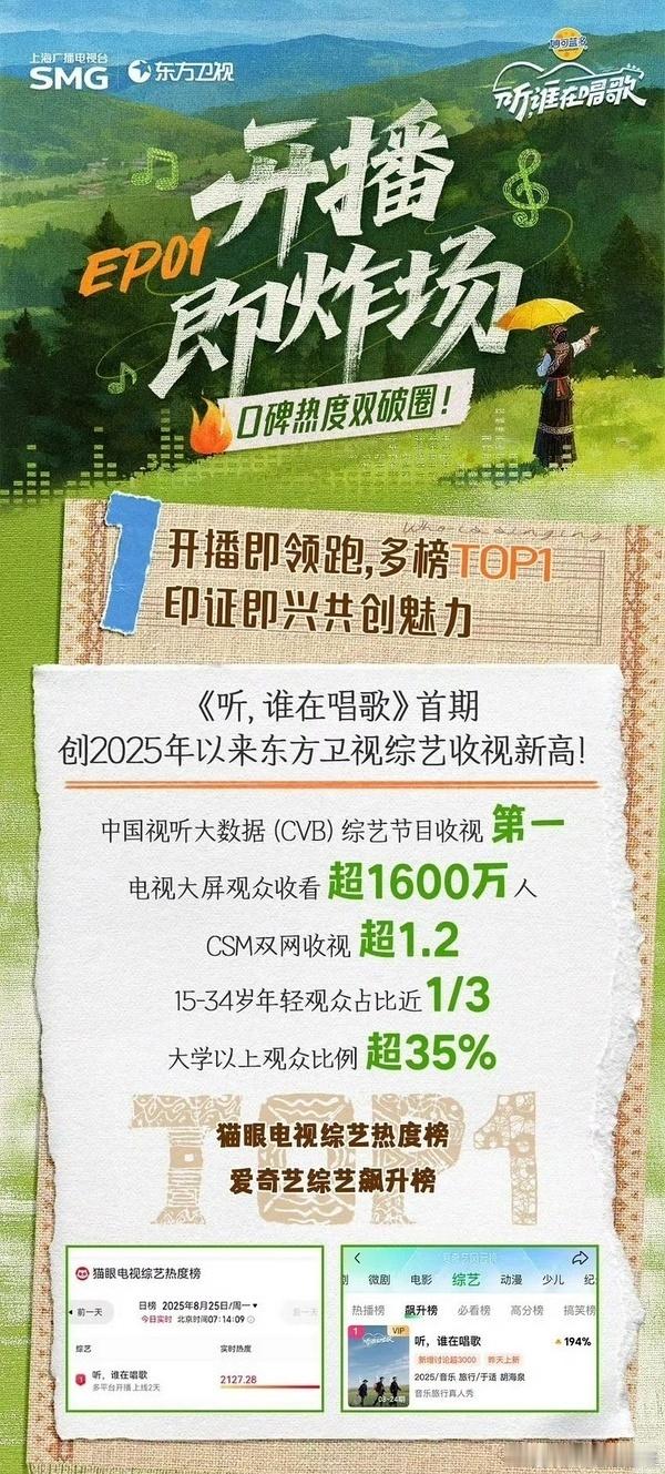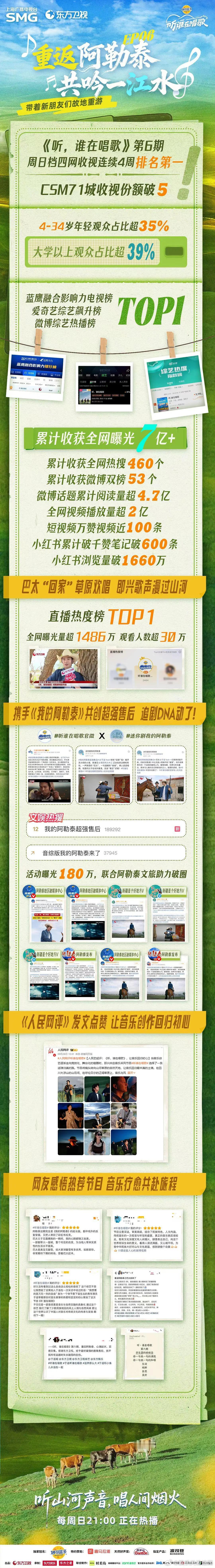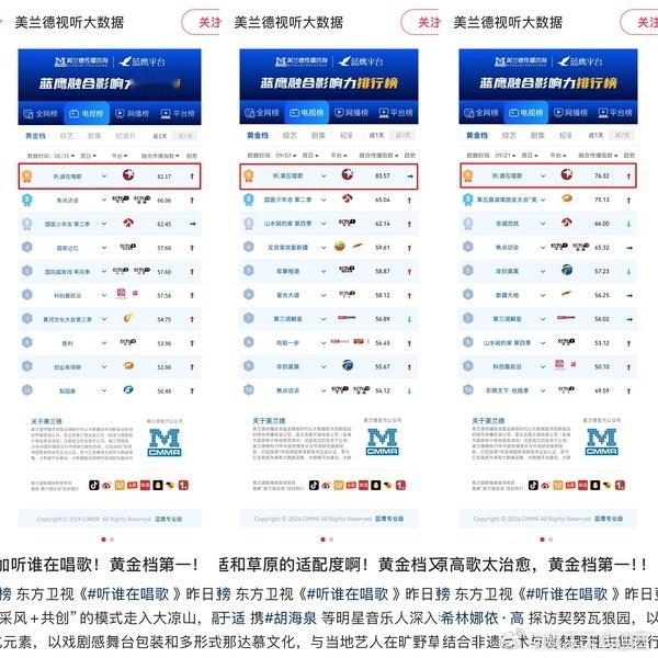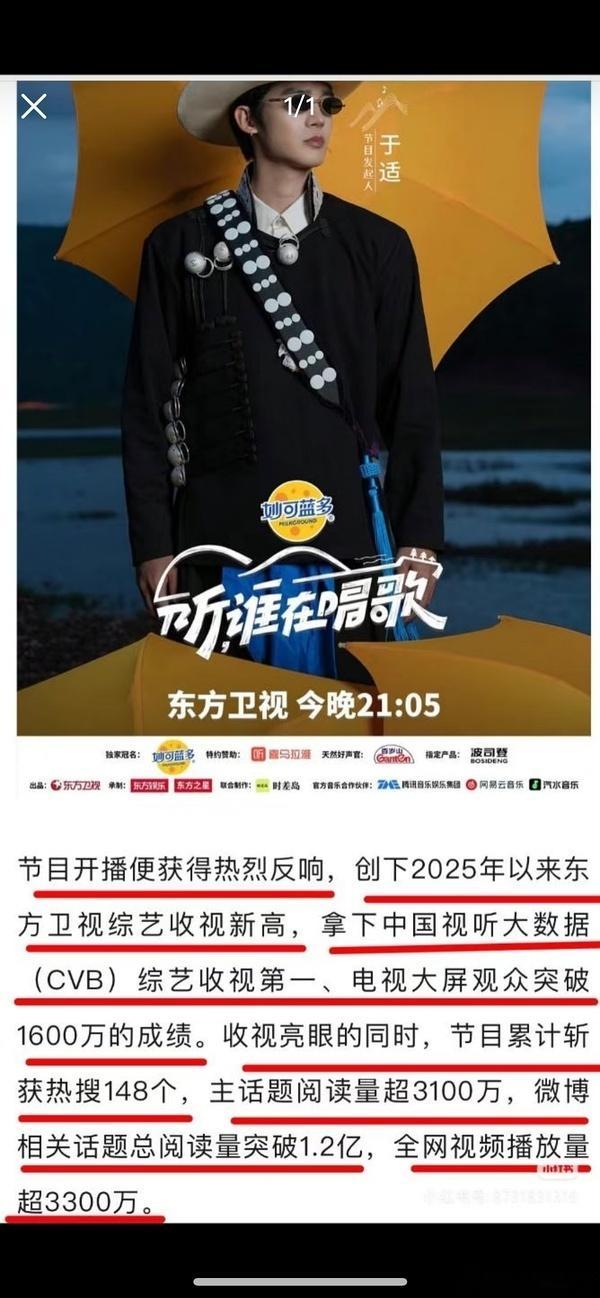 于适发起并作为总策划人的上星音综《听,谁在唱歌》,上线了37天,共播了6期节目,品牌赞助数量达到22个了,排名第二。