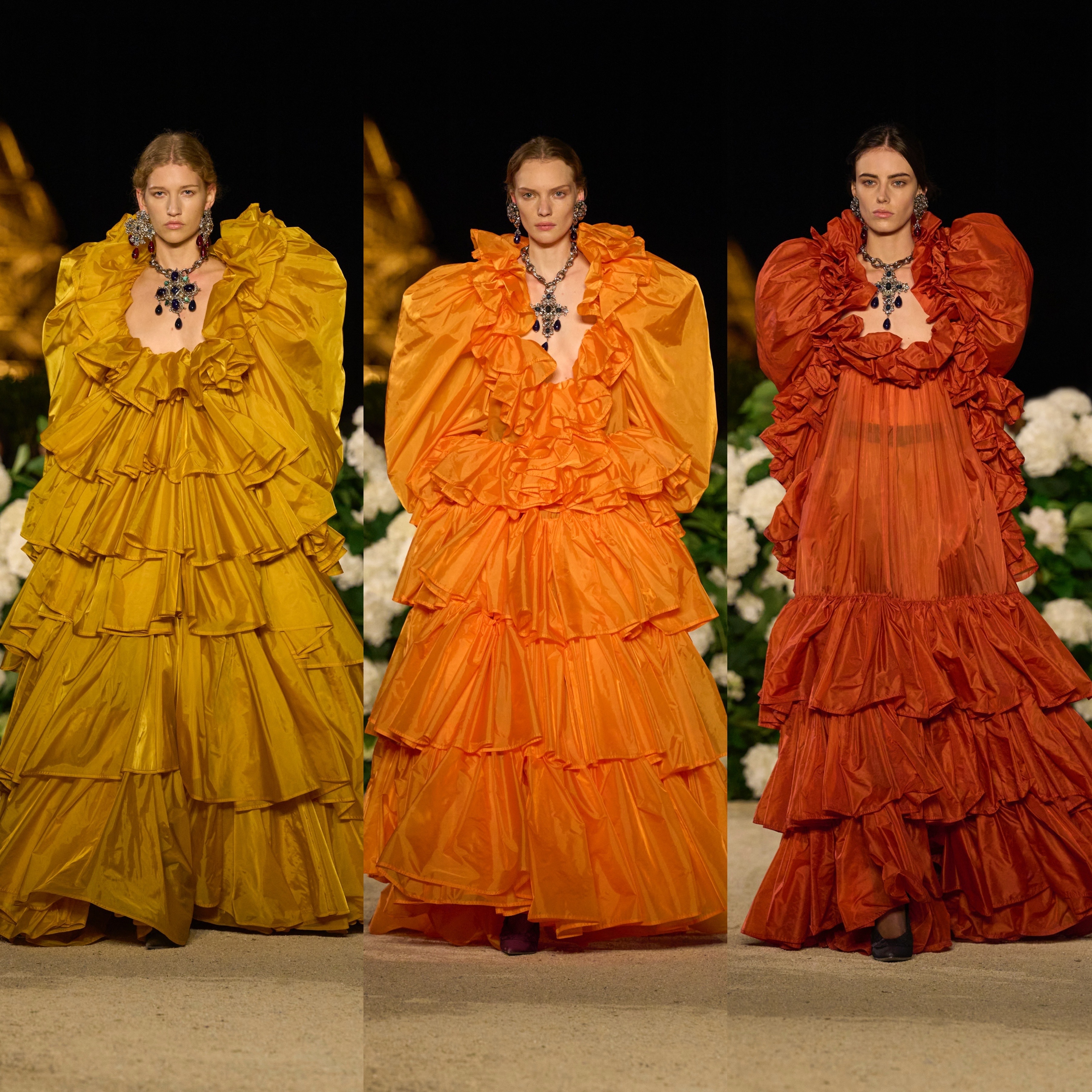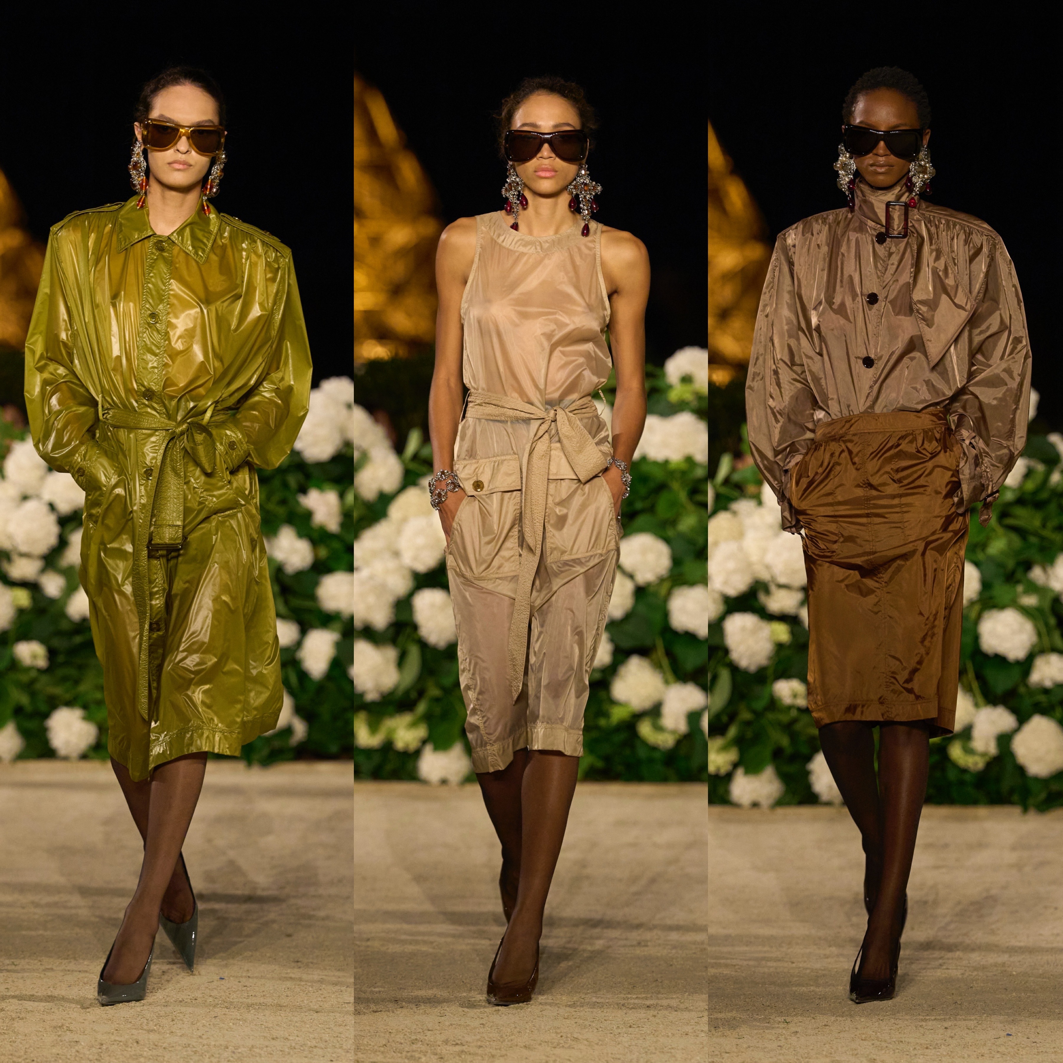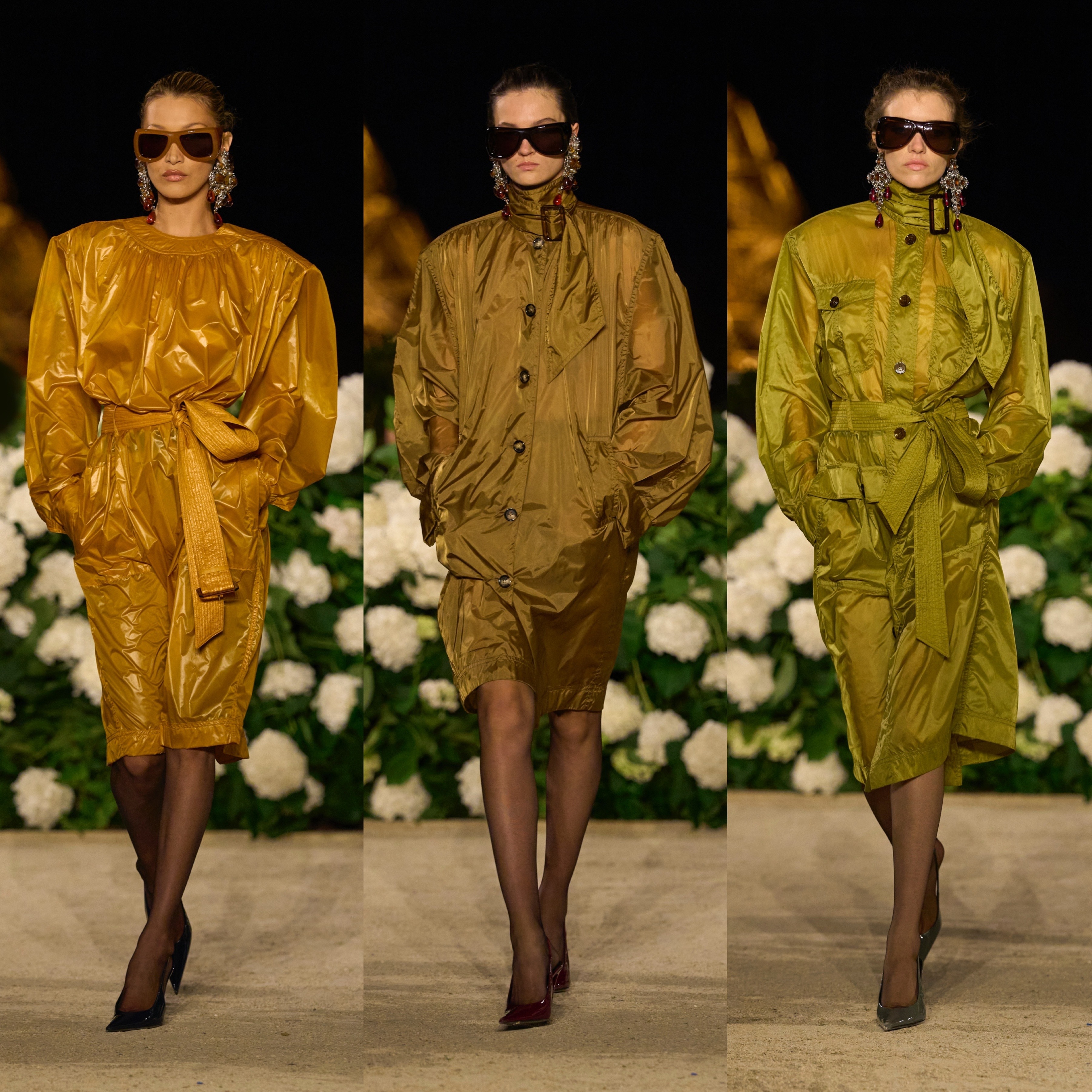 面料选择上 ,丝绸 、尼龙与皮革依旧形成鲜明对比 ,带来丰富的质感层次 。从深棕 、墨绿到藏蓝 ,再到明亮的姜黄 、橙红与橄榄绿 ,色调的变换同样展现出从低调内敛到热情奔放的情绪递进 。带有超大蝴蝶结装饰的白色衬衫 、多层次荷叶边装饰的长裙都彰显了浪漫与力量的结合 ,品牌一贯代表的独立 、自信 、叛逆的女性精神也焕发出更具张力的时装表达 。