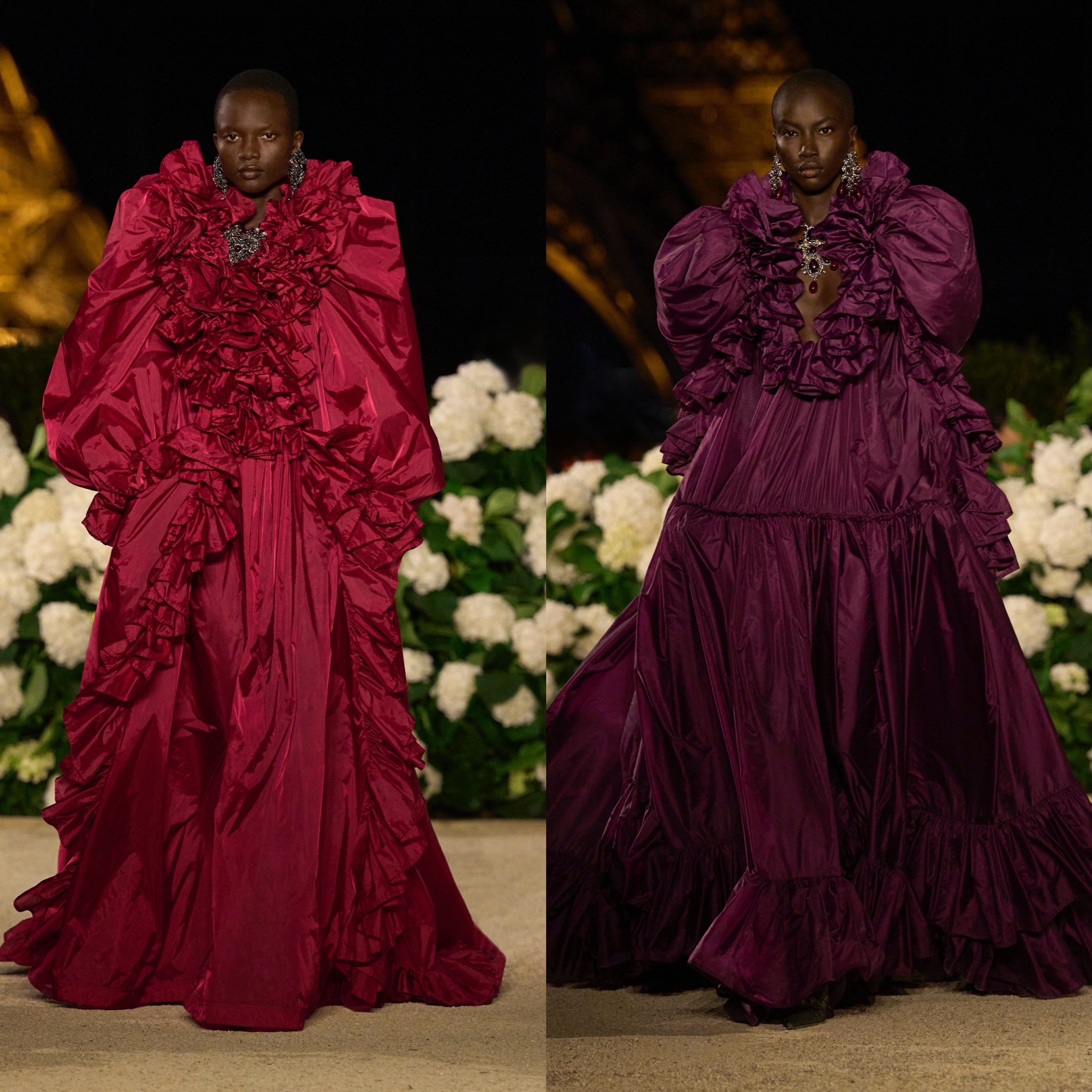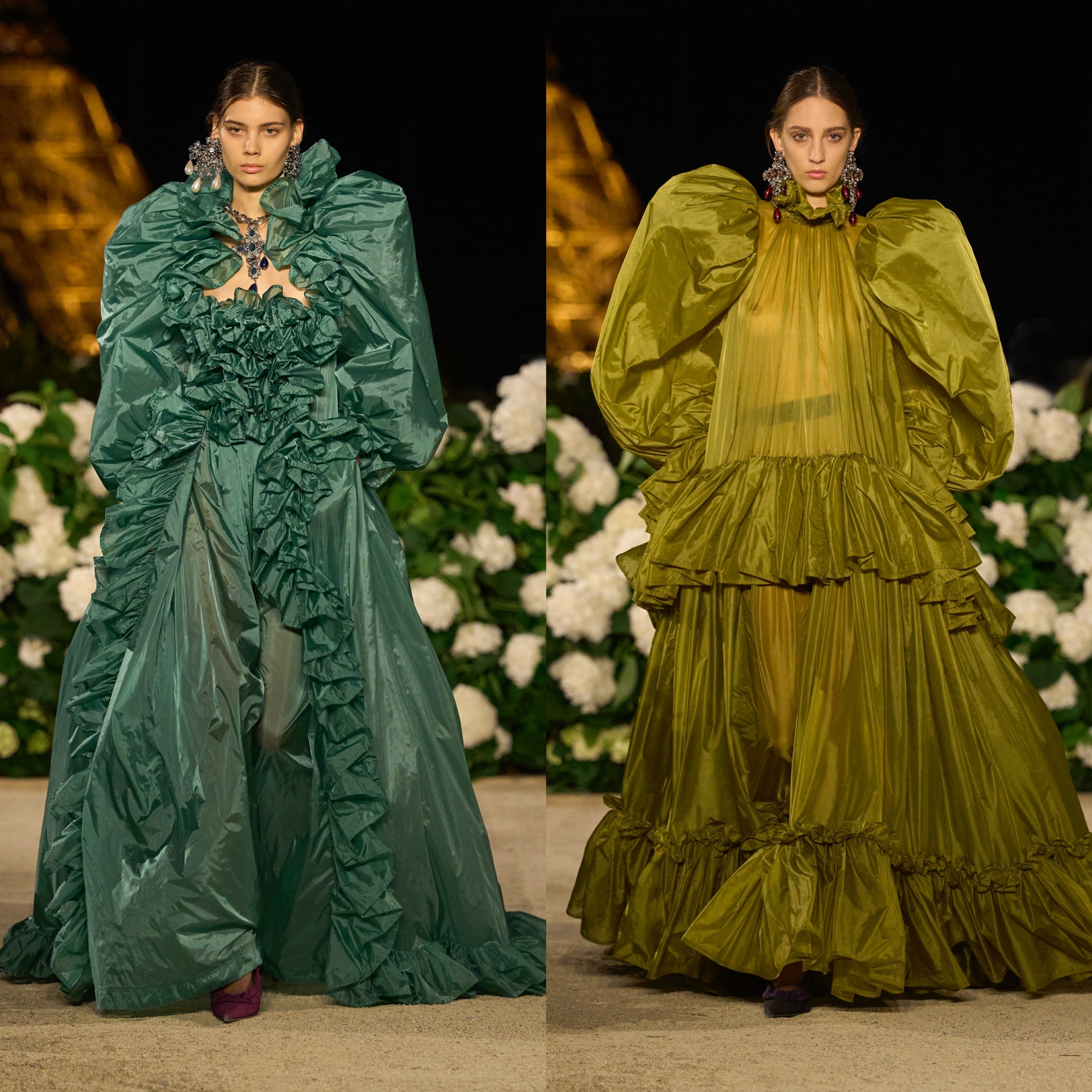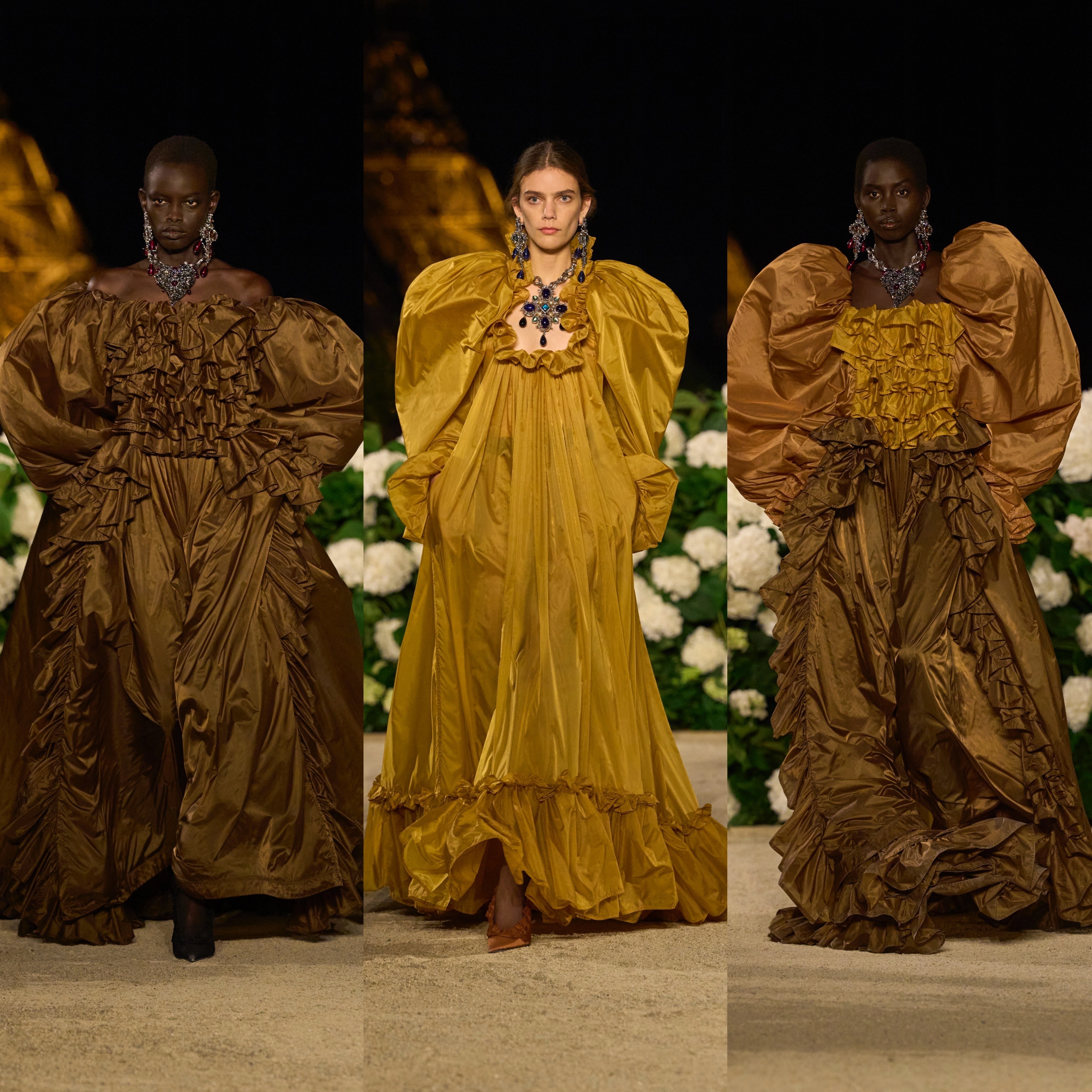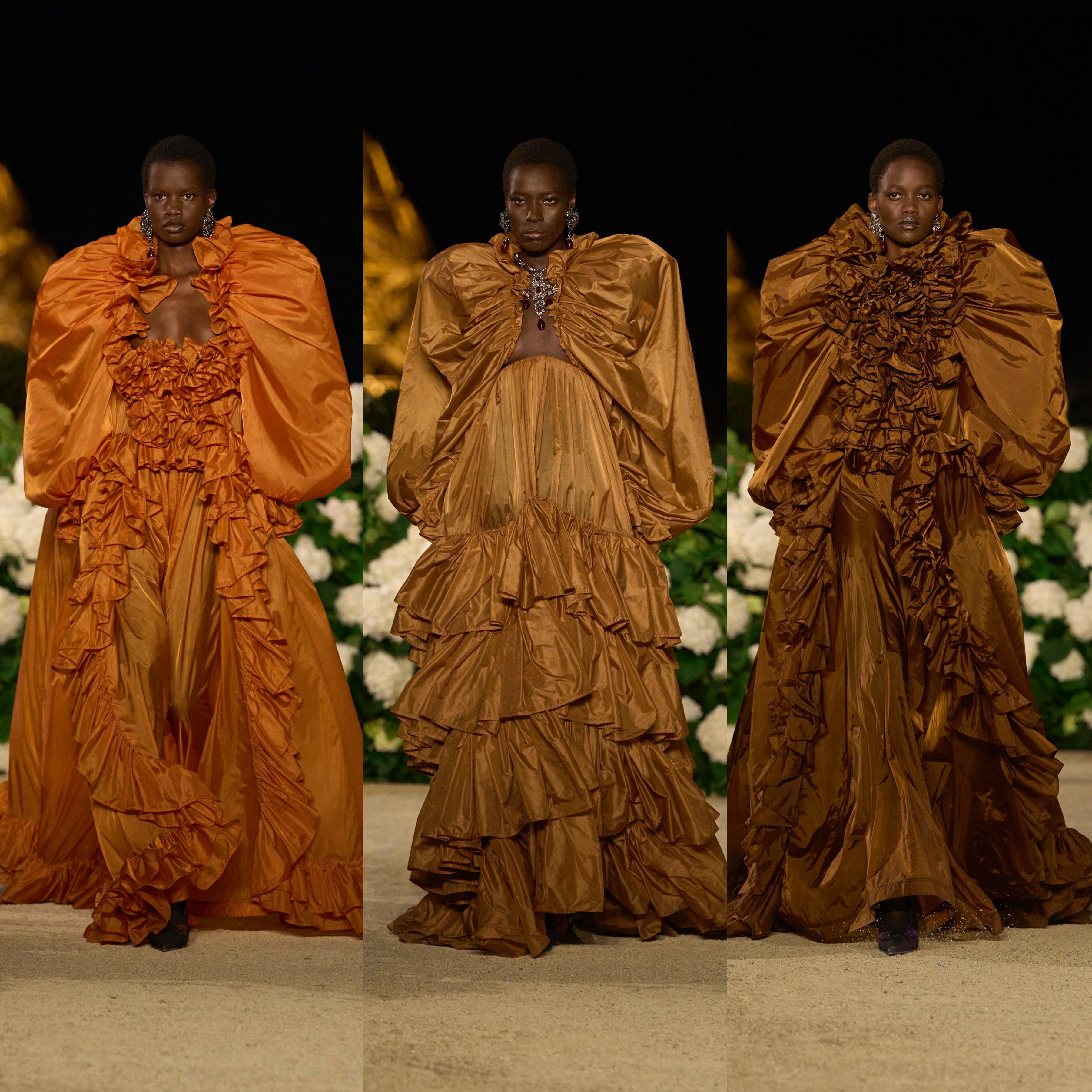 面料选择上 ,丝绸 、尼龙与皮革依旧形成鲜明对比 ,带来丰富的质感层次 。从深棕 、墨绿到藏蓝 ,再到明亮的姜黄 、橙红与橄榄绿 ,色调的变换同样展现出从低调内敛到热情奔放的情绪递进 。带有超大蝴蝶结装饰的白色衬衫 、多层次荷叶边装饰的长裙都彰显了浪漫与力量的结合 ,品牌一贯代表的独立 、自信 、叛逆的女性精神也焕发出更具张力的时装表达 。