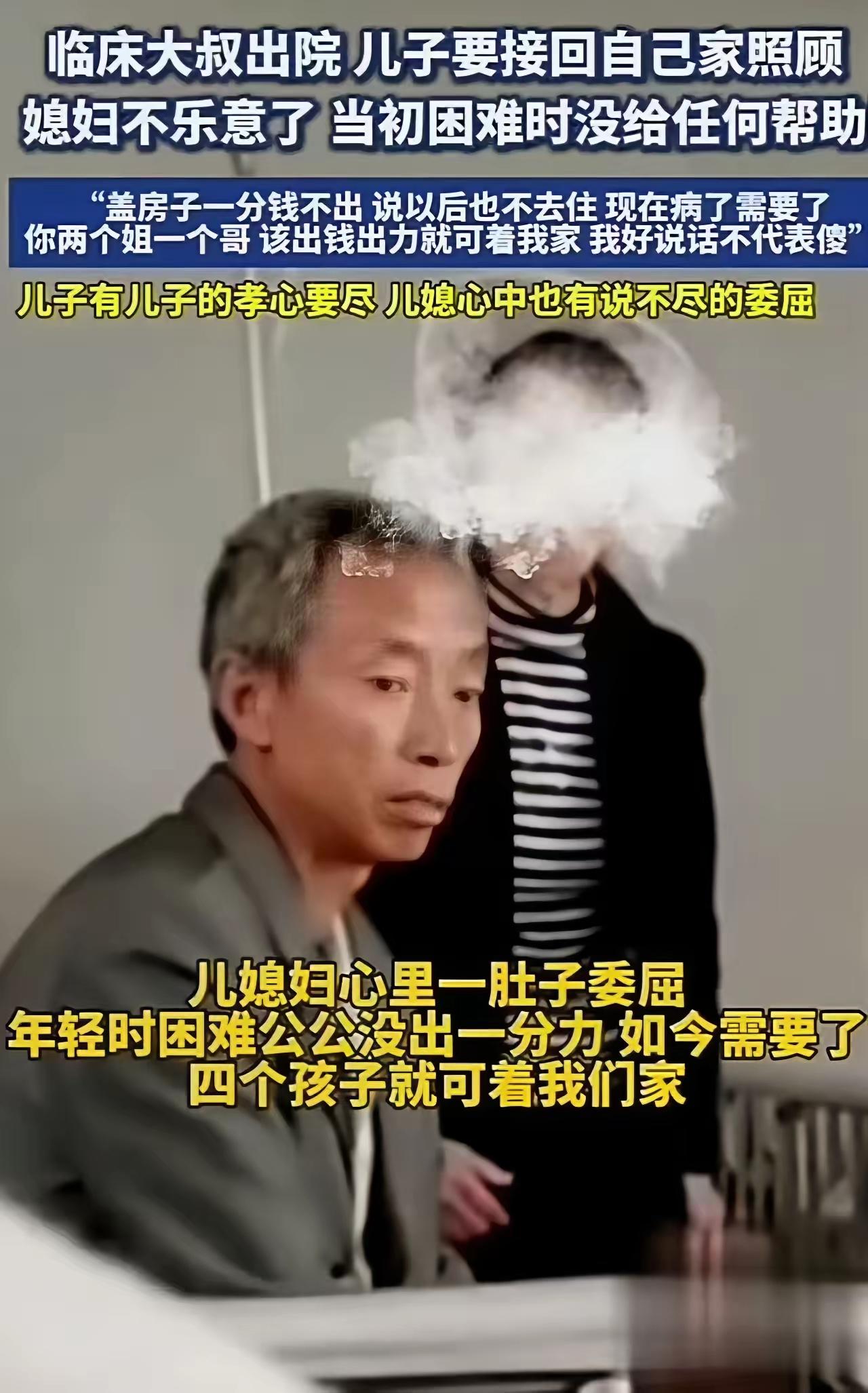 父亲出院了,儿子满心欢喜地打算把父亲接回家,好好照料一番。毕竟,父亲一辈子操劳,辛苦一生,难得病了还能有个温暖的家,让他在熟悉的环境中安享晚年,是儿子心底最朴素的愿望。然而,事情却没那么简单。 媳妇站在一旁,脸色阴沉,语气带着不屑:“你说的容易,父亲在我们盖房子的时候,除了帮忙干活,连一分钱都没出。现在倒是倒贴着要住我们家,真是说不过去。”她的话像一把锋利的刀,刺得空气都变得紧绷。“以后,他要是住我们家,难不成还要赖着不走?我不想家里变成‘养老院’,我也有自己的生活。” 儿子一时语塞,心中五味杂陈。他知道媳妇说的也不是没有道理,但父亲毕竟是家里最年长的长辈,养育之恩,难以用金钱衡量。“你这些年也没少为小舅子花钱,难道就不算数?”他试图为父亲争取一线空间,但话一出口,空气似乎变得更加紧张。 两人争执不休,仿佛一场没有硝烟的战争在家中展开。父亲静静地坐在一旁,看着这场家庭“战役”,脸上浮现出一丝无奈。其实,他知道,家人的矛盾远比表面上的争吵复杂得多。 在这个瞬间,我们不禁要问:家庭的温暖,到底是什么?是血缘的纽带,还是利益的平衡?父亲的病倒,让这个家庭的裂痕暴露无遗。有人说,亲情最怕的不是距离,而是利益和责任的模糊。 其实,每个家庭都在用不同的方式演绎着“爱”与“责任”。父亲的病让我们看到,孝顺不只是嘴上说说,更是行动上的关怀;而媳妇的坚持,也反映出现代家庭对于个人空间和生活质量的重视。 然而,站在第三者的角度,我们是否也该反思:难道照顾老人一定要有“条件”吗?家庭的和谐,难道真能用“我出钱”还是“不出钱”来衡量?家庭,是彼此的依靠,是共同面对风雨的港湾。父亲的病倒,应该成为家庭团结的契机,而不是撕裂的导火索。 这场争执,折射出许多家庭的现实:在快速变化的社会中,传统的孝道观念与现代的个人权益不断碰撞,冲突在所难免。我们是否也曾在无形中,把“责任”变成了“负担”?又是否忽略了,家庭的本质其实是“相互扶持”,而不是“条件交换”? 或许,我们都需要一场“家庭的重启”。重新定义孝顺的意义,理解每个人的难处,学会在矛盾中寻找共识。毕竟,家,是我们心灵的港湾,是无论贫富、贫富、贫富都愿意为之守护的地方。 读到这里,你是否也在心里暗暗叹息?家庭的温暖,难道真的要靠“条件”来衡量?我们是否也曾在家庭的琐碎中迷失了初心?每个人都希望被理解、被包容,但现实总是那么残酷。 也许,这个故事的答案,就藏在每个人的心里。家庭的幸福,从来不是简单的“谁付出多,谁得到了”,而是在风雨中彼此搀扶,在矛盾中找到理解。让我们都试着用一颗包容的心,去看待那些看似无法调和的矛盾,也许,下一次的和解,就藏在我们愿意放下一点点“自我”的瞬间。 家庭,从来都不是完美的,但正是这份不完美,才让我们学会了宽容和爱。你,愿意为这个家,付出一点点理解和耐心吗?老了,才想起当初应留点后路