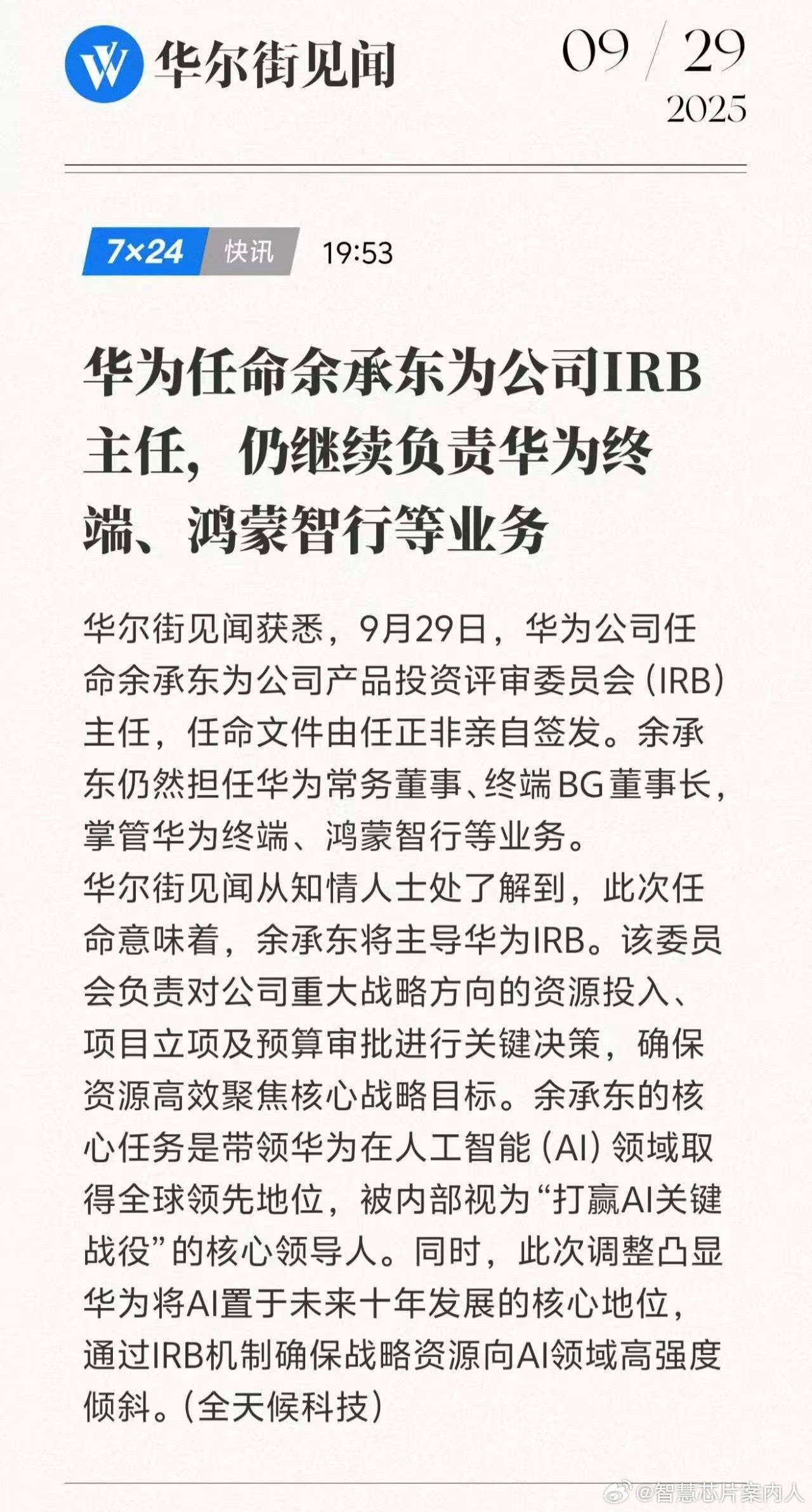 余承东任IRB主任的核心职能是,通过华为的IRB机制确保公司战略资源向AI领域高强度倾斜。恭喜!