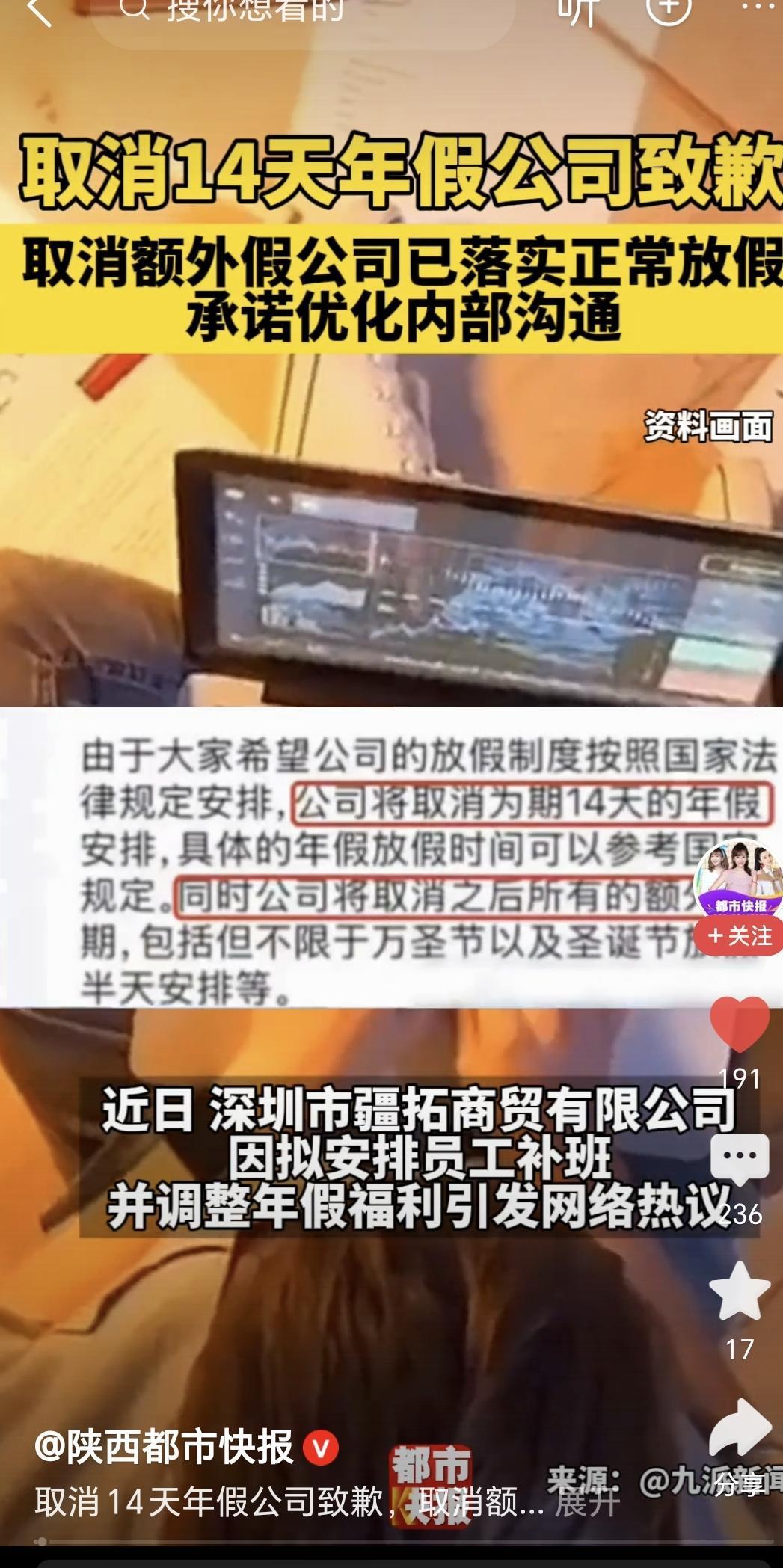 公司是道歉了,但老板心寒了。 老祖宗早就说过“升米恩,斗米仇”,14天年假的公司,全中国也没几家吧。 我上班二十几年,历经5家企业。有年假的公司只有一家,且只有5天年假。 员工和企业应该是双向奔赴,14天的年假都给了,偶尔根据实际情况调休个1~2天,毫不为过。 做人不能太自私!