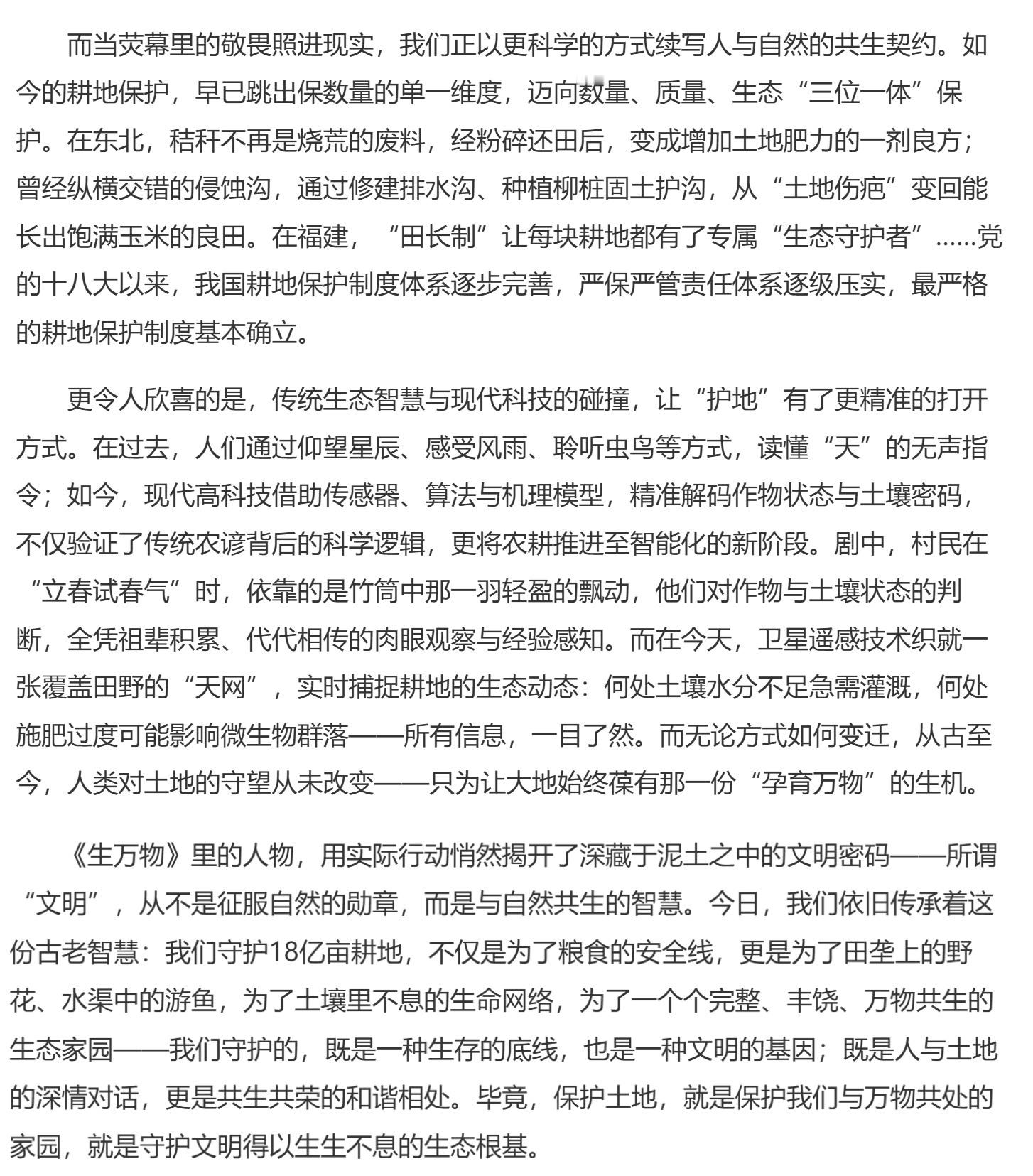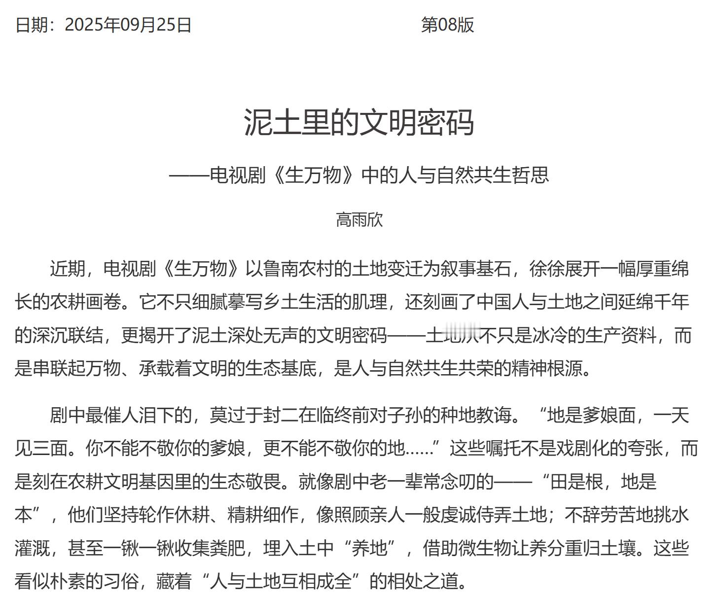 近日,由自然资源部主管的中央级行业报《中国自然资源报》 刊登了一则文章:泥土里的文明密码——电视剧《生万物》中的人与自然共生哲思