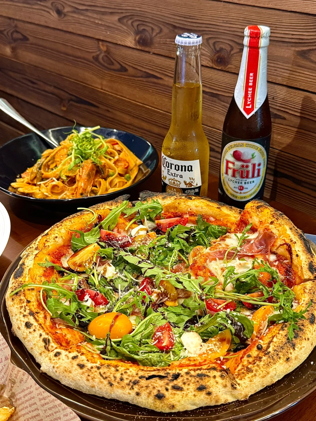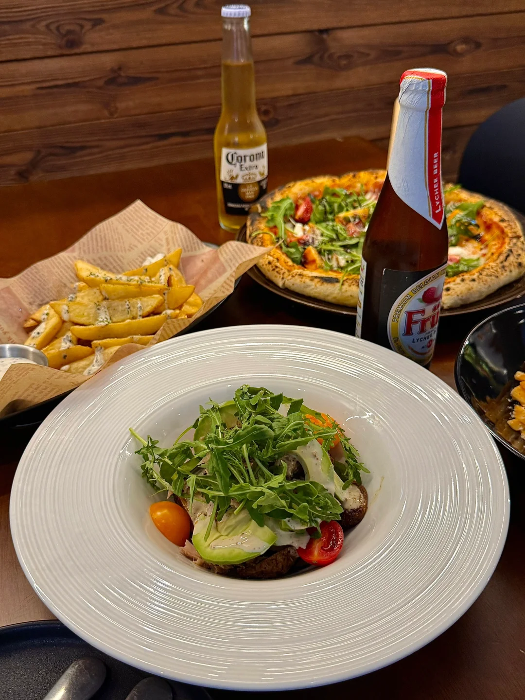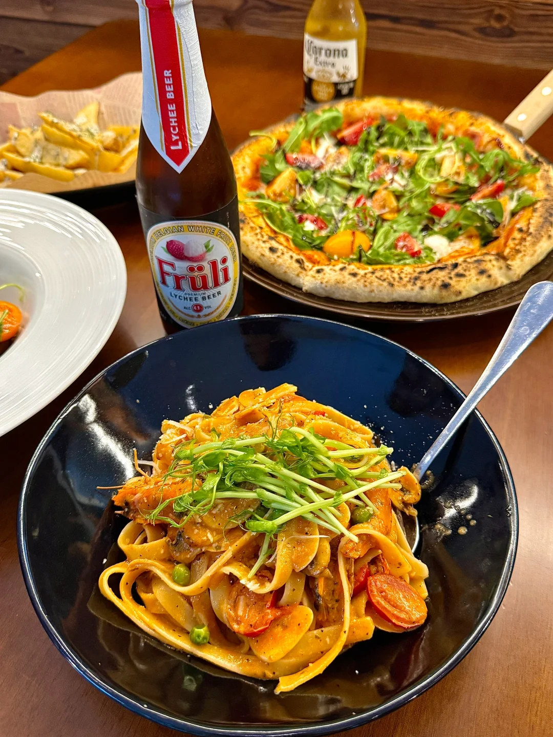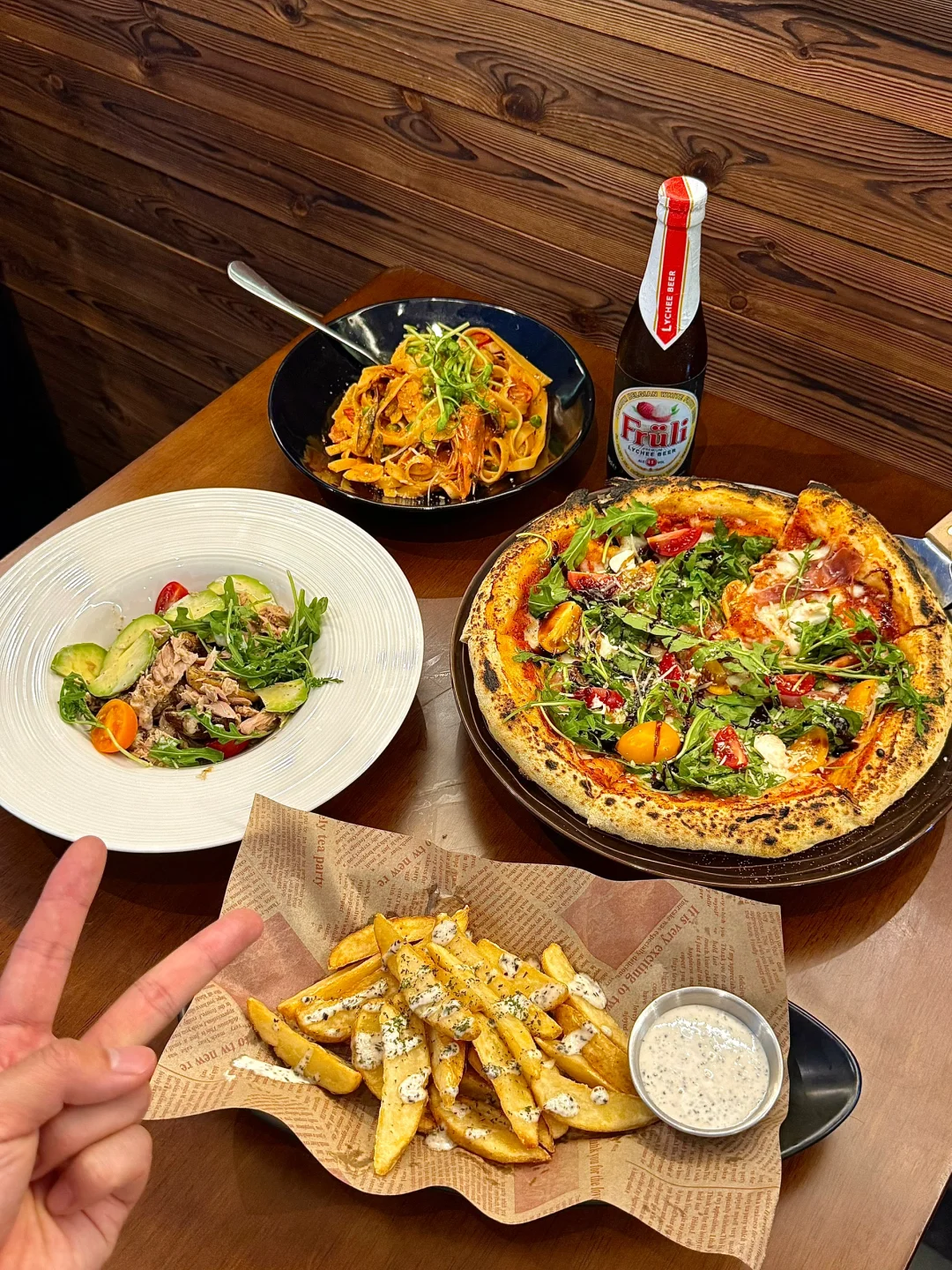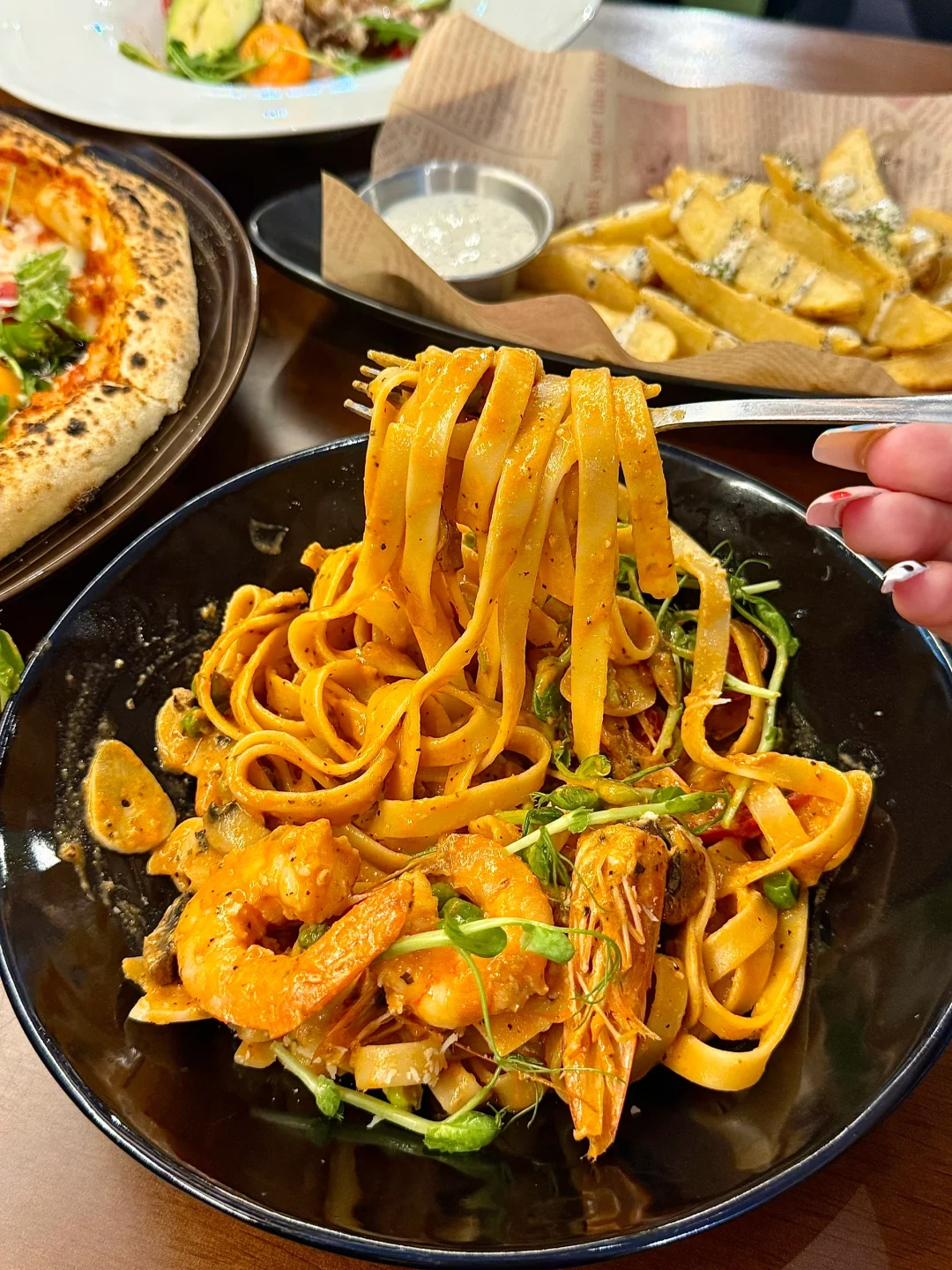 我们还点了鲜虾罗杰宽意面,面条裹着酱汁特别入味,鲜虾也新鲜Q弹;还有金枪鱼牛油果土豆沙拉,料给得很足,吃着清爽不腻,配披萨刚好。