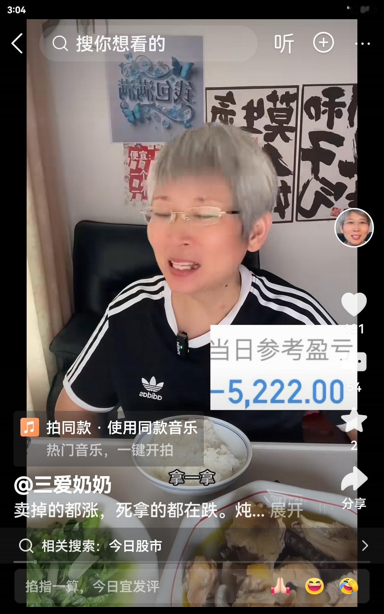 买的股票不涨,卖了就涨,这无疑是每位股民最为苦恼的事情。奶奶今天也是如此,亏了九千多。大家有没有留意到,奶奶身后墙上贴的图是什么意思,有谁能解读一下? 刚看了李大霄中午发布的视频,他提到很多人在狂欢时买入股票,这是否意味着今天该卖出股票而非买入呢?不管怎样,我先试着卖出了一点儿,看看我的理解是否准确。 没有股市交易的日子,正好能让人好好休息,等节后再继续在股市拼搏。祝大家节日快乐!
