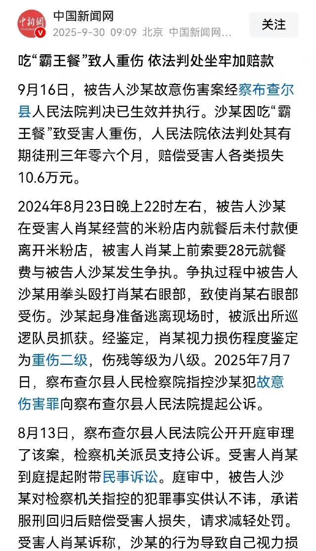 28元引发的血案!新疆察布查尔,沙某去米粉店吃霸王餐,店主肖先生发现后立即追了出去,争执中,沙某朝着肖先生眼睛就是一拳,将肖某打成重伤二级。正当沙某想要逃跑时,巡逻员发现情况将他逮住。 肖先生在察布查尔开了一家米粉店,肖先生为人老实忠厚,做米粉的手艺也不错,周遭很多人都爱时不时去他店里吃一碗米粉。 去年8月23日晚上21点多,沙某进入肖先生的店。沙某点了一碗米粉,又点了瓶酒,一共花了28元。 吃饱喝足后,时间来到22点前后,沙某见肖先生正在后厨忙碌没有注意到他,突然生出了吃霸王餐的想法。 这个想法一冒出来,就再也压不住了,沙某趁肖先生扭头的机会站起来就跑。 肖先生一回头,发现刚刚还在吃饭的沙某不见了,肖先生意识到自己遇到了吃霸王餐的,立即一边往外追一边喊:“哎,你还没给钱呢!” 谁知,沙某听见他在后面喊,跑的更快了。 肖先生非常生气,加快速度追上了沙某,让沙某给28元米粉钱。 沙某觉得自己吃饭不给钱被逮到太没面子,竟然恼羞成怒,辩解称自己忘了,还说肖先生故意找事,不给他面子。 肖先生原本还和颜悦色的,见沙某吃饭不给钱还这么理直气壮,也不再顾及他的颜面,两个人当街吵了起来。 沙某恼怒之下,竟然提起拳头朝着肖先生的眼睛就是一拳。 肖先生眼前一黑,一阵剧痛传来,顿时捂着眼睛哎哟起来。 沙某一看闯祸了,立即起身准备逃离,正好此时巡逻员赶到,成功将他拦了下来。 后经鉴定,肖先生被打的右眼构成了重伤二级,伤残等级为八级。 那么,本案从法律角度应该如何分析?沙某的行为应该如何认定?会受到什么处罚? 1、沙某在米粉店吃饱喝足后,趁店主肖先生在后厨忙碌故意逃单,构成了不当得利。 《民法典》第九百八十五条规定,得利人没有法律根据取得不当利益的,受损失的人可以请求得利人返还取得的利益。 沙某吃饭不给钱的行为,使得肖先生遭受经济损失,肖先生有权要求沙某支付这28元餐费。 肖先生追上沙某要求他支付餐费时,沙某不仅不承认,还辩解称自己忘了,甚至反咬一口说肖先生故意找事。 沙某的这种行为属于无理狡辩,进一步侵害了肖先生的合法权益,沙某的主观恶意逐渐暴露。 2、沙某恼怒之下打伤肖先生的眼睛,导致肖先生右眼重伤二级、伤残等级八级,这一行为构成故意伤害罪。 《刑法》第二百三十四条规定,故意伤害他人身体的,致人重伤的,处三年以上十年以下有期徒刑。 沙某故意伤害肖先生的身体,并造成如此严重的后果,必须承担相应的刑事责任。 对于肖先生而言,他不仅遭受了身体上的巨大痛苦,还面临着后续的治疗和生活困难。 肖先生有权依据法律规定,在刑事诉讼过程中提起附带民事诉讼,要求沙某赔偿医疗费、误工费、残疾赔偿金等相关经济损失。 《刑事诉讼法》第一百零一条规定,被害人由于被告人的犯罪行为而遭受物质损失的,在刑事诉讼过程中,有权提起附带民事诉讼。 今年7月7日,沙某因涉嫌故意伤害罪被提起公诉。 8月13日,本案公开审理,肖先生提起刑事附带民事诉讼。 肖先生提出,沙某的行为导致自己视力受损,今后生活都将受到影响,沙某应该承担全部责任,赔偿自己医疗费、误工费、伤残赔偿金等,共计38万。 经审理认为,沙某吃饭不给钱,肖先生在正常索要饭钱时,遭到沙某殴打并导致肖先生重伤,沙某构成故意伤害罪。 因沙某到案后供认不讳,承诺服刑出来后赔偿肖先生索赔,酌情判处沙某有期徒刑3年6个月。 因为伤残赔偿金不在刑事附带民事诉讼范围之内,对于肖先生索要的25.7万元伤残赔偿金不予支持,扣除其他不合理赔偿,判沙某赔偿肖先生各项损失10.6万元。 有人说,肖先生一只眼睛只换了10.6万太亏了,应该另外起诉,要求沙某赔偿伤残赔偿金。 对此,您怎么看? 来源:中国新闻网9.30日报道
