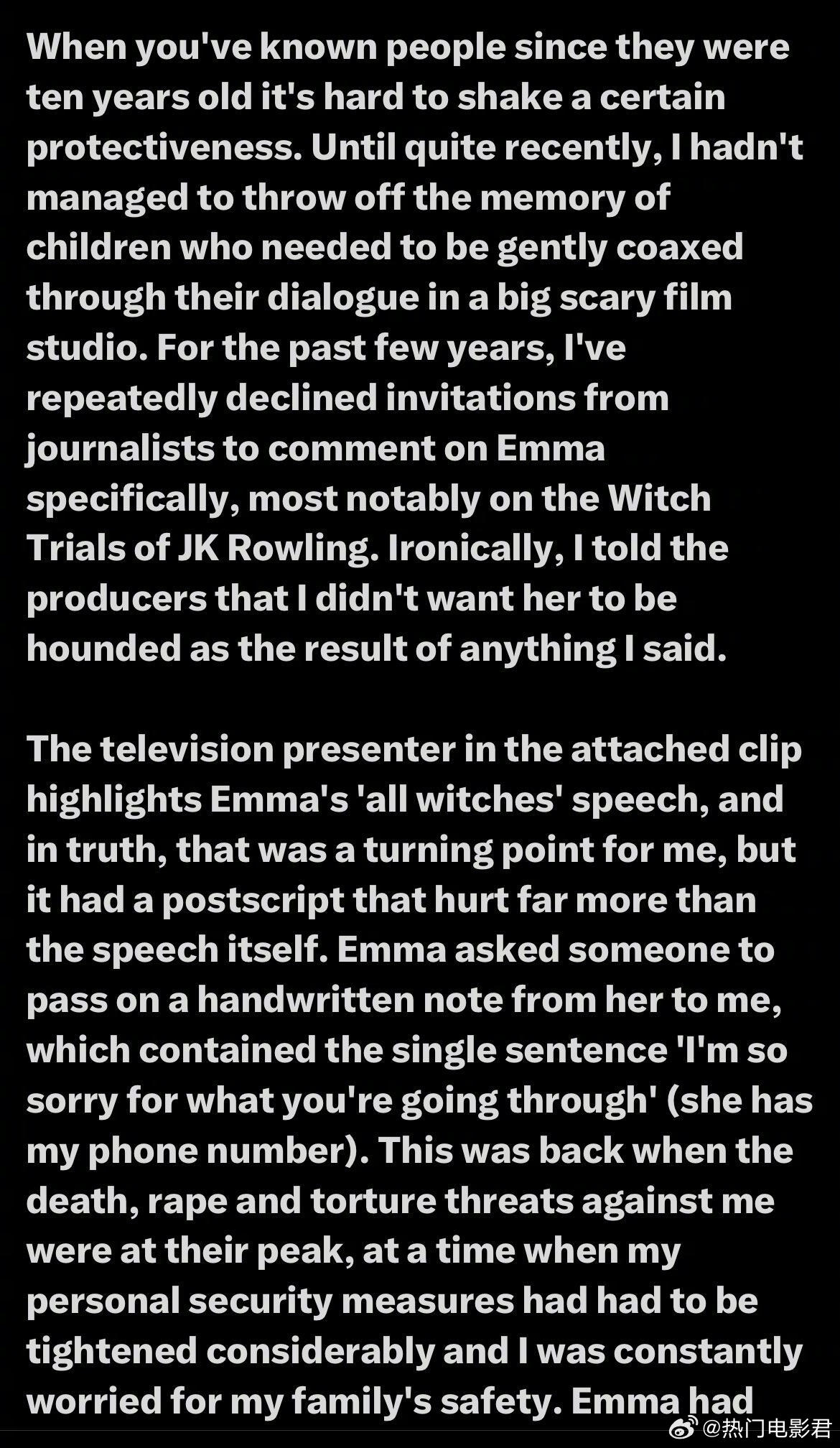 指出艾玛和丹·雷德克里夫在多年后仍以“哈利波特代言人”身份公开批评她的观点。