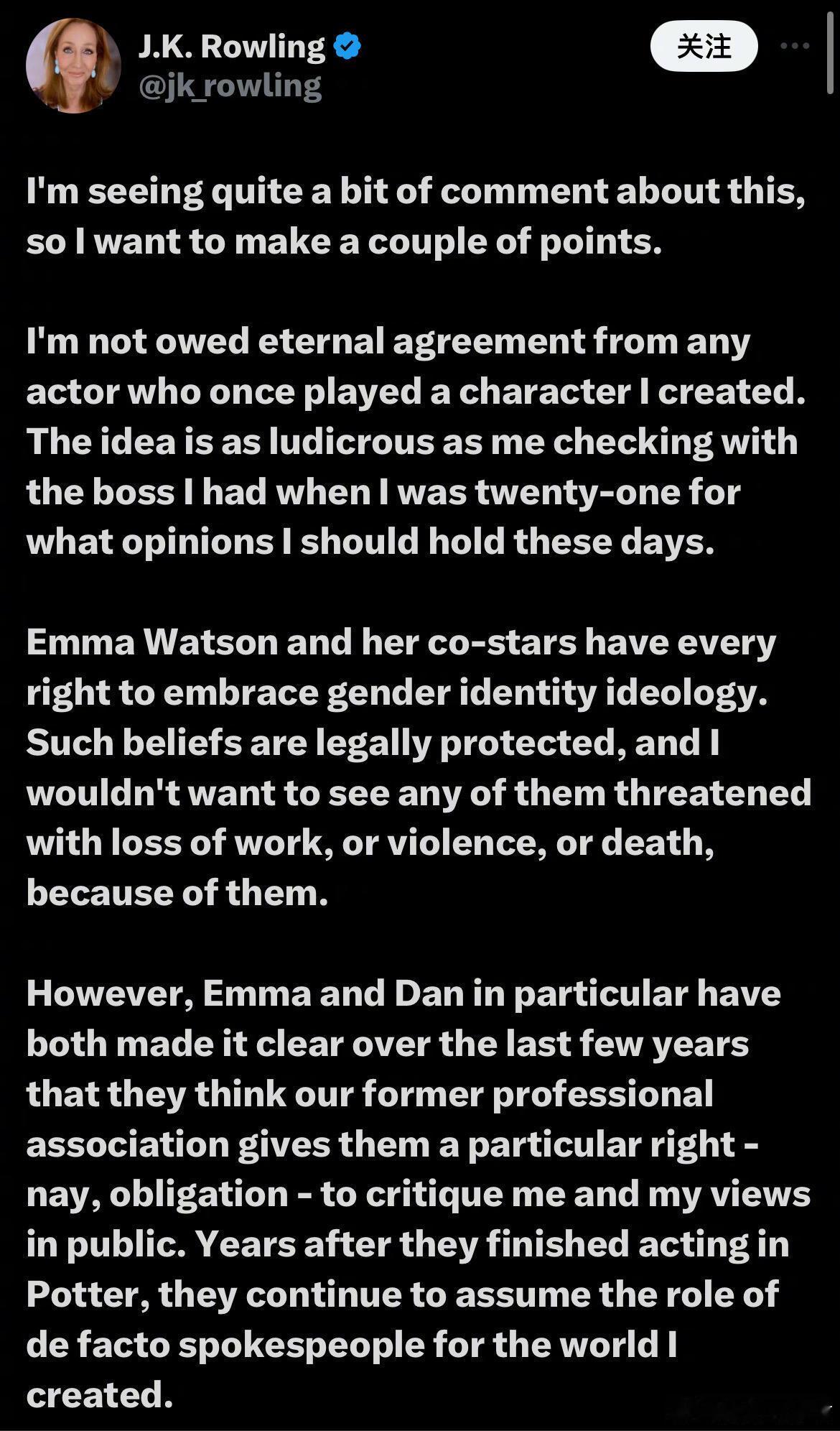 罗琳强调自己没有义务对曾扮演她笔下角色的演员保持永久认可或支持。