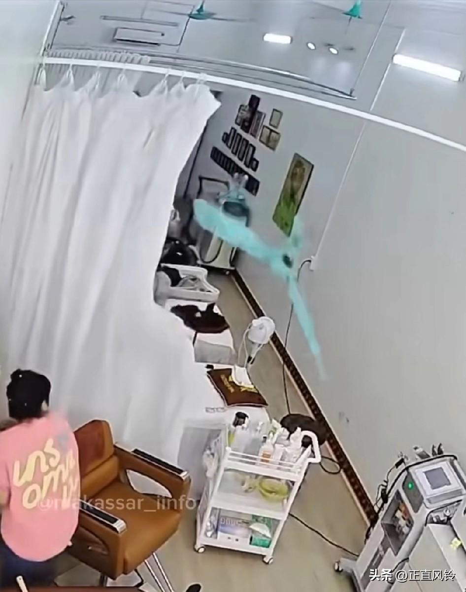 美容院只顾自己跑,还好躺着的人也看到,马上起身躲掉了,这电风扇整个砸下来 美容差一揪揪变成了毁容,风扇应该没插保险丝!所以掉下来了。为什么不叫客户走开,还好客户是争开眼睛,自己看到危险了。这东西本身就不应该问世,之前看见抖音还有个做好大的,简直就是250的老板会选择这东西