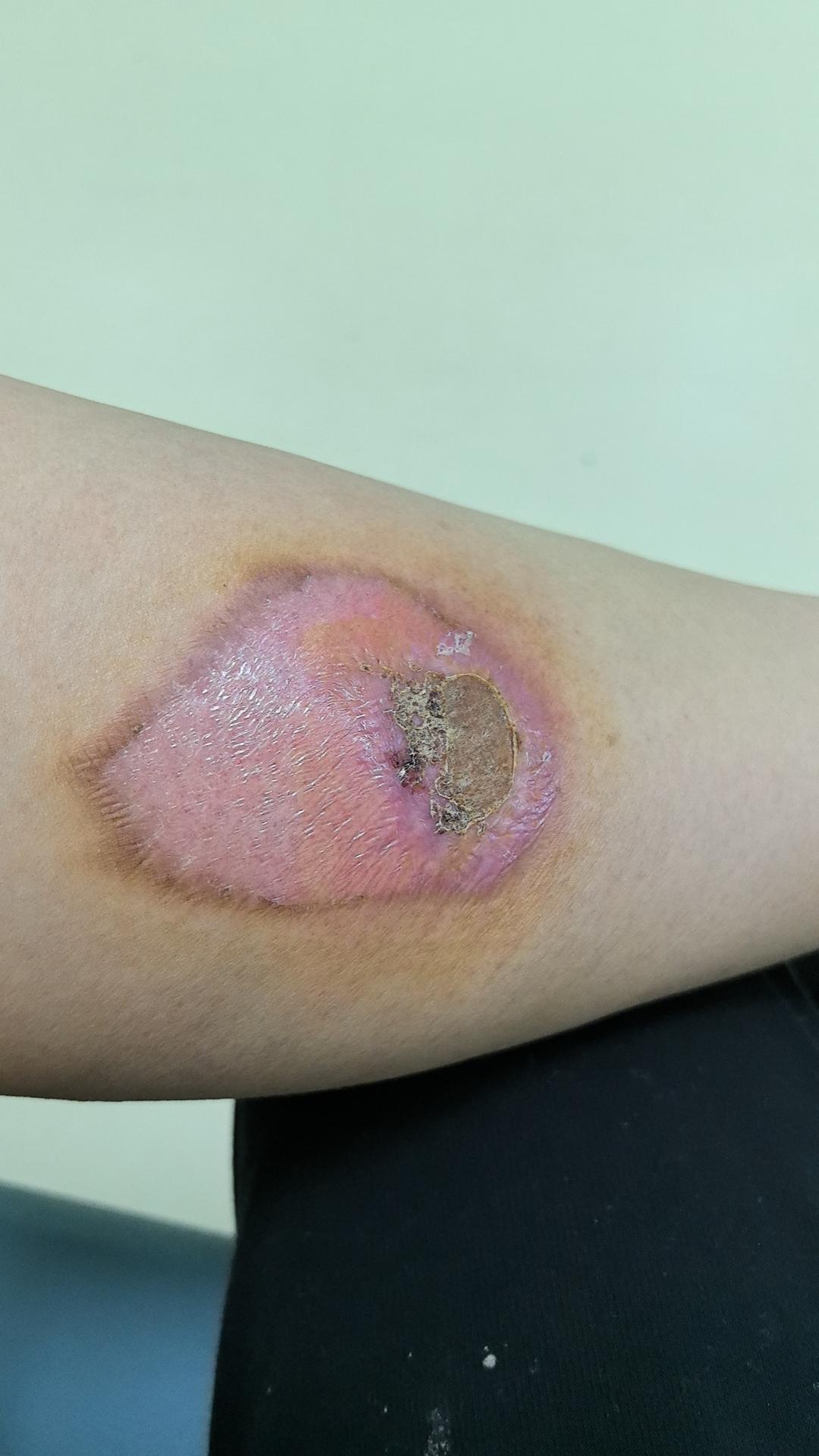 烫伤一直不好不能拖尽早上医院 哎,倒霉起来喝凉水都塞牙。十几天前烧开水被蒸汽烫伤,我还得瑟自己处理的很及时。 为啥得瑟,因为工作原因,我脱产学过急救培训课,会处理突发事件的急救,加上自己也感兴趣,处理过几次突发情况。 谁知道此次烫伤会这么严重呢?有一位友友提醒蒸汽烫的是硬伤,我还不以为意。 最近这块肌肉是越来越疼了,今天实在是疼的忍不住了,去了中医院,医生告知,皮下组织肌肉感染了,要把结的痂掀掉,再处理。 要命啊,结痂,差点疼昏过去。最后擦了中医院的去腐生肌膏,明天继续……上刑。 再次告诫友友们,别学我自以为是哈,要看医生。 表扬一下中医院,第一次知道今天挂的号,可以管三天呢!真好!