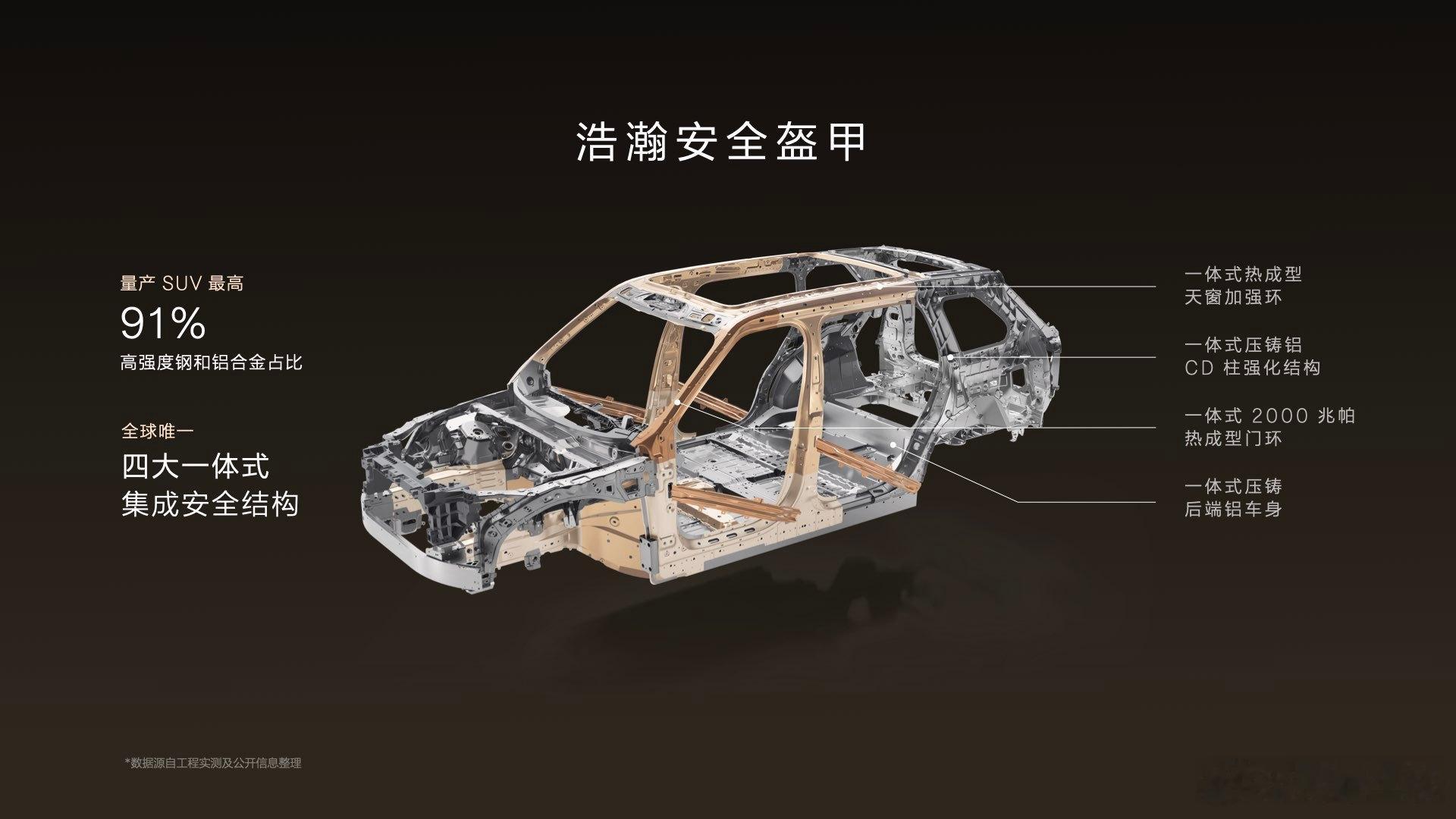 极氪9X车身采用91%高强度钢与铝合金,搭载“四大一体式集成安全结构”,车身扭转刚度达同级最强41600N·m/deg,并通过行业首个单车四向连环极限碰撞测试。