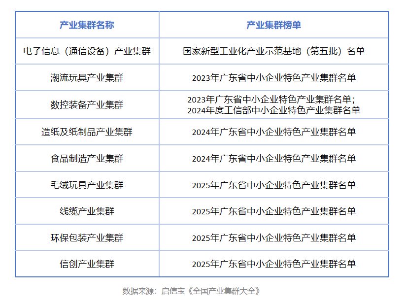 东莞的产业生态网络由专业化程度高、分工明确的镇街构成。据启信宝数据,东莞已形成多领域、多层次的重点产业集群布局。其中,电子信息产业集群入选国家新型工业化产业示范基地(第五批)名单;自2023年起,潮流玩具、数控装备、造纸及纸制品、食品制造、毛绒玩具、线缆、环保包装、信创等8个产业陆续入选广东省中小企业特色产业集群名单,仅2025年就有4个产业入选。这些集群认定时间连贯且领域细分,反映出东莞产业的活力。