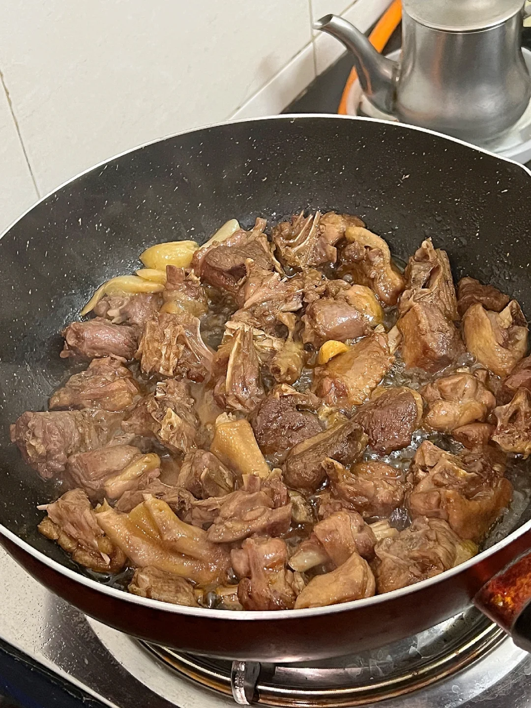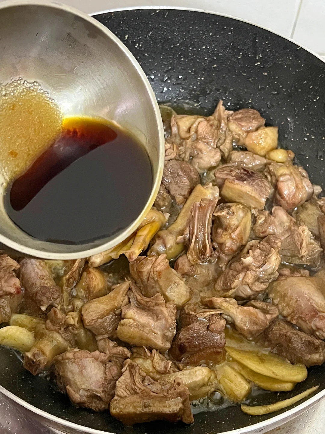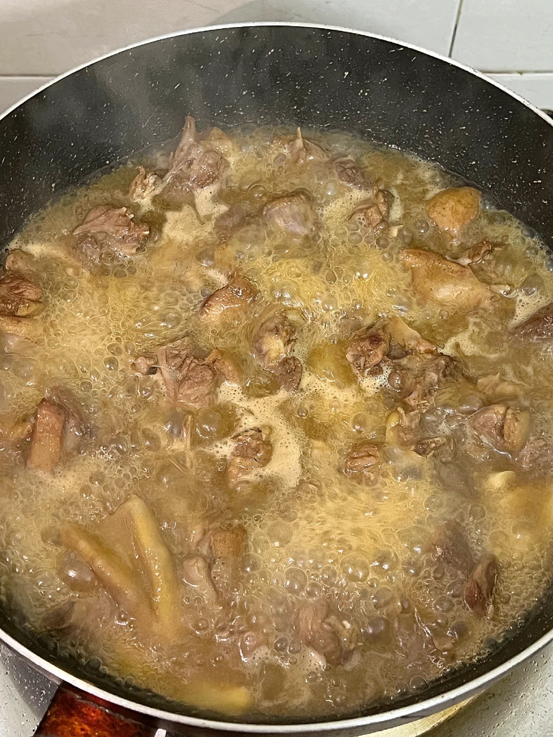 👉🏻倒入酱汁和温水没过一大半食材,先大火!煮沸,再转小火焖煮,中途翻炒一下避免粘锅