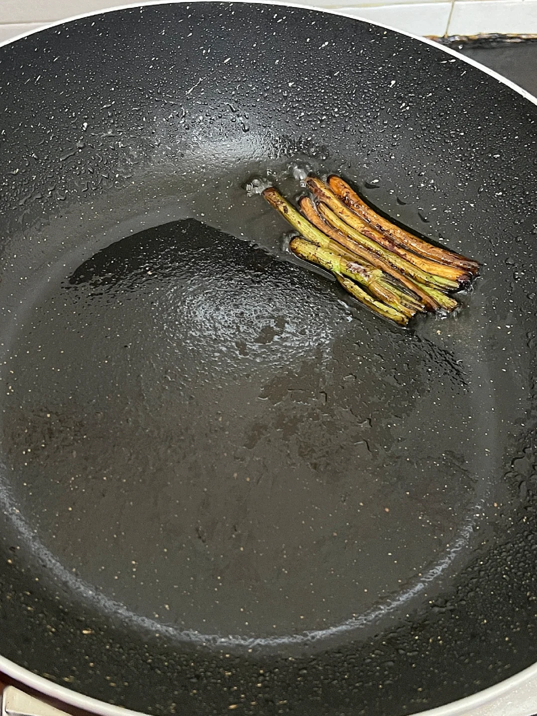 👉🏻小火少油!将葱白段煎至焦黄,煎出浓郁的葱油香味,就可以把葱白捞出丢掉,放入鸭肉