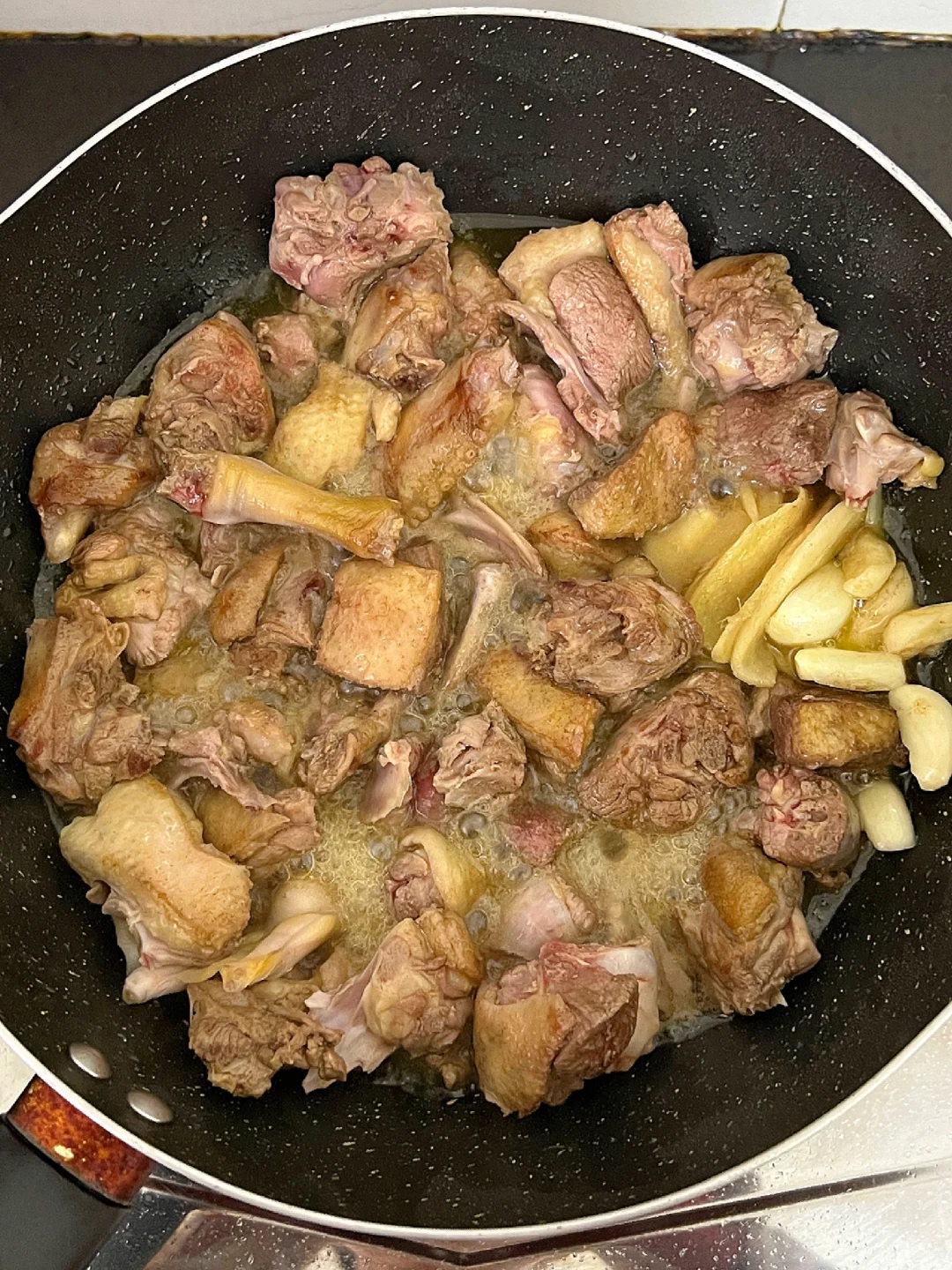 👉🏻当鸭肉煎出较多鸭油后,扒拉出空位,放入姜片蒜粒泡油中炸出蒜香味!再翻炒均匀