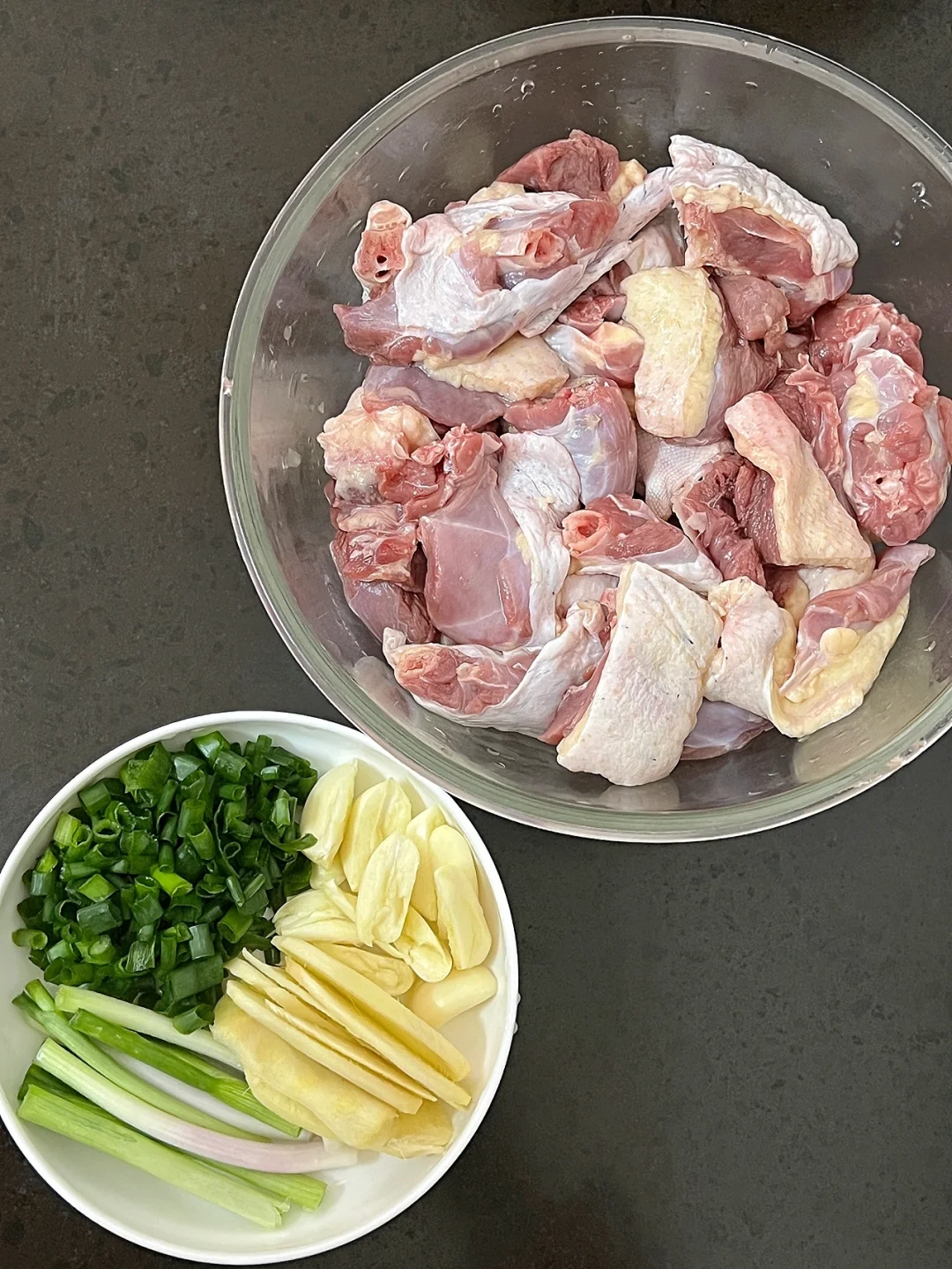 🛒食材:半只鸭肉、姜片、蒜粒、葱白段葱花