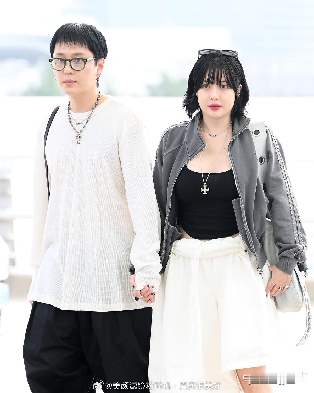 #泫雅龙俊亨牵手比心#30日,泫雅和老公龙俊亨现身机场出发新加坡,两人从现身到走