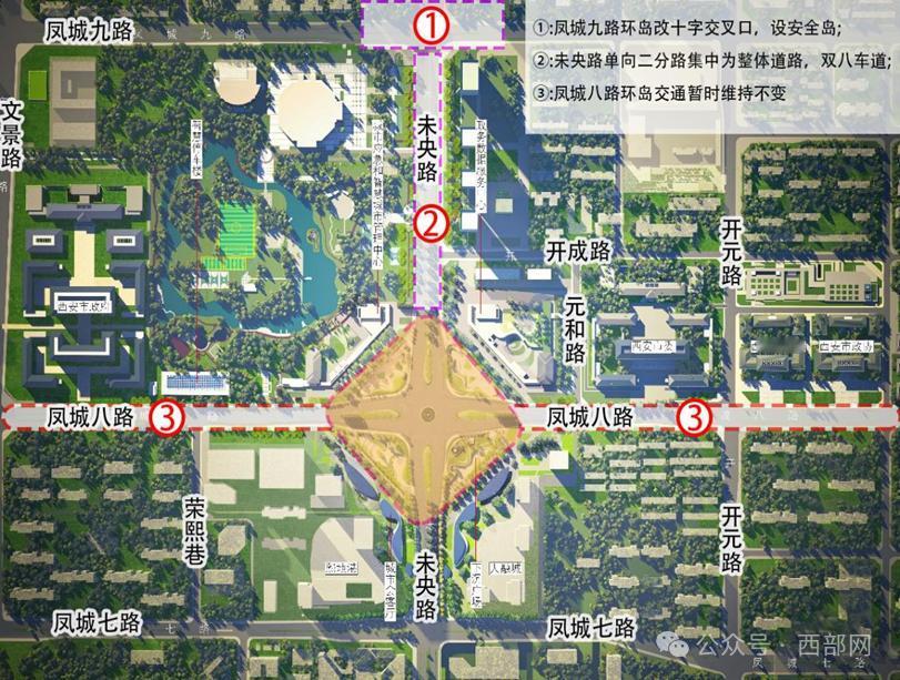 城北张家堡片区更新首个道路改造工程完成,未央路凤城八路-凤城九路段10月1日零时通车放行,原分离式道路合并为整体双向八车道,环岛公园迁移至道路两侧,凤城九路十字交叉口启用信号灯控制。