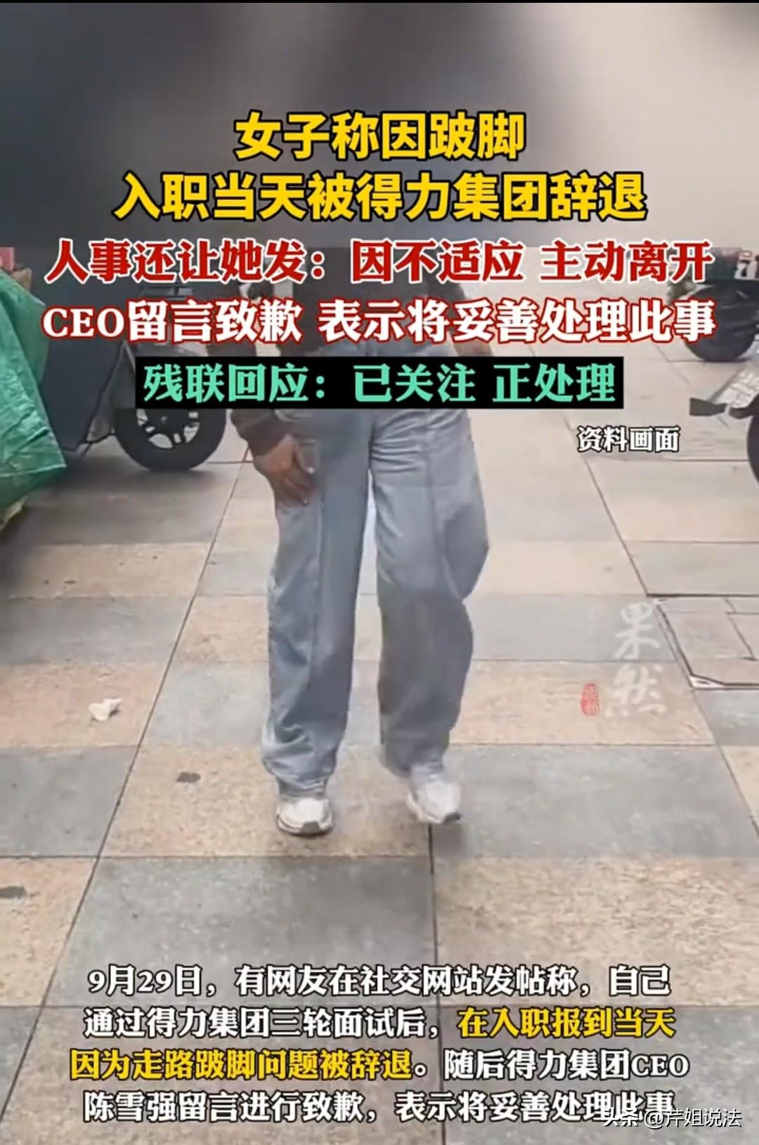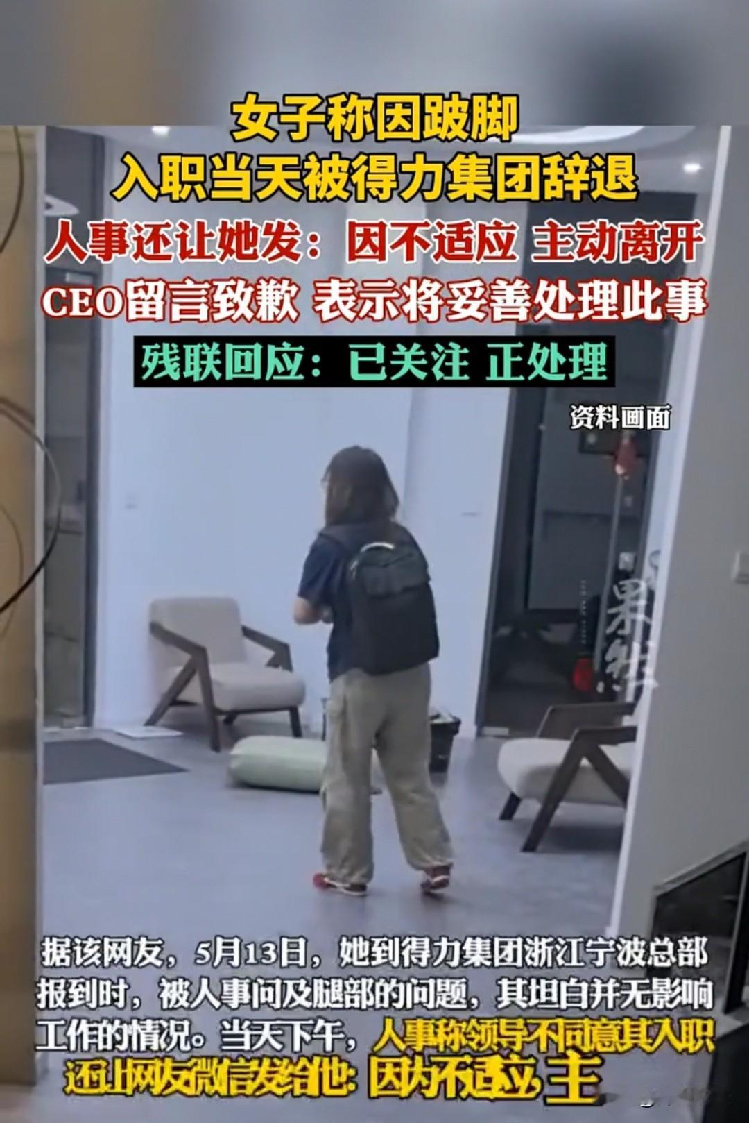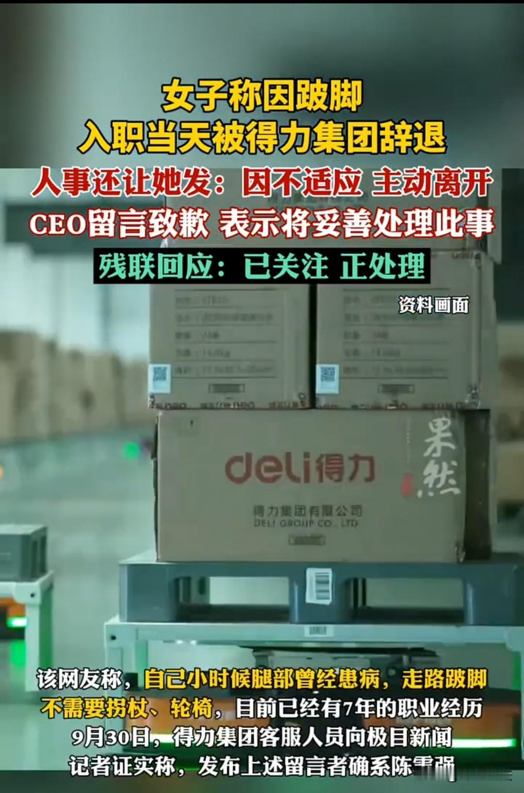 “都应聘成功了,凭什么因为脚跛就要我主动离职?”浙江,女子的脚有点跛,她通过三次面试,到总部报到,结果被人事部告知领导不同意,并且让她自己发信息过来,说明是主动离职的。几个月后,她想勇敢地把这件事说出来,表示自己还是有点介意的,谁知道公司的CEO直接出来赔礼道歉,并且声称会马上调查此事,还女子一个公道。 素材来源于:大象新闻9月30日报道。 女子在5月13日的时候就去得力集团总部报到。 这个机会可是来之不易呀,她通过了两轮的线上面试、一轮的线下面试,终于打败了很多竞争对手,被集团看中,让她到总部去报到了。 她非常高兴,觉得自己终于获得了梦寐以求的工作,也不枉自己辛苦了这么久,打拼了这么久,用七年的职业生涯作为奠定基础,获得了这份来之不易的工作。 她拖着行李箱来到了总部,人事部门的工作人员接待了她,并且带她到楼上的宿舍坐下。 不过,工作人员发现,女子走路怎么有点跛呢?当时不好问,觉得有损别人的人格,于是憋着硬是没有说出口。 可是回去后总觉得事情不妥,自己是管人事的,这招来的人如果给公司丢脸了,到时候领导怪罪下来,自己工作不保呀。 因此,他思前想后,又给女子打电话,让她下楼来,带她四处转转,让她熟悉熟悉环境。 女子得到了这样的青睐,觉得公司的人文太好了,赶紧收拾一番,急急忙忙就下了楼。 转了一会儿,人事找个机会终于开口了,说:“你腿我看有点不方便,是怎么回事呢?” 人事是想确定这是天生的,还是临时磕碰导致的。 女子也没有回避,说这是小时候留下的后遗症,不过声称自己不会影响工作,之前就有七年的工作经历,老板对她的工作能力都很认可,还几次升职,让人事的工作人员放心,她绝对不会因为这个影响自己的工作。 工作人员的脸突然阴沉了一点,不知道怎么办,脑袋里不断地在思索该如何处理。 在他看来,一家500强的企业怎么可能应聘一个脚有问题的员工呢? 之前还期望这是临时磕碰导致的,现在实锤了,就是女子天生落下的毛病,这可不能留啊,留下来这就是自己工作失误。 最后,他觉得事情应该尽快处理,就和颜悦色地告诉女子,他们可没有这样的先例,要不女子主动辞职好不好? 女子心中突然一阵酸楚,但又想极力地保住这份工作,就让工作人员:“要不你问问领导呢?万一领导不介意呢,再加上自己的能力,确实可以胜任的。” 工作人员答应了,跑到不远处去打电话了,最后回来的答案还是一样的,说领导不同意,不好意思。 并且他提出了一个有点过分的要求:“我们加个微信,你再发一个‘不适应这里的工作环境,主动离职’的信息,行不行?” 女子显然不愿意,这个岗位是自己争取了多久才获得的呀,哪有让自己说不干就不干的呀,自己有多想干最清楚了,怎么能违背自己的内心说这样的话呀。 工作人员向她诉苦,说自己的劳动合同马上就要续签了,如果这个事情办不好的话,可能就要被解聘,“你就体谅体谅我的难处好吗?你反正都还没有进来,重新找行不行?” 女子觉得很无赖,虽然自己不舍,虽然觉得他们做法不好,但是别人不要自己,何必要留在此处呢?就按照对方的要求做了。 回去后,她闷闷不乐了一段时间,不过生活还在继续,她又重整旗鼓,开始了新一轮的找工作。 不过之前看到有其他公司辞退残疾人,她心中的委屈又爆发起来了,所以在9月29日的时候,她就说出了心中的不舒服,谈论了自己在5月份遭遇的同样经历。 你还别说,她这篇发文很快就被得力集团的CEO看到了,可能是他们公司有人专门会查看网上关于他们公司的评论吧。 看到后,CEO马上做出了反应,对女子赔礼道歉了,并且承诺马上调查此事,给女子一个公道。 这样看来,如果事情属实,如果女子确实能胜任这份工作,有可能会重新上岗哦。 记者也联系到了公司的客服,对方证实确有此事,赔礼道歉的人不是别人,正是他们的CEO。 网友们得知后,大大地点赞,说公司知错能改,有担当,有格局。 那么,公司调查后情况属实,女子还有没有机会回去工作呢? 根据《就业促进法》第二十九条规定,国家保障残疾人的劳动权利,用人单位招用人员,不得歧视残疾人。 从法律的角度来说,女子当然可以回去上班。她是通过三轮面试才竞聘到这个岗位的,不可能因为脚跛就被辞退,这属于就业歧视,辞退行为不合法。 这种情况下,女子完全可以要求继续履行劳动合同。 不过,据相关报道,女子明确表示不愿意再回去入职。得力集团CEO也回应称,总裁办主任已经和女子建立直接联系,正在沟通中。 另外,当初让女子主动辞职的同事肯定会受到处理——对方只想保住自己的工作,就去损害女子的权益,缺乏担当,公司大概率会考量他的职业态度及能力问题。 对于此事,大家如何看?
