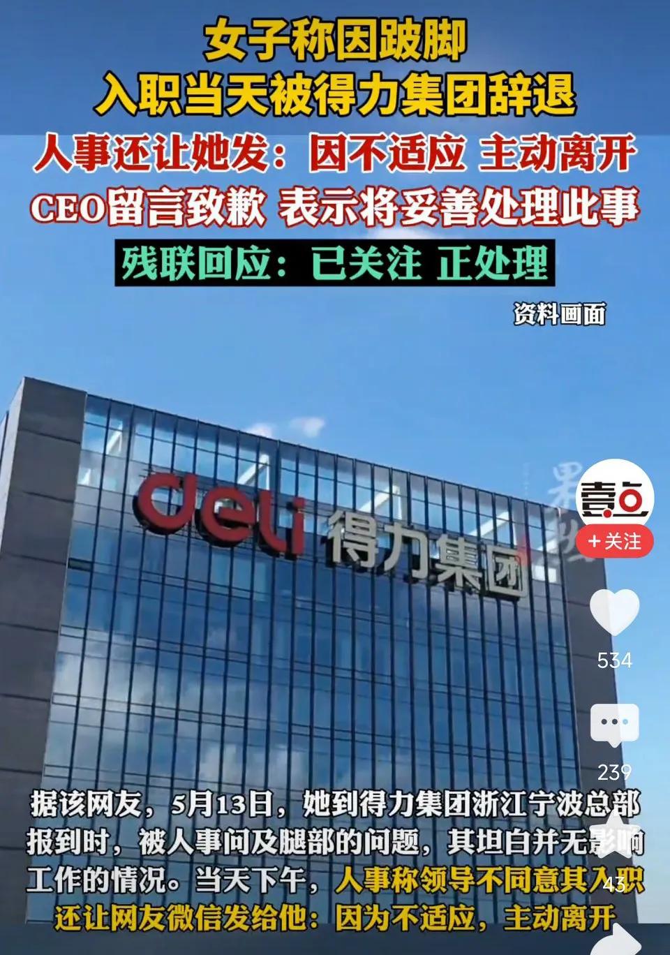 女子称因跛脚,入职当天被得力集团辞退!人事还让她发:因不适应主动离开。CEO留言