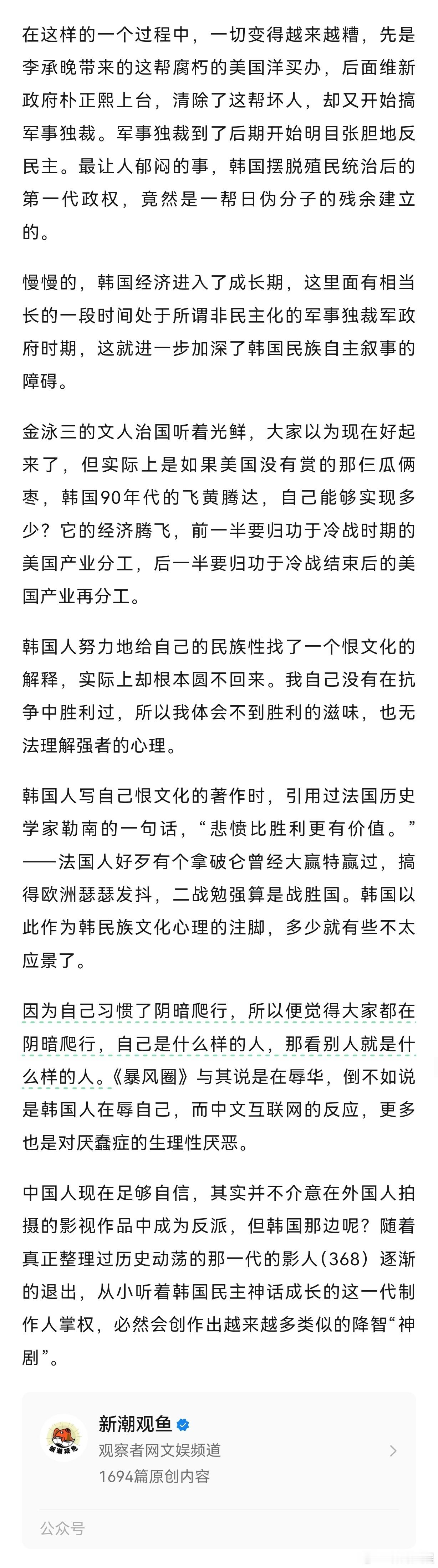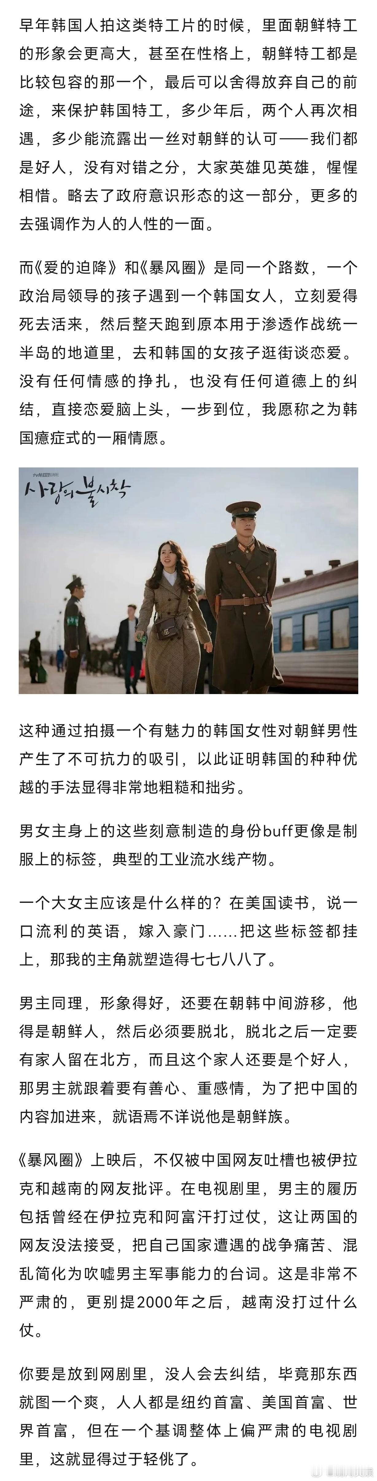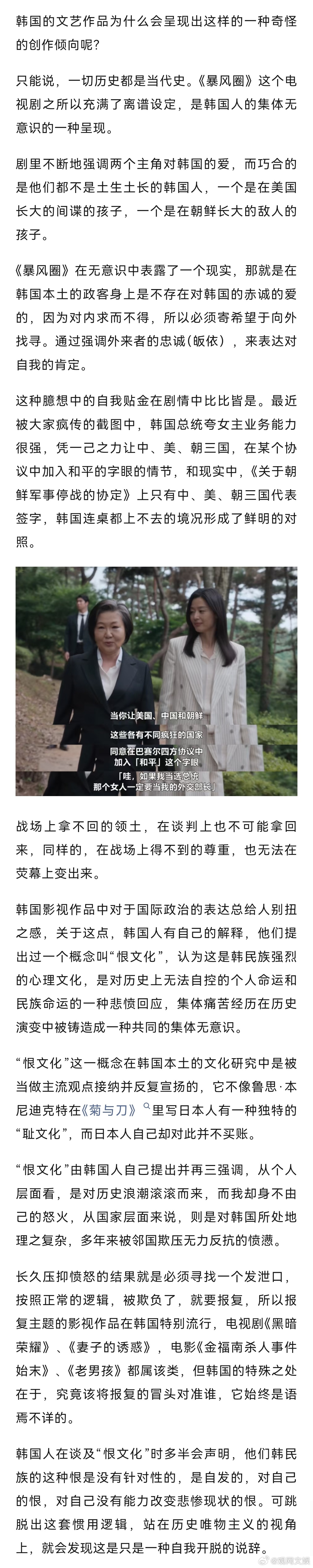 【被批辱华的《暴风圈》,揭开了韩国可悲又内耗的恨文化】暴风圈揭开韩国可悲又内耗的恨文化《暴风圈》上映后,不仅被中国网友吐槽也被伊拉克和越南的网友批评。在电视剧里,男主的履历包括曾经在伊拉克和阿富汗打过仗,这让两国的网友没法接受,把自己国家遭遇的战争痛苦、混乱简化为吹嘘男主军事能力的台词。这是非常不严肃的,更别提2000年之后,越南没打过什么仗。